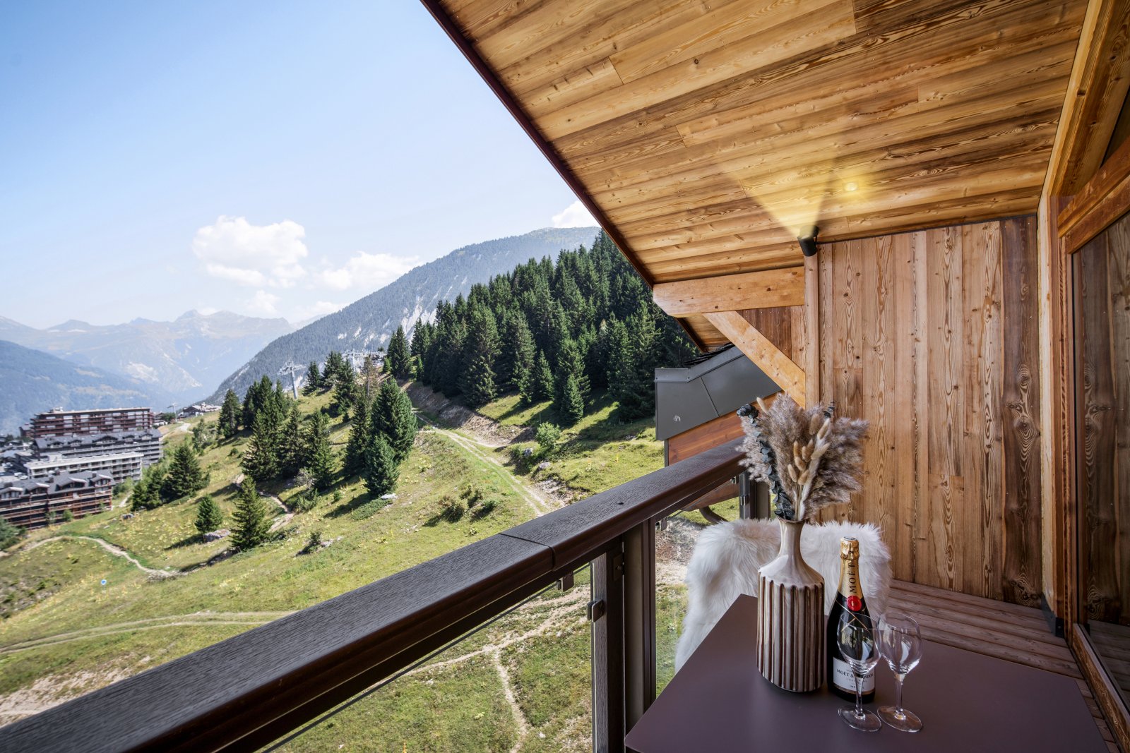 Private Balconies: Astral offers a private balcony for relaxing moments with mountain vistas, while Céleste’s expansive, covered balcony includes an outdoor lounge and dining space, ideal for sunny breakfasts or après-ski drinks amidst pine-covered slopes.