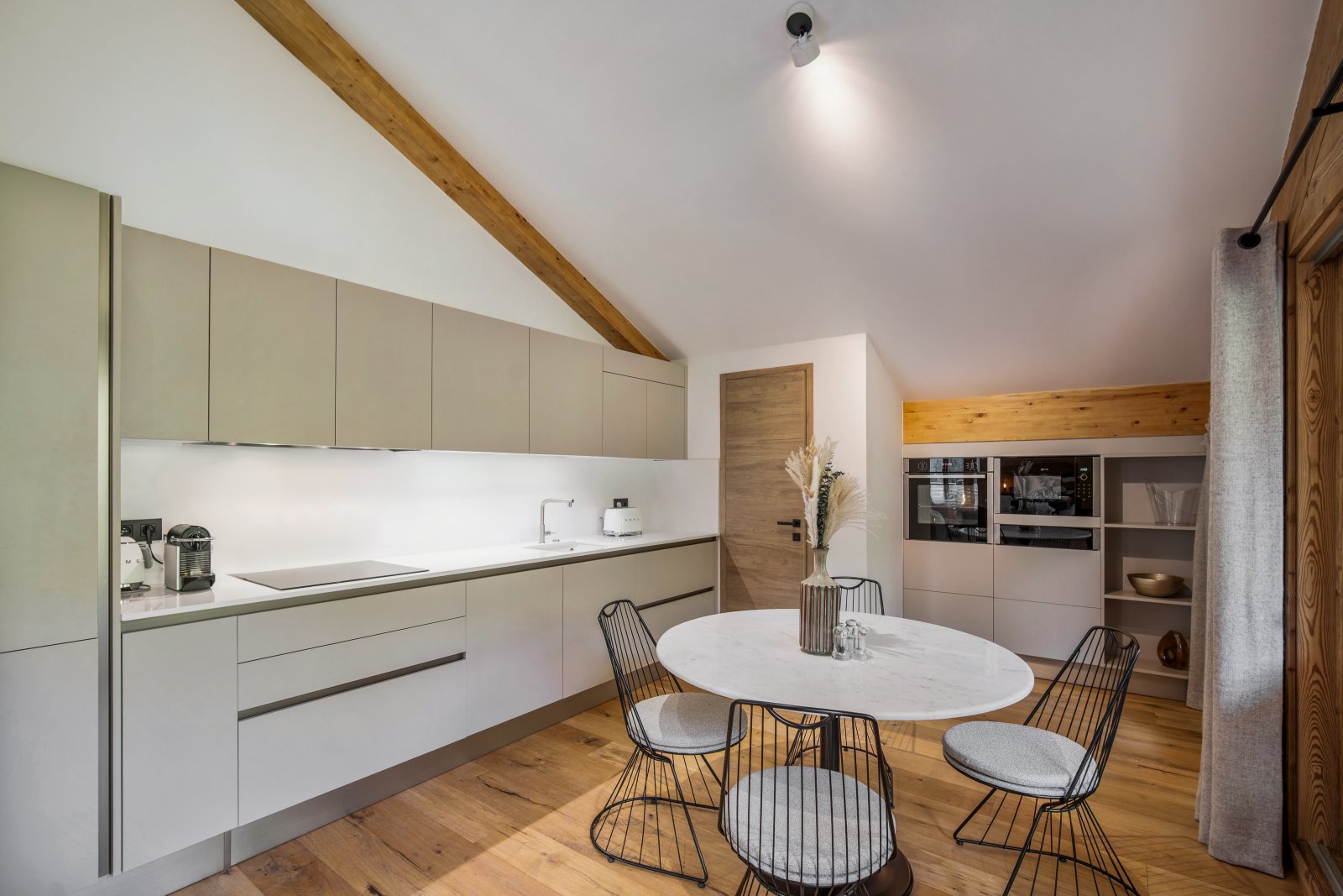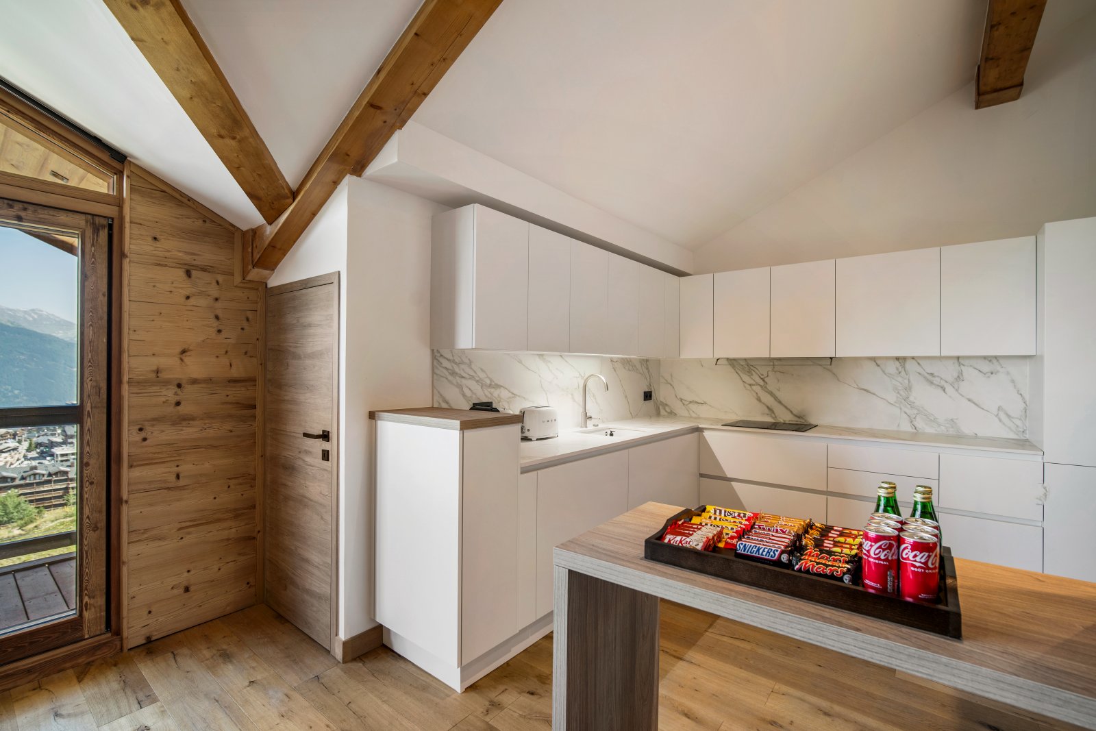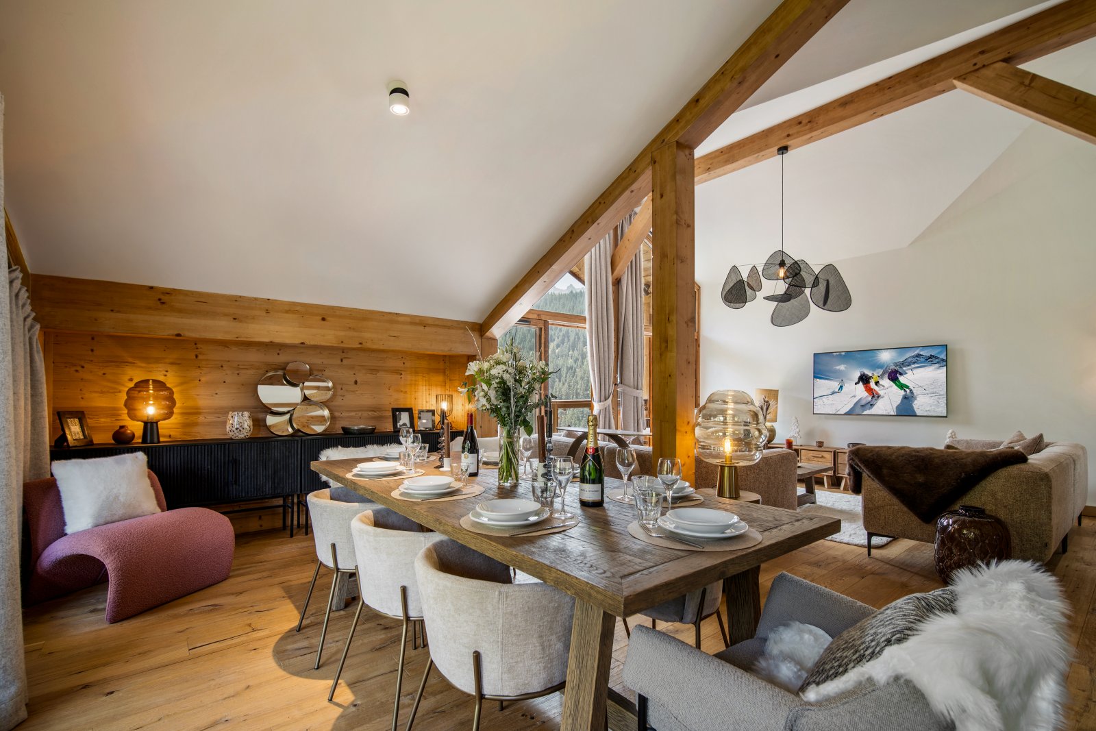 Each penthouse includes a fully equipped gourmet kitchen with a Nespresso coffee machine, raclette grill, toaster, oven, microwave, induction stove, quality cookware, cutlery, wine glasses, and all dining essentials. Large dining tables in both penthouses are perfect for shared alpine feasts with stunning mountain views.
