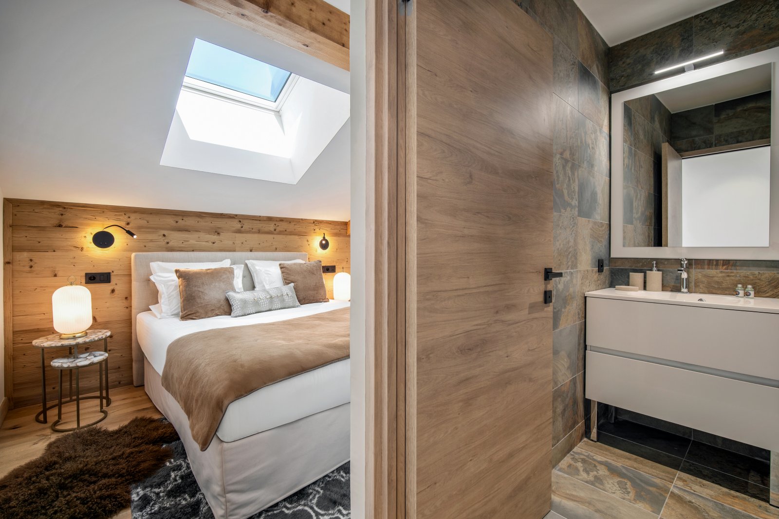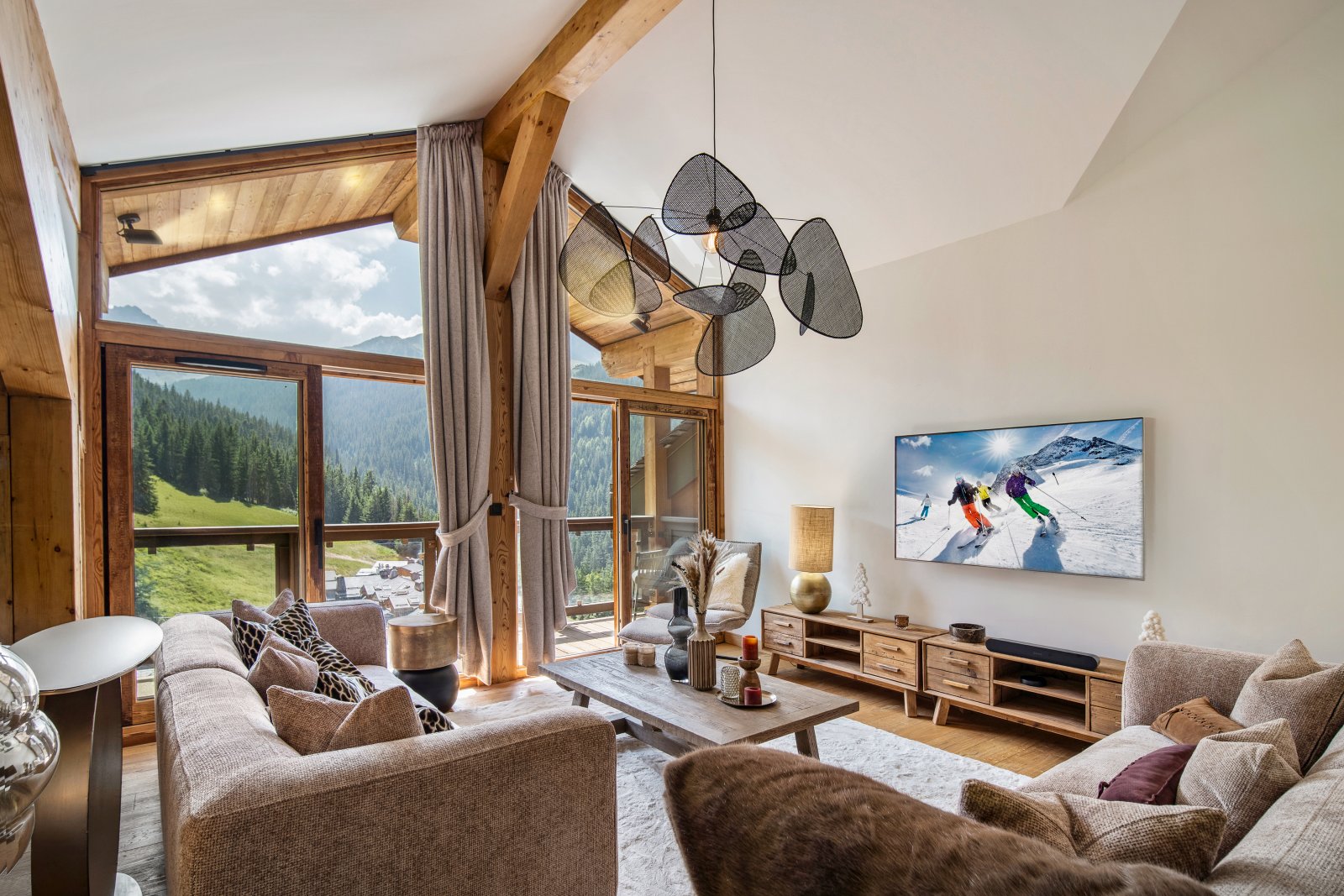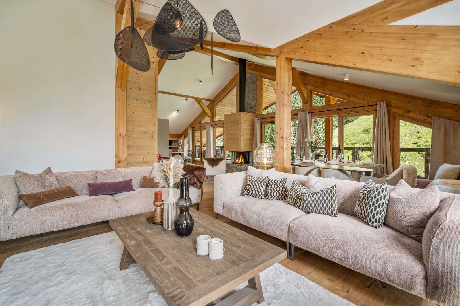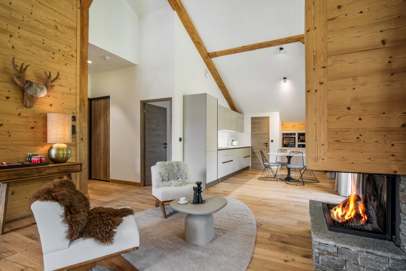 The heart of this retreat lies in its two spacious, sunlit living areas, each with floor-to-ceiling windows showcasing spectacular views of the French Alps. Astral’s open-concept living room features designer furnishings, ambient lighting, and a warm alpine feel, while Céleste’s living area boasts high cathedral ceilings, exposed wooden beams, and a contemporary fireplace for added warmth and character. Both spaces create the perfect ambiance for cozy evenings or lively gatherings.