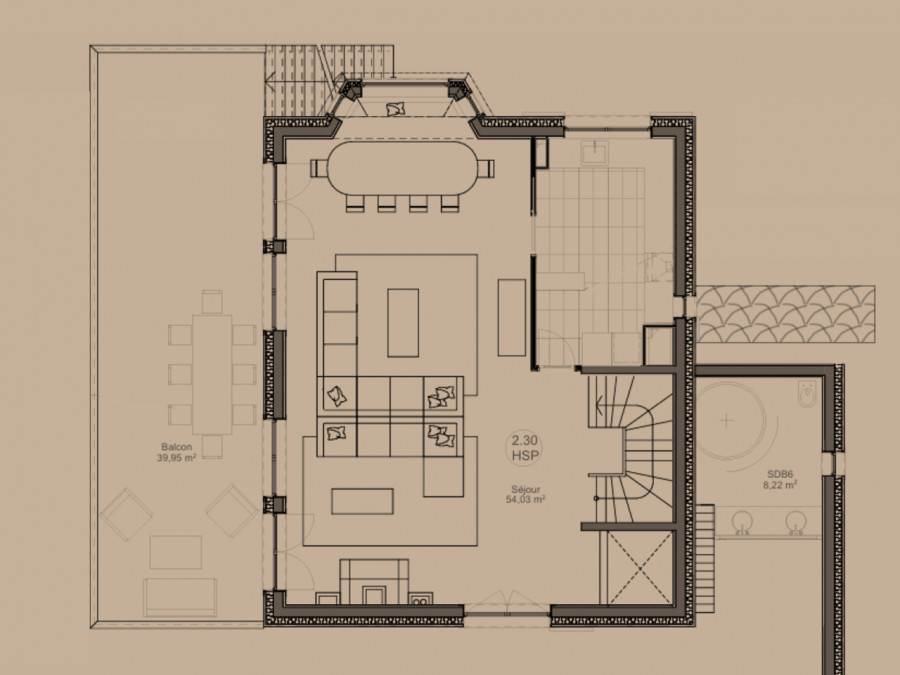 Robust craftsmanship and natural materials give the lodge a warm, inviting atmosphere. Neutral and soft tones were chosen to highlight the surrounding landscape and the generous volumes of the interiors. Bespoke, handcrafted furniture combined with iconic design pieces enhances the feeling of comfort and refined elegance.