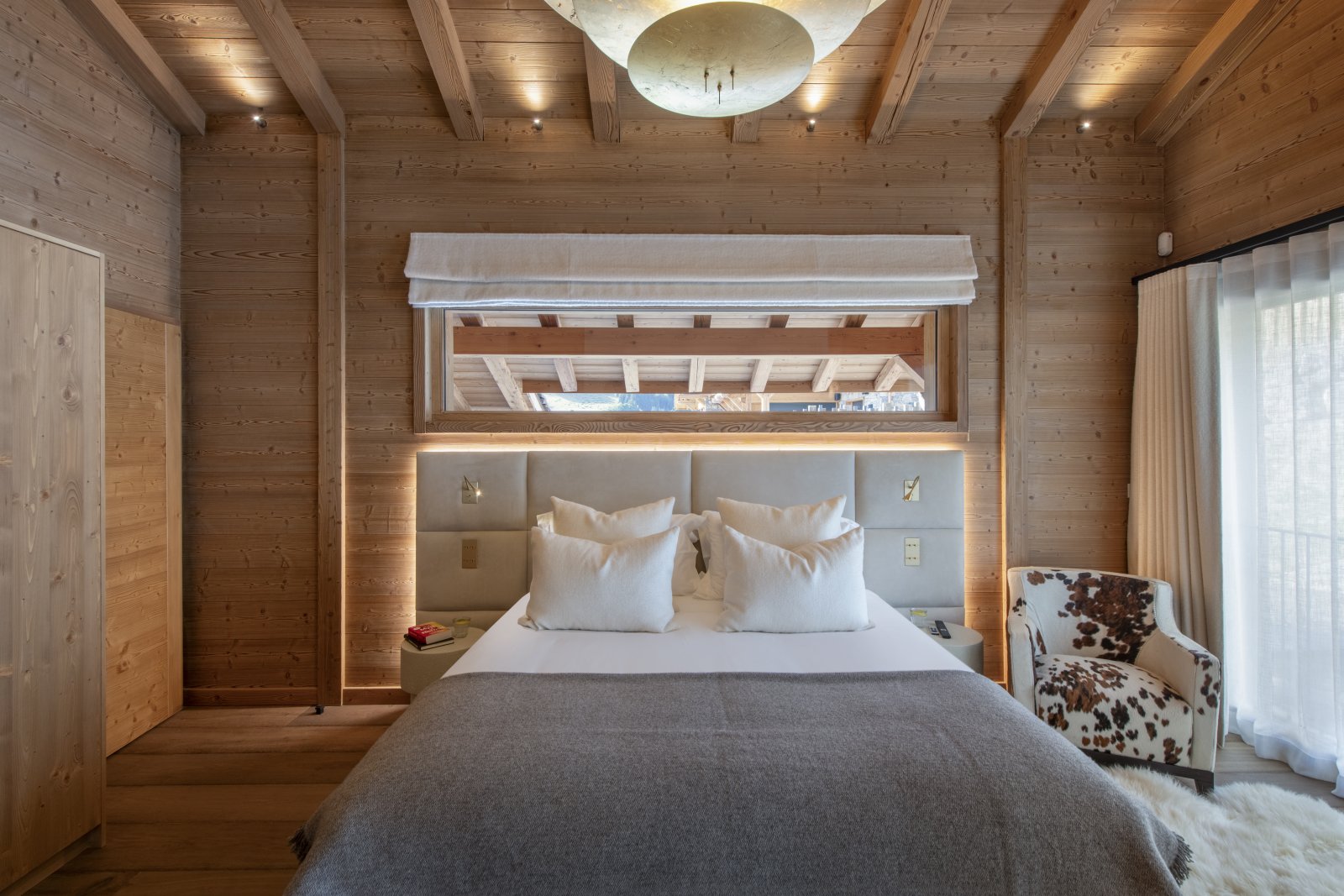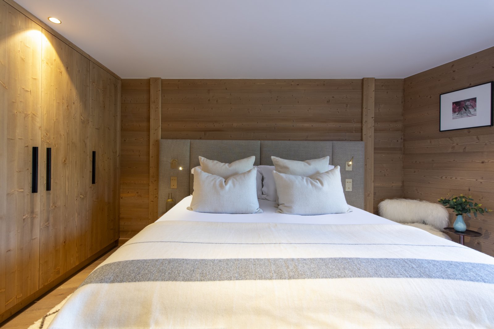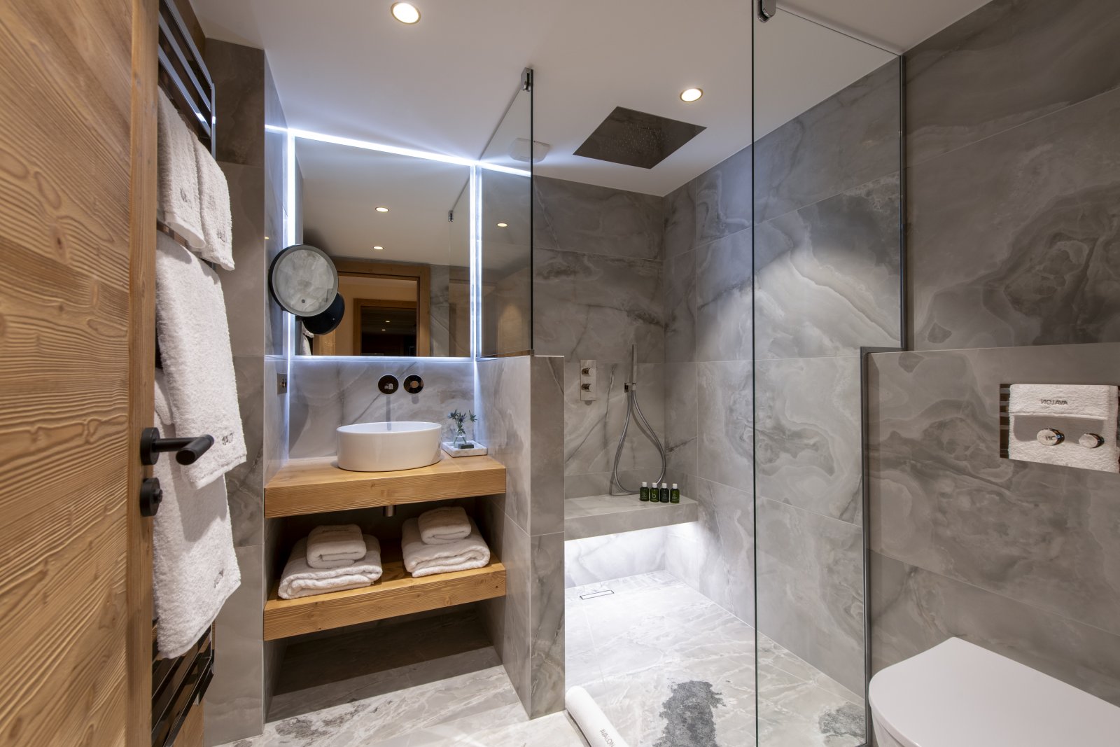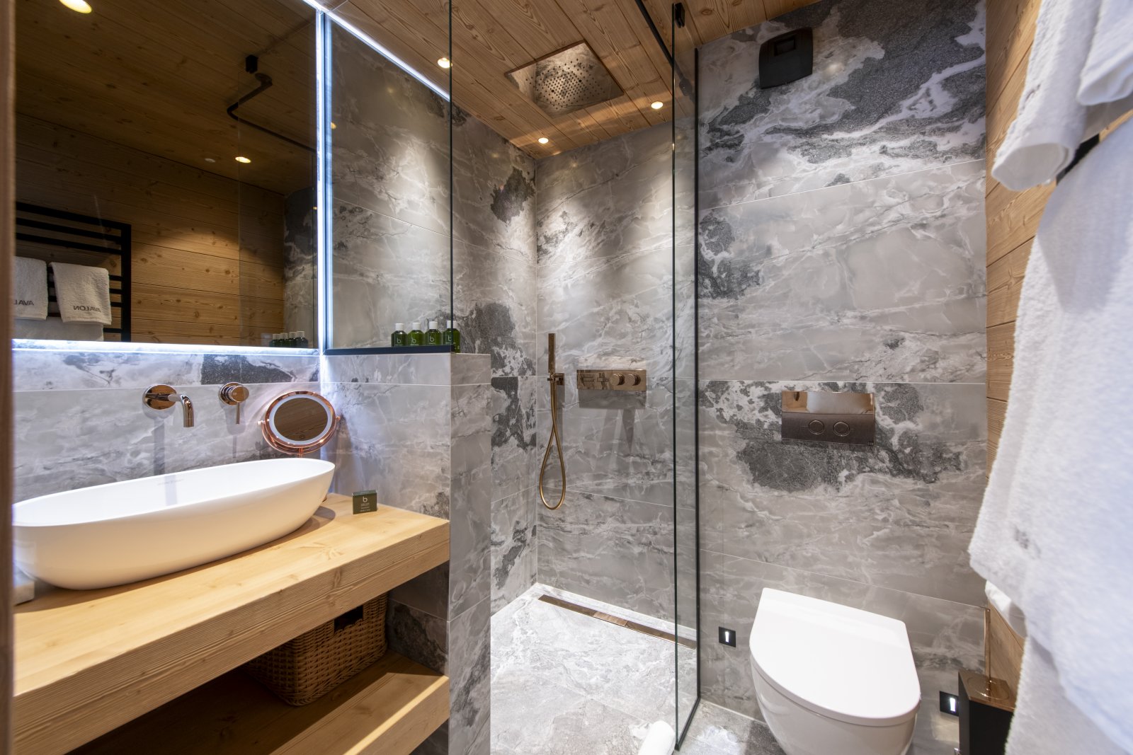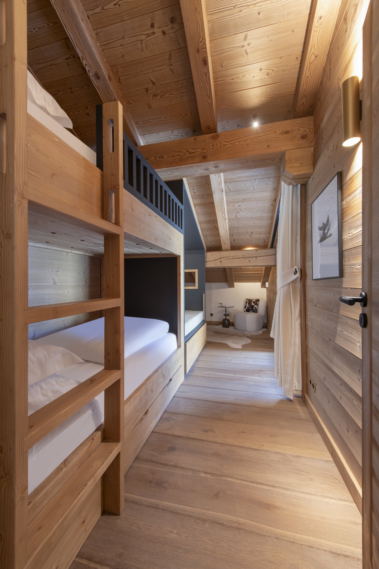In total there are 6 bedrooms allowing the chalet to sleep up to 12 people. The master suite, as you would expect, is an indulgent affair. Set on the first floor it enjoys the best of the views and also features a luxurious en-suite. Next to this there is a second versatile suite which can either be accessed from the main chalet as a guest bedroom, or by an independent entrance. The layout has been made in this way for guests travelling with staff, allowing them to integrate with your family in a discreet and convenient manner, whilst also giving them their own space and privacy when they are not working. There are a further two regular rooms on the lower ground level, as well as two bunk rooms which are suitable for use by both children or adults meaning the chalet will suit a wide range of groups. Five of the six rooms are en-suite, with only the smaller of the bunk rooms on the top floor sharing facilities with one of the two main suites.