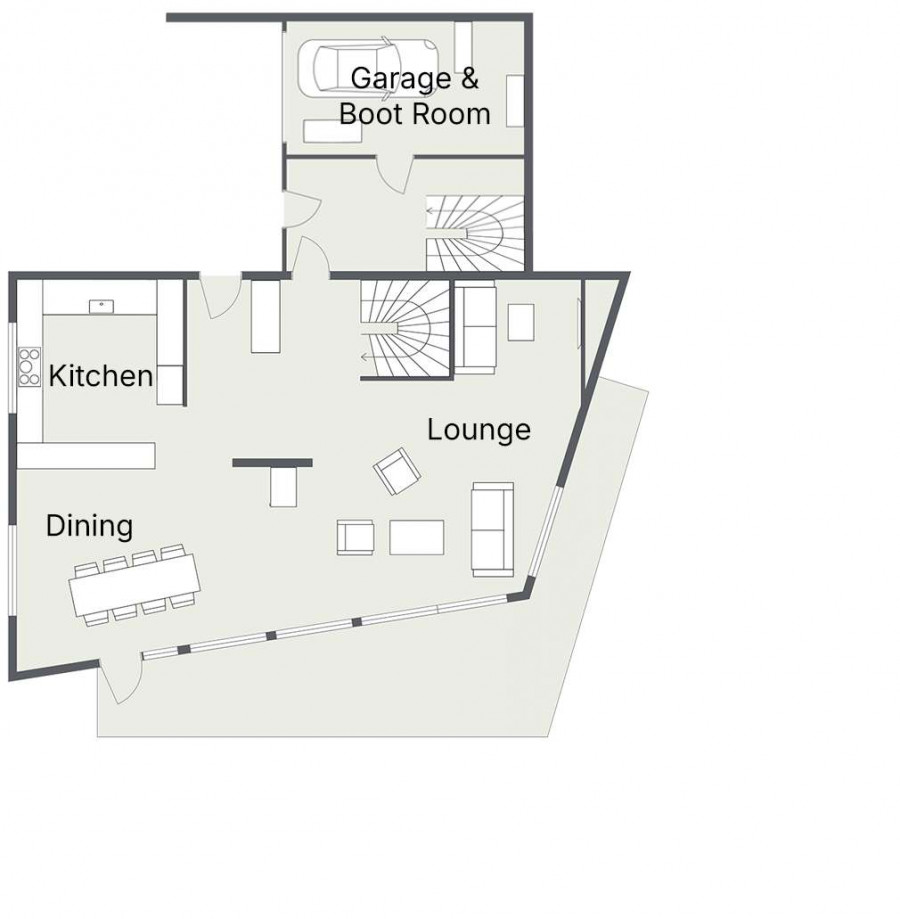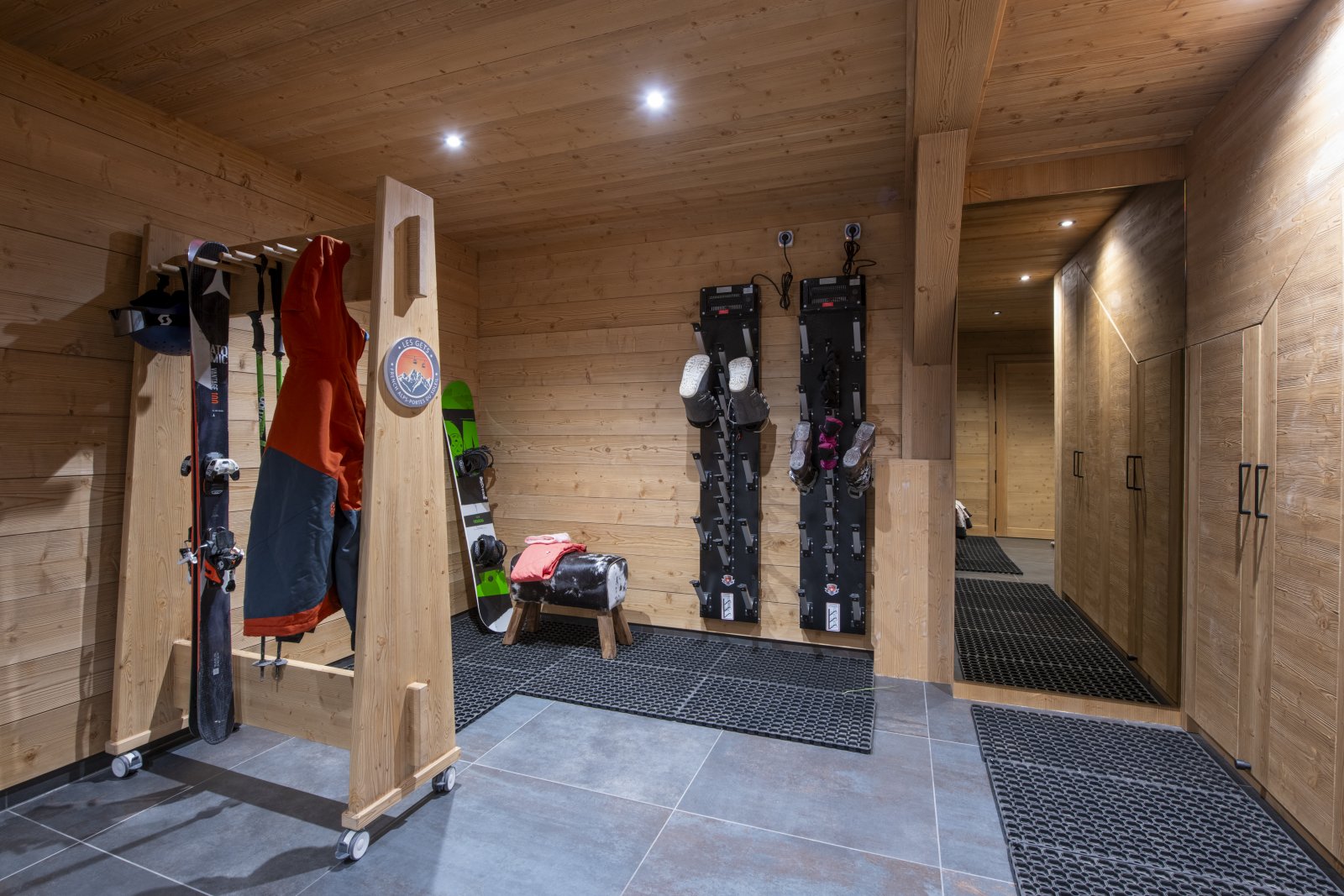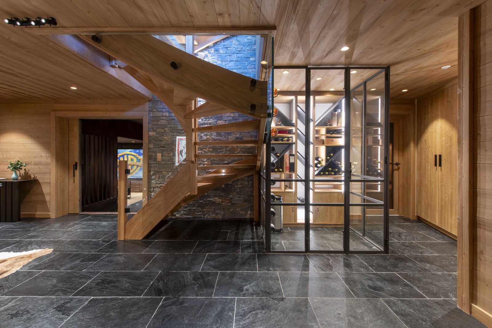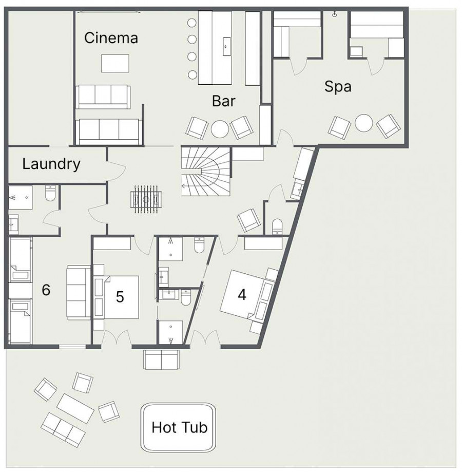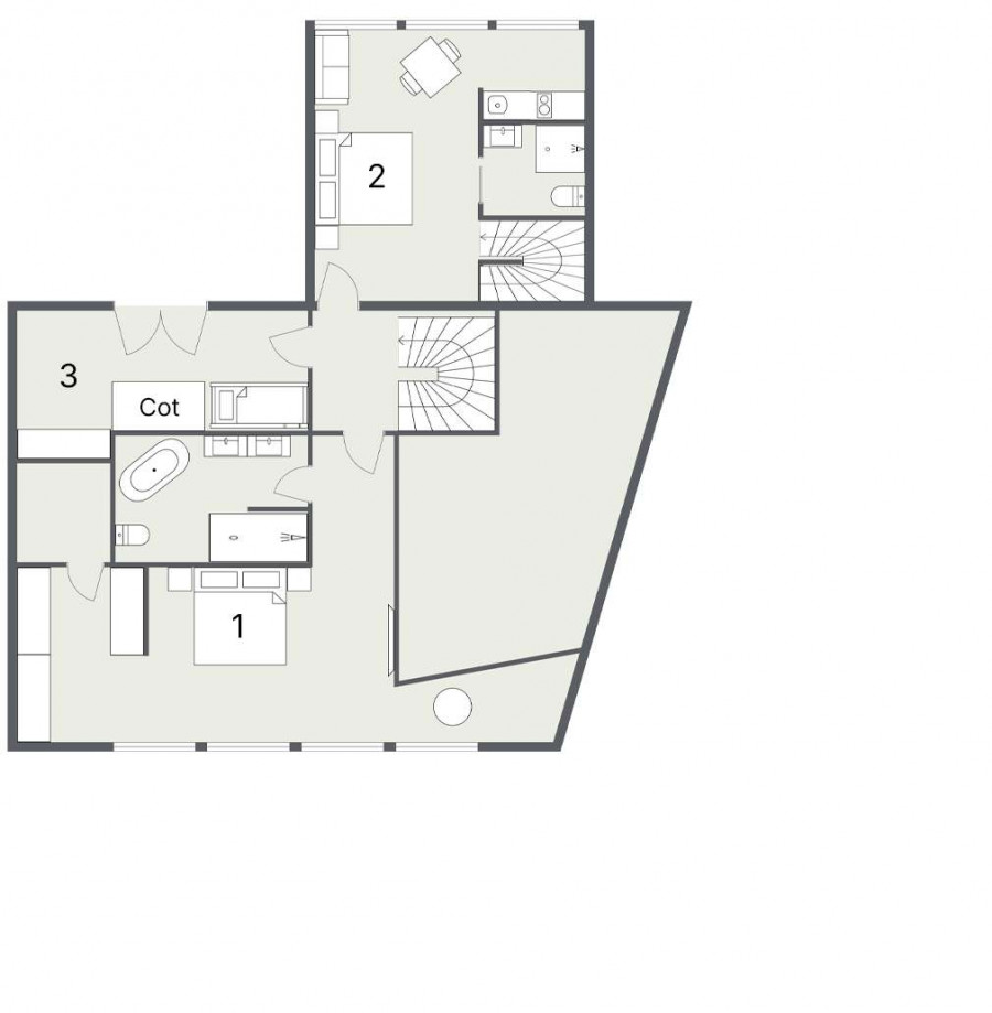 In total there are 6 bedrooms allowing the chalet to sleep up to 12 people. The master suite, as you would expect, is an indulgent affair. Set on the first floor it enjoys the best of the views and also features a luxurious en-suite. Next to this there is a second versatile suite which can either be accessed from the main chalet as a guest bedroom, or by an independent entrance. The layout has been made in this way for guests travelling with staff, allowing them to integrate with your family in a discreet and convenient manner, whilst also giving them their own space and privacy when they are not working. There are a further two regular rooms on the lower ground level, as well as two bunk rooms which are suitable for use by both children or adults meaning the chalet will suit a wide range of groups. Five of the six rooms are en-suite, with only the smaller of the bunk rooms on the top floor sharing facilities with one of the two main suites.