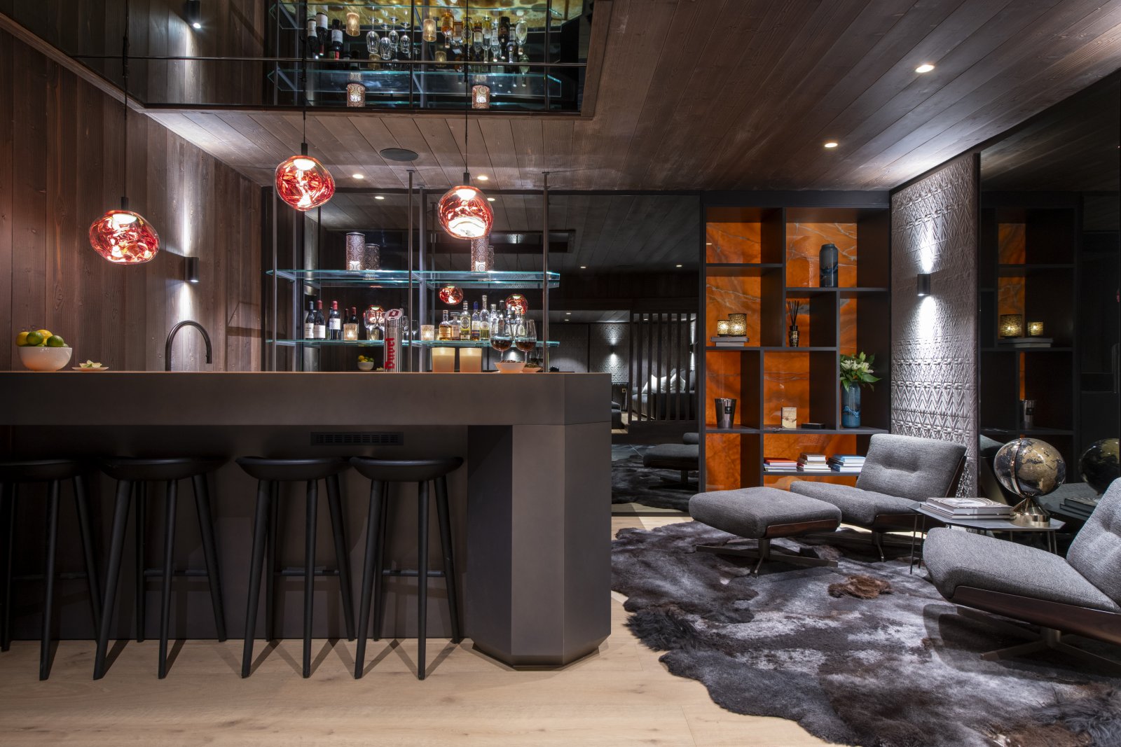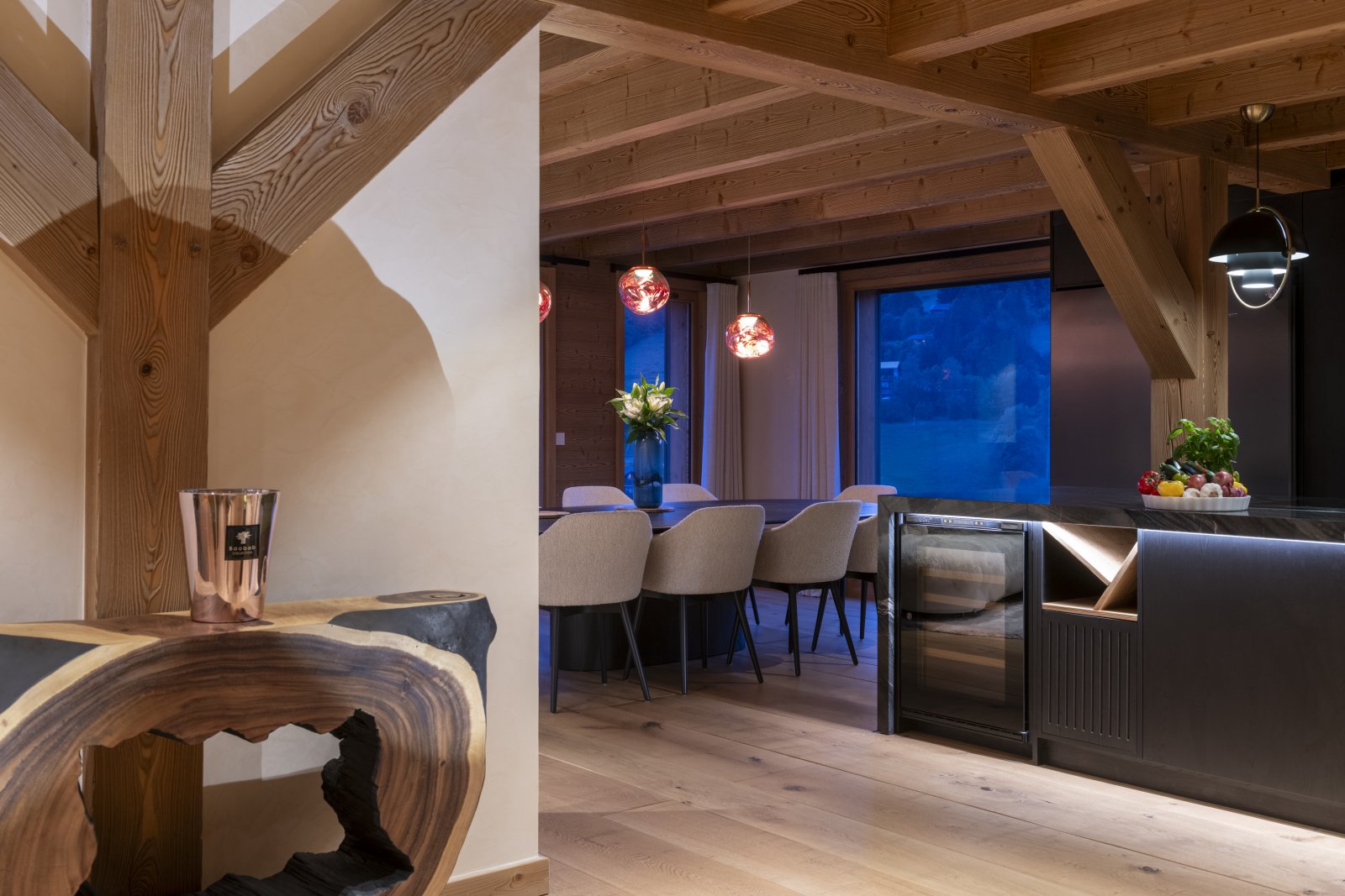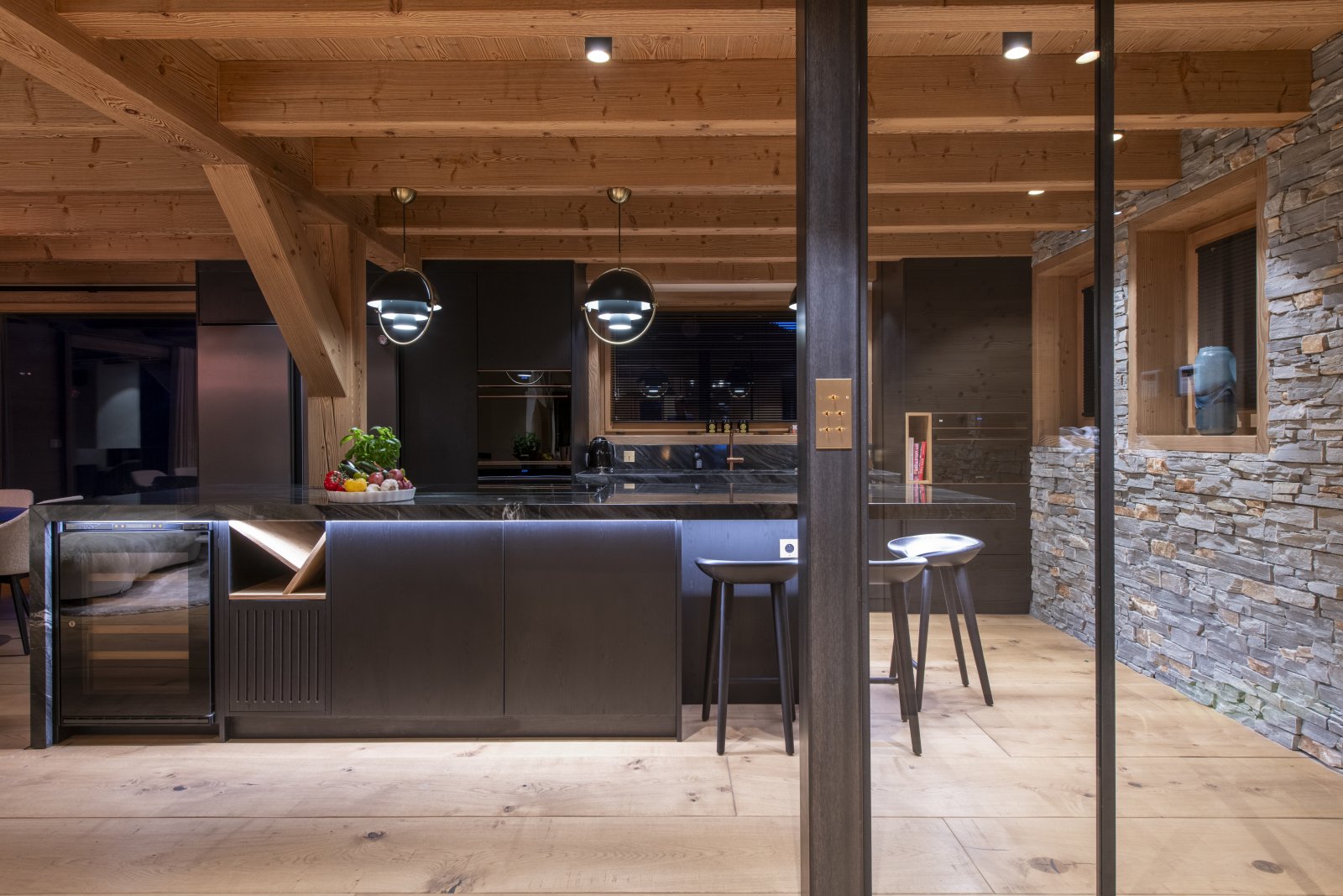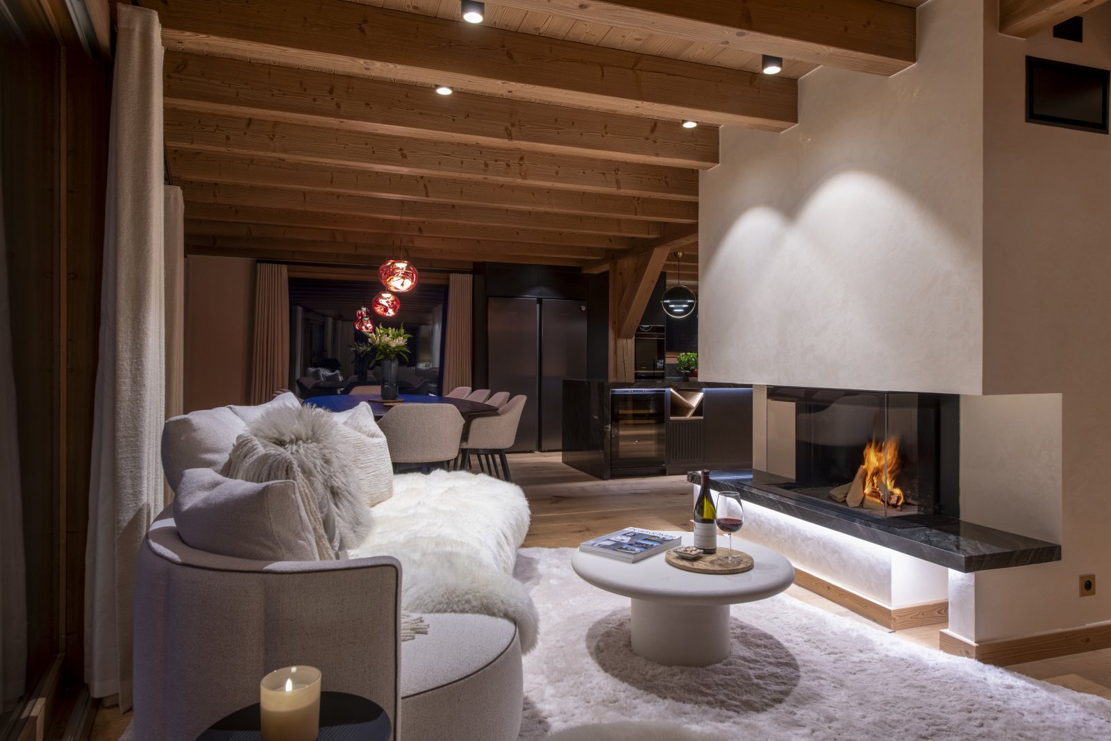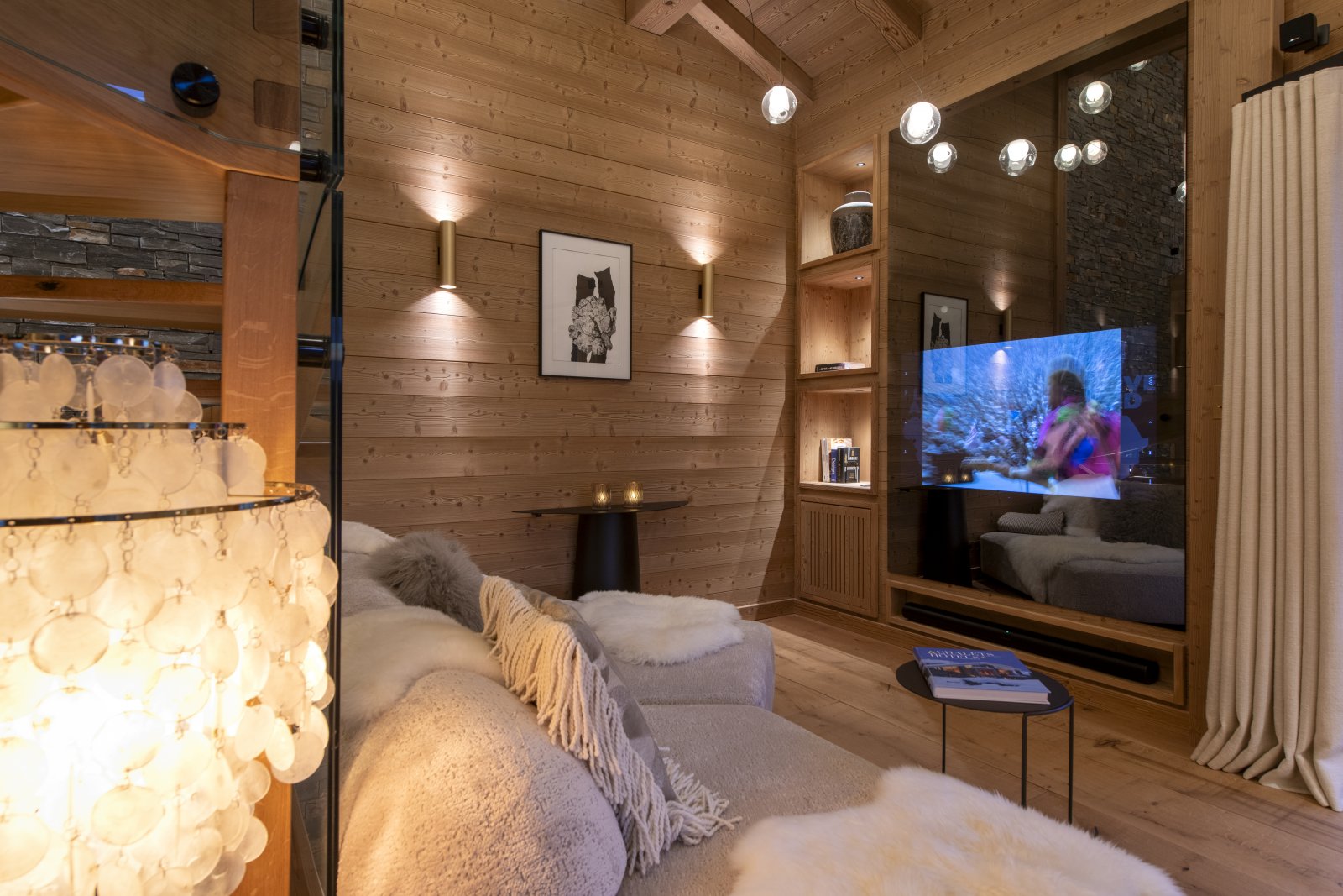 Some chalets have an immediate identity, an aura you can feel as soon as you step through the door, and that certainly applies to Chalet Avalon. The owners have obsessed over every detail, working with Devos Interieurs, a high end interior design studio based in Schilde in Belgium, to create a seamless and elegant home. For us, it’s a playful mix of both feminine and masculine touches and this balance makes it a really fun chalet to spend time in. The main living room has a softer feminine touch, with light coloured sofas, curving lines and layers of natural fabric finishes. It’s peaceful and refined, a very classy space. The main living level is open plan but well zoned around the central fireplace to create four distinct areas, the kitchen, dining room, primary lounge and a TV snug. All of this is tied together with a Bocci light installation featuring over 40 individual globes – a real statement piece.