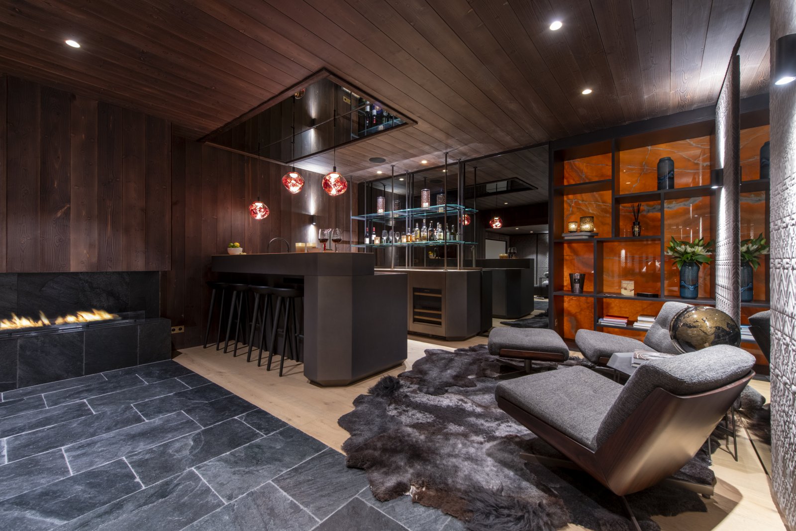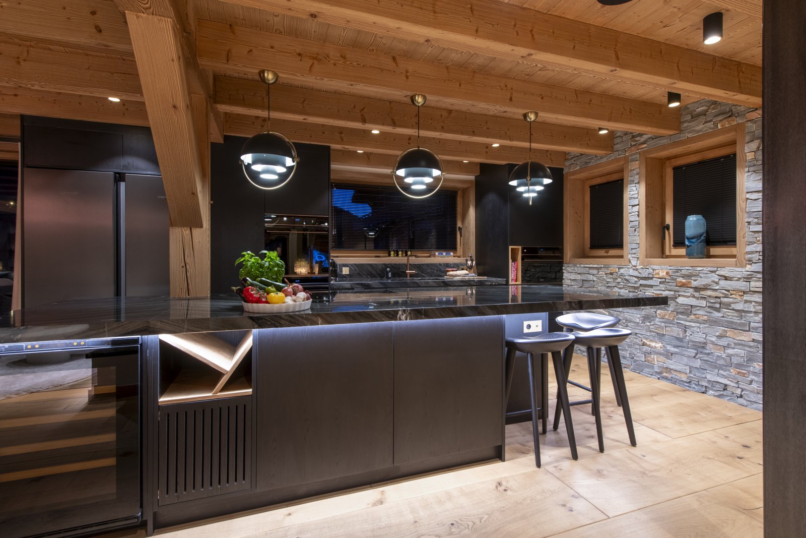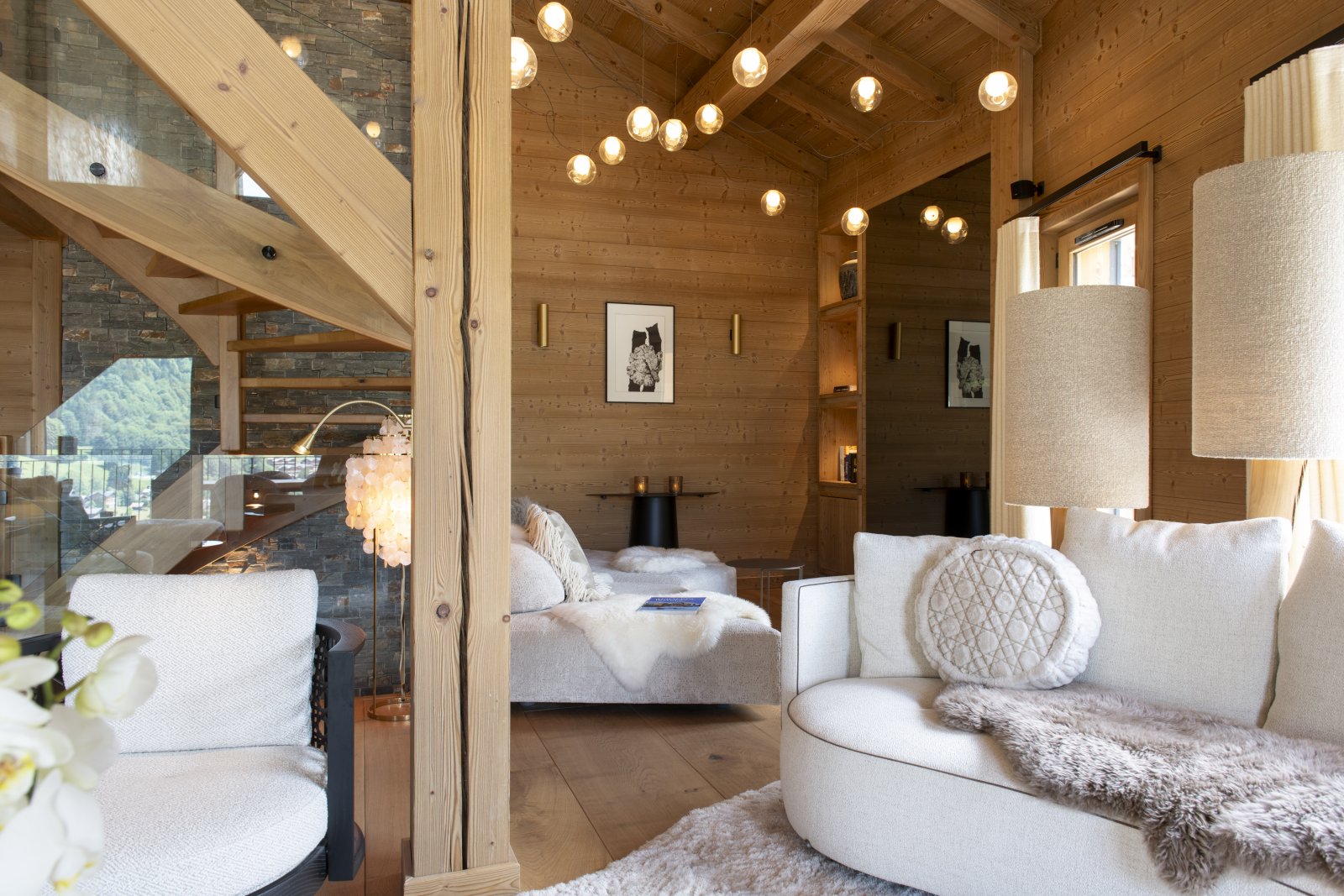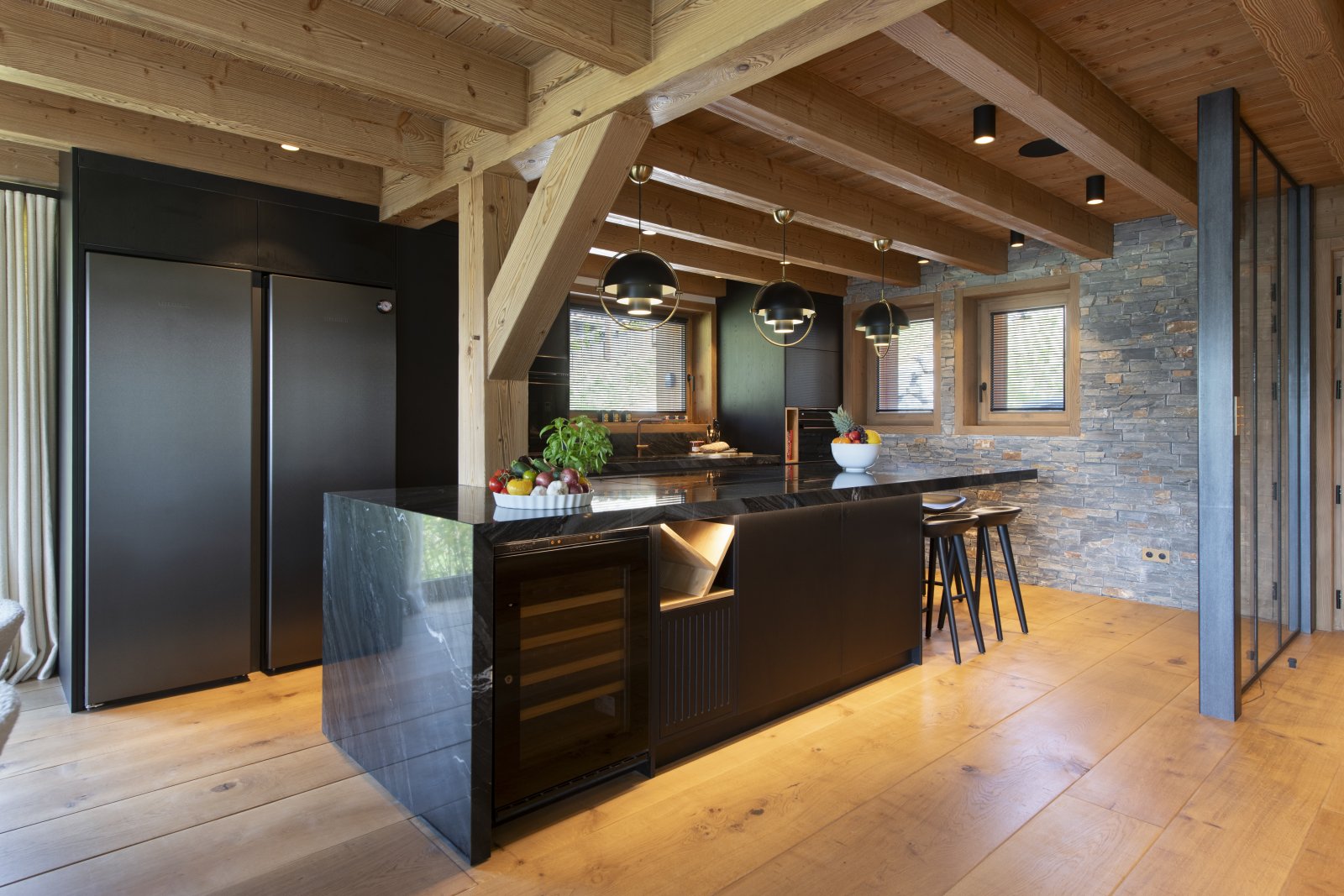 Some chalets have an immediate identity, an aura you can feel as soon as you step through the door, and that certainly applies to Chalet Avalon. The owners have obsessed over every detail, working with Devos Interieurs, a high end interior design studio based in Schilde in Belgium, to create a seamless and elegant home. For us, it’s a playful mix of both feminine and masculine touches and this balance makes it a really fun chalet to spend time in. The main living room has a softer feminine touch, with light coloured sofas, curving lines and layers of natural fabric finishes. It’s peaceful and refined, a very classy space. The main living level is open plan but well zoned around the central fireplace to create four distinct areas, the kitchen, dining room, primary lounge and a TV snug. All of this is tied together with a Bocci light installation featuring over 40 individual globes – a real statement piece.