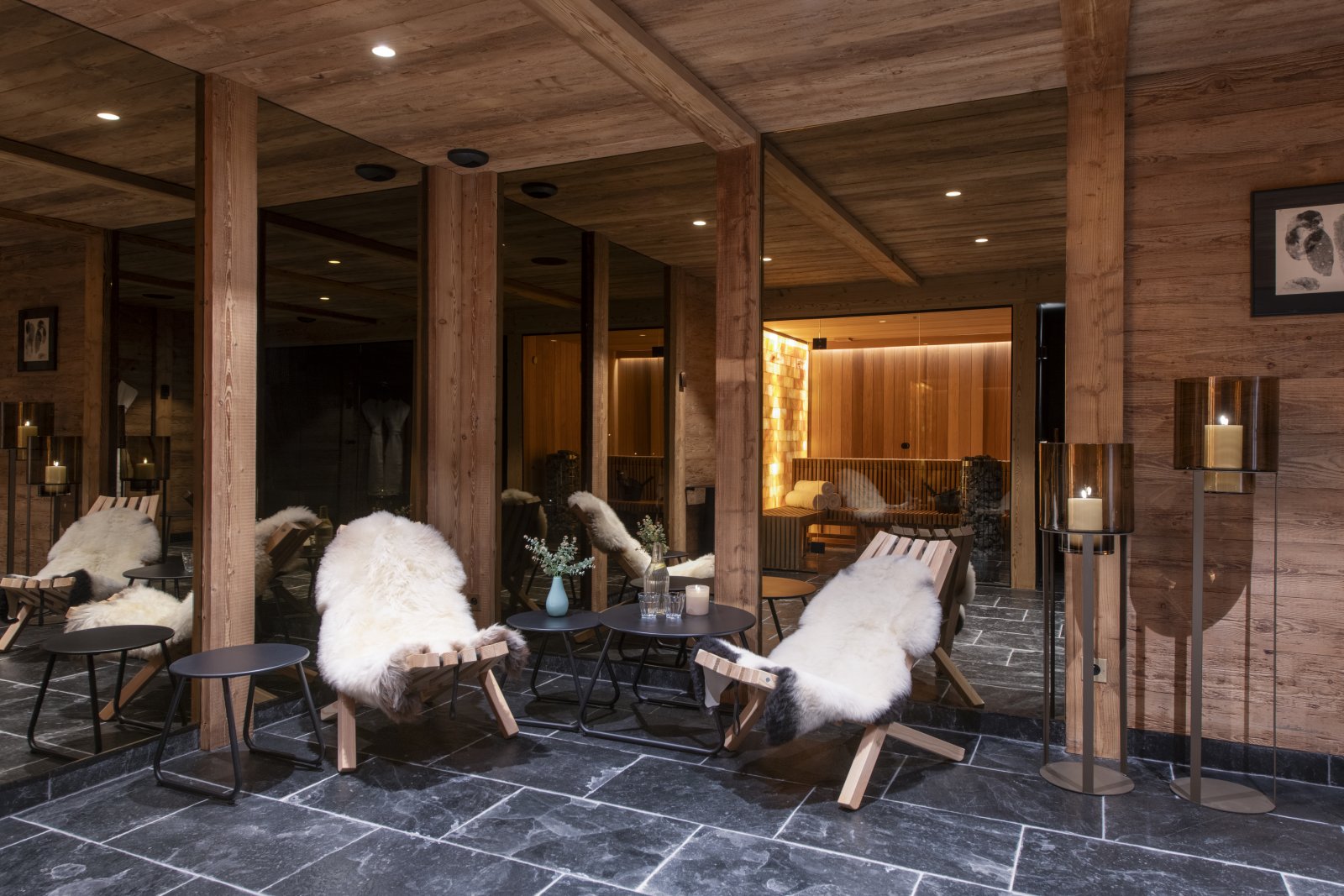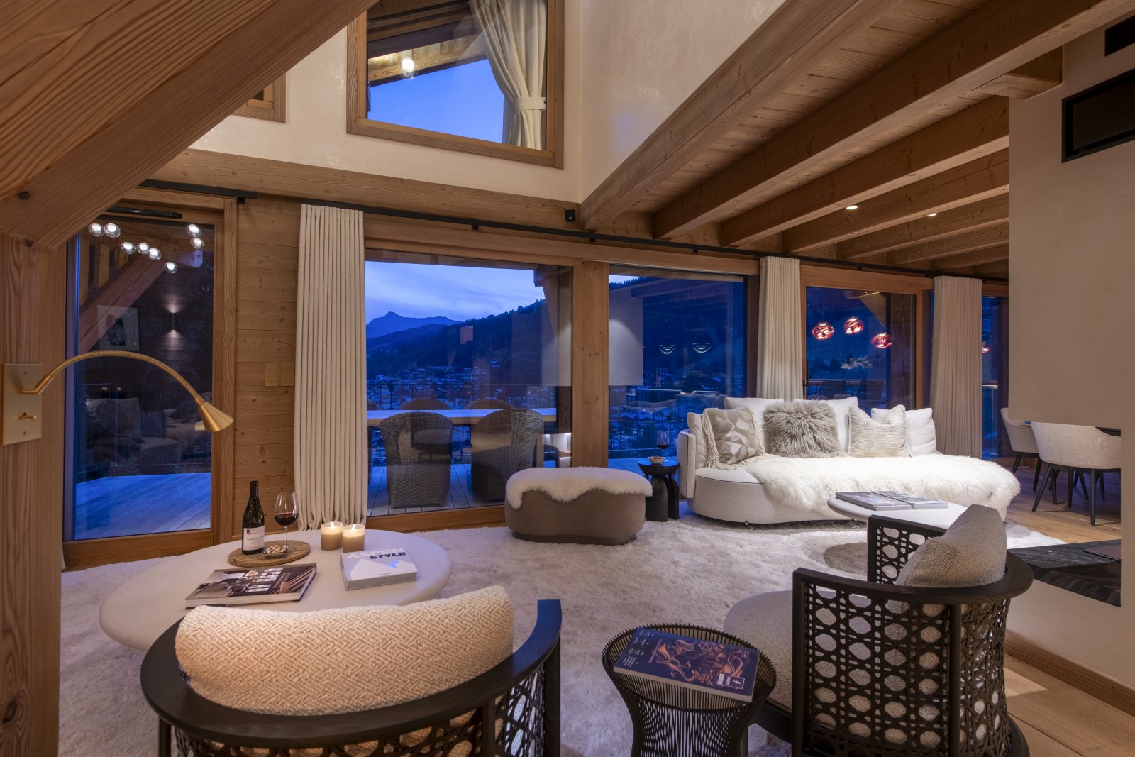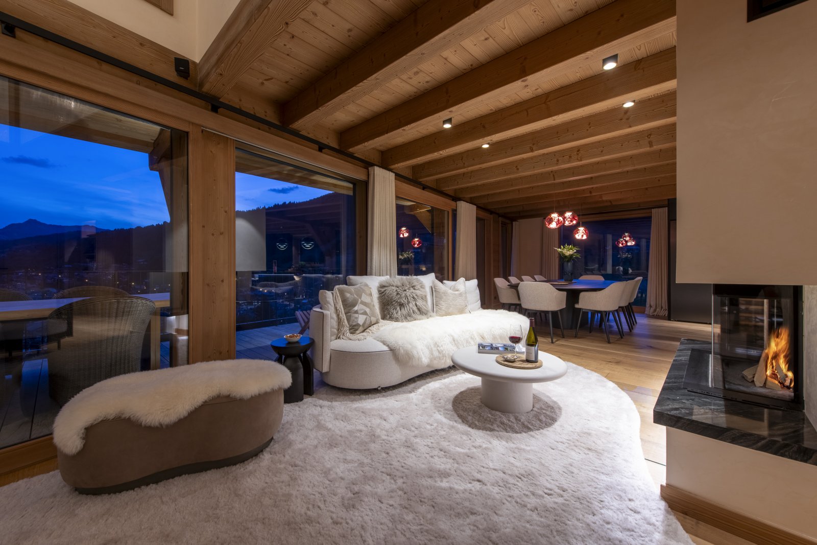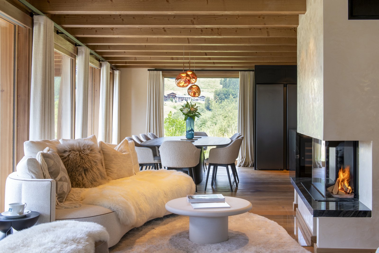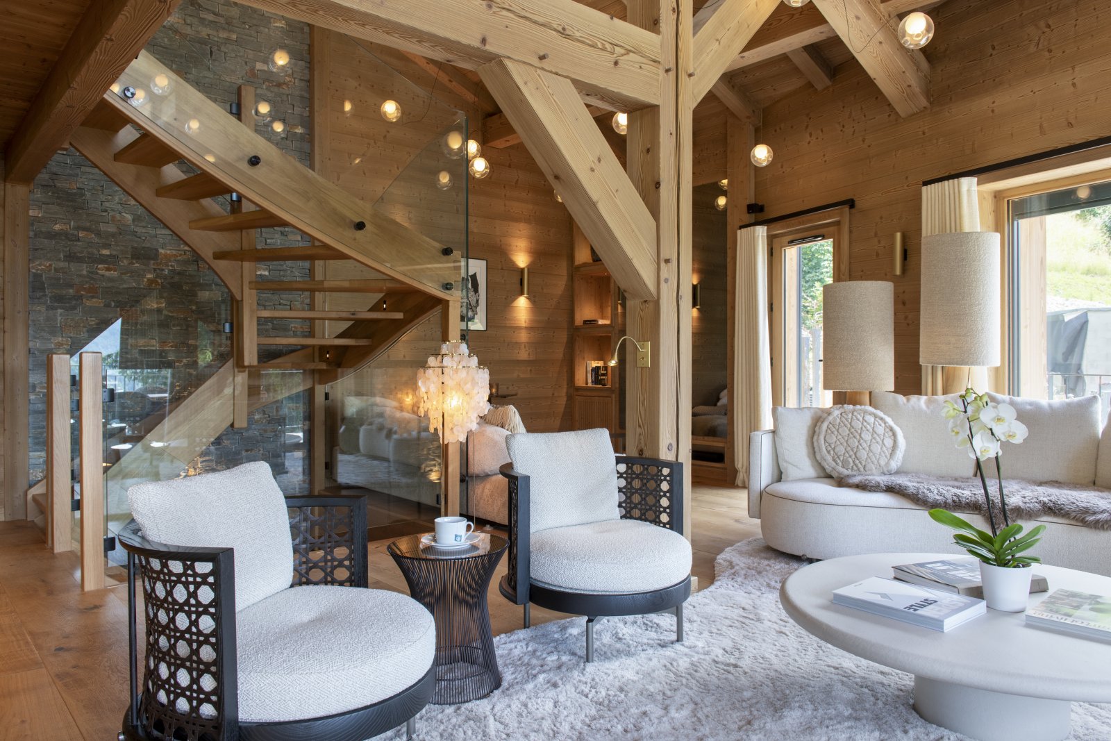Some chalets have an immediate identity, an aura you can feel as soon as you step through the door, and that certainly applies to Chalet Avalon. The owners have obsessed over every detail, working with Devos Interieurs, a high end interior design studio based in Schilde in Belgium, to create a seamless and elegant home. For us, it’s a playful mix of both feminine and masculine touches and this balance makes it a really fun chalet to spend time in. The main living room has a softer feminine touch, with light coloured sofas, curving lines and layers of natural fabric finishes. It’s peaceful and refined, a very classy space. The main living level is open plan but well zoned around the central fireplace to create four distinct areas, the kitchen, dining room, primary lounge and a TV snug. All of this is tied together with a Bocci light installation featuring over 40 individual globes – a real statement piece.