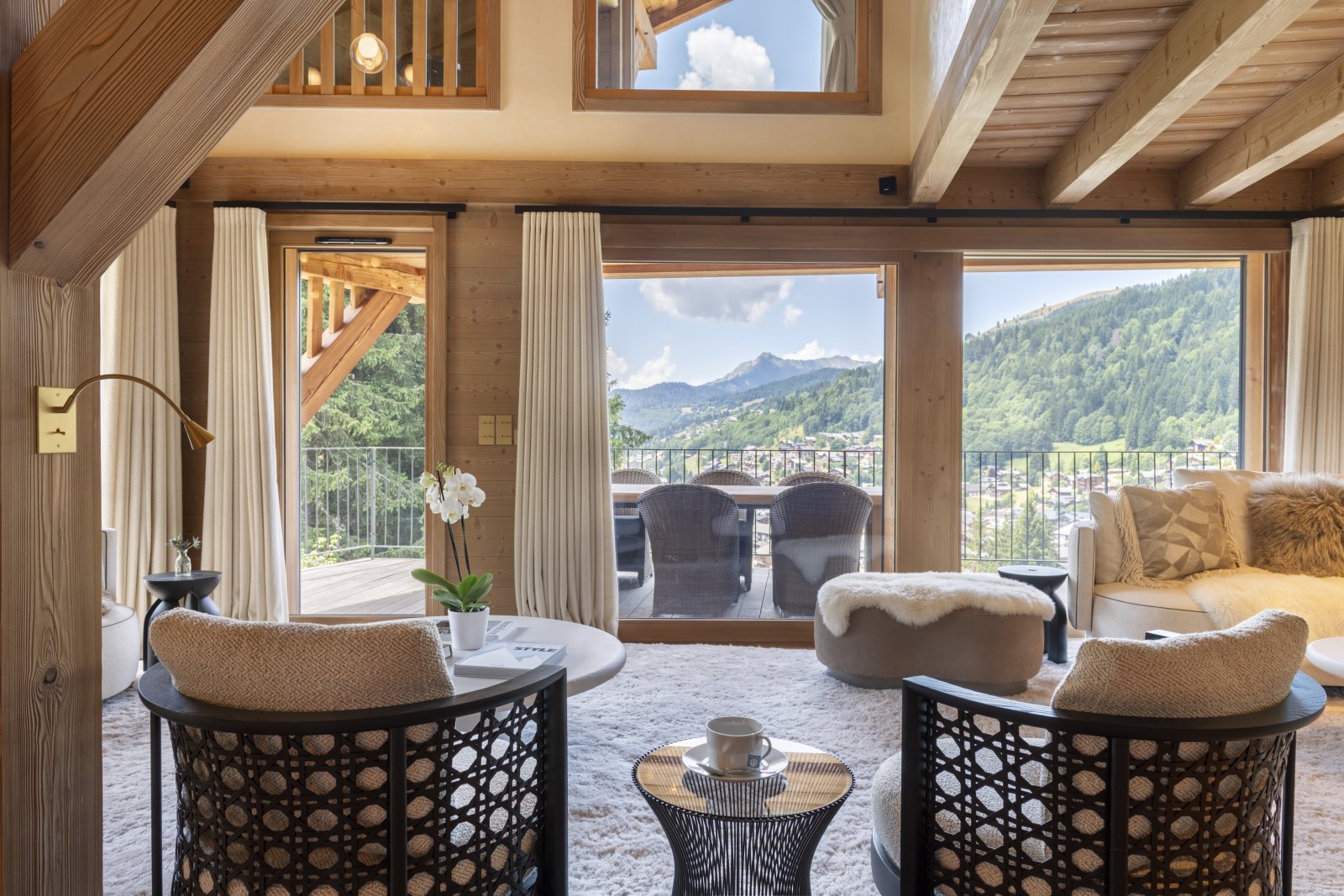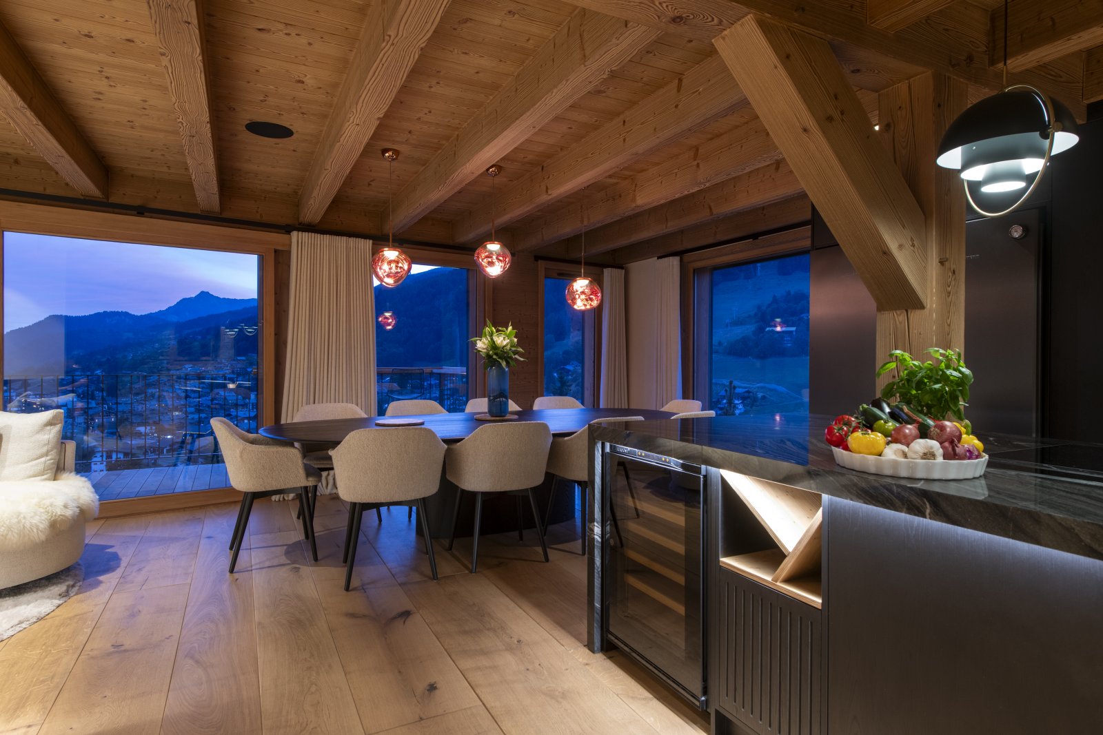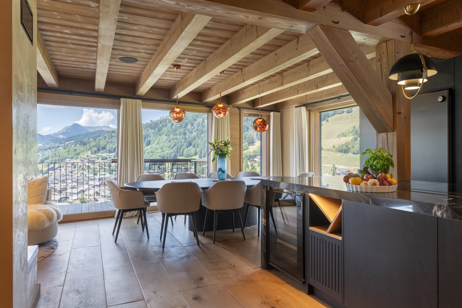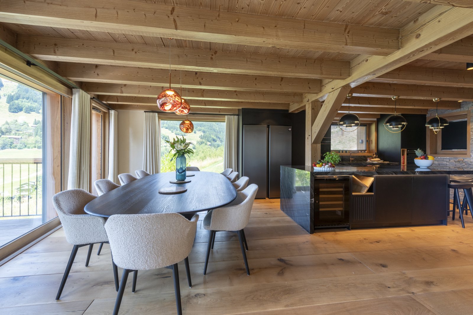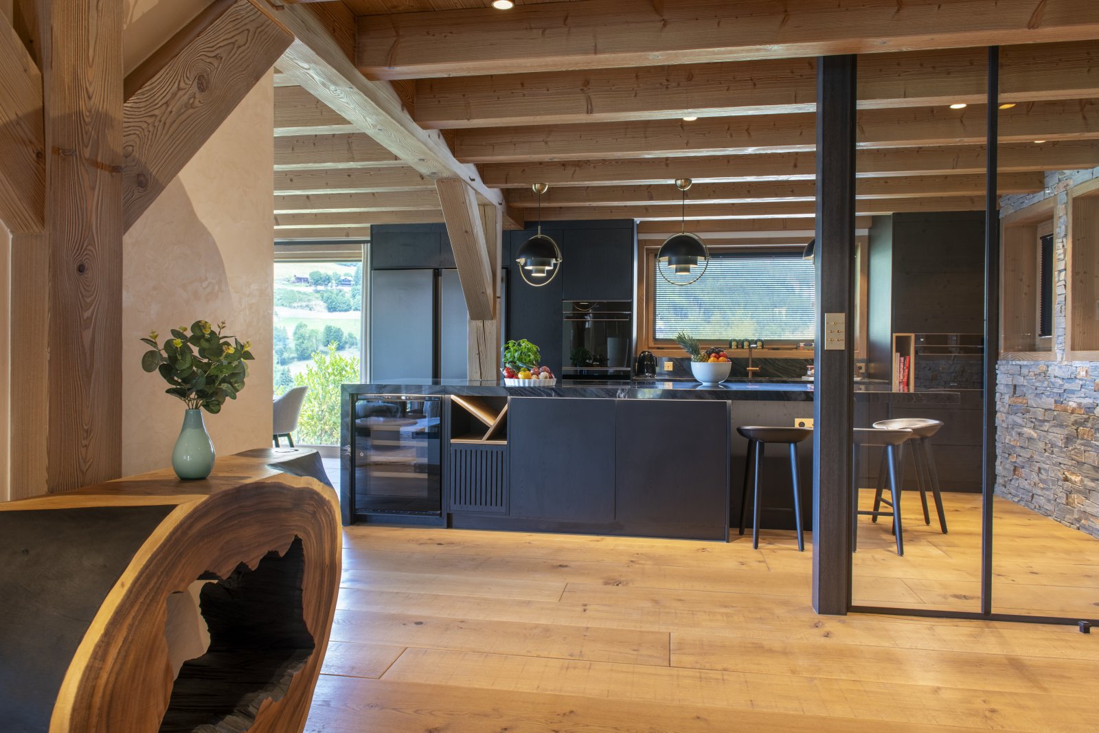 The kitchen is as well appointed as you would expect in a chalet of this quality – all the appliances are of a high standard so if you do choose to self cater you’ll enjoy cooking here. A private chef would also be at home in this space and that would be a truly indulgent way to enjoy time in this property. Another nice feature is that you have both indoor and outdoor dining options on this level – with a large custom oak table set on the balcony also being easily accessible when the weather allows. Wherever you sit you’ll be able to enjoy incredible views over the village of Les Gets, the slopes of both Chavannes and Mont Cherry, and the valley beyond. The aspect is westerly which is ideal for evening sunlight and magical Alpine sunsets.