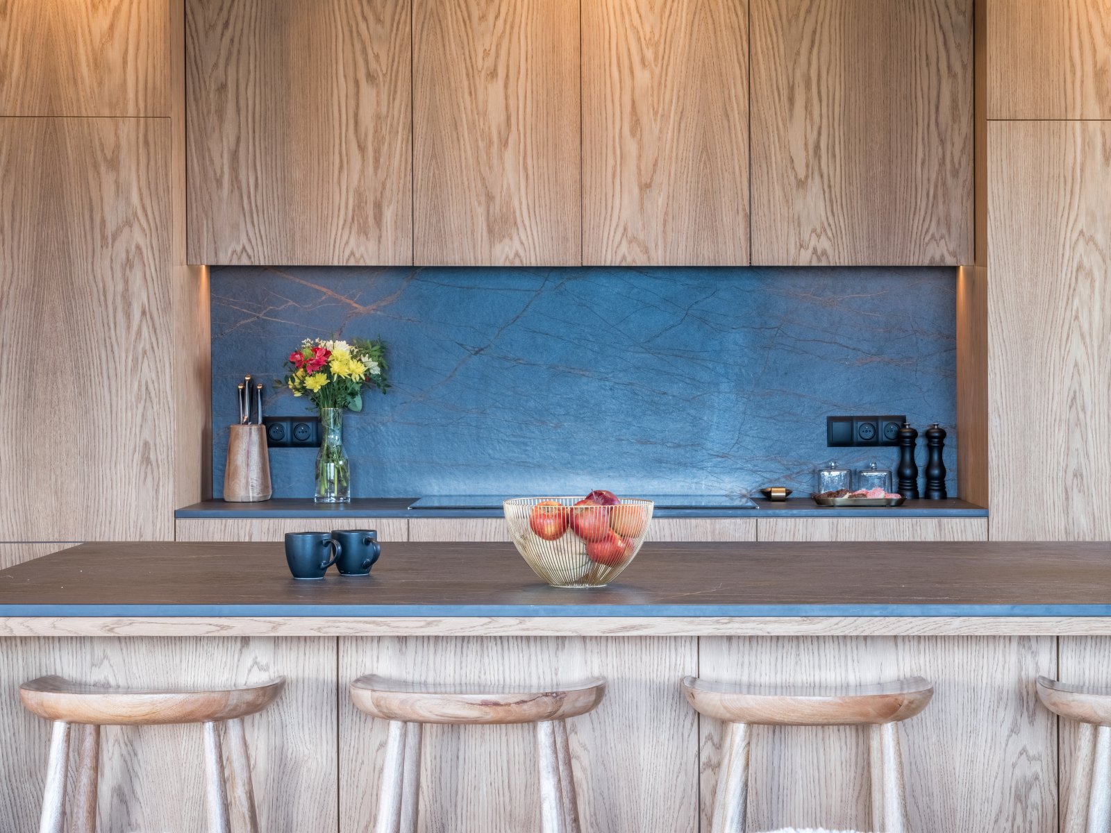 The heart of Chalet 180, a majestic cathedral-ceiling living room, is an invitation to conviviality. Gather around the fireplace and let yourself be captivated by the spectacle of snow-capped peaks. The custom-designed kitchen, with its large central island, is more than just a space: it's a vibrant place where family and friends come together to cook and savor precious moments.