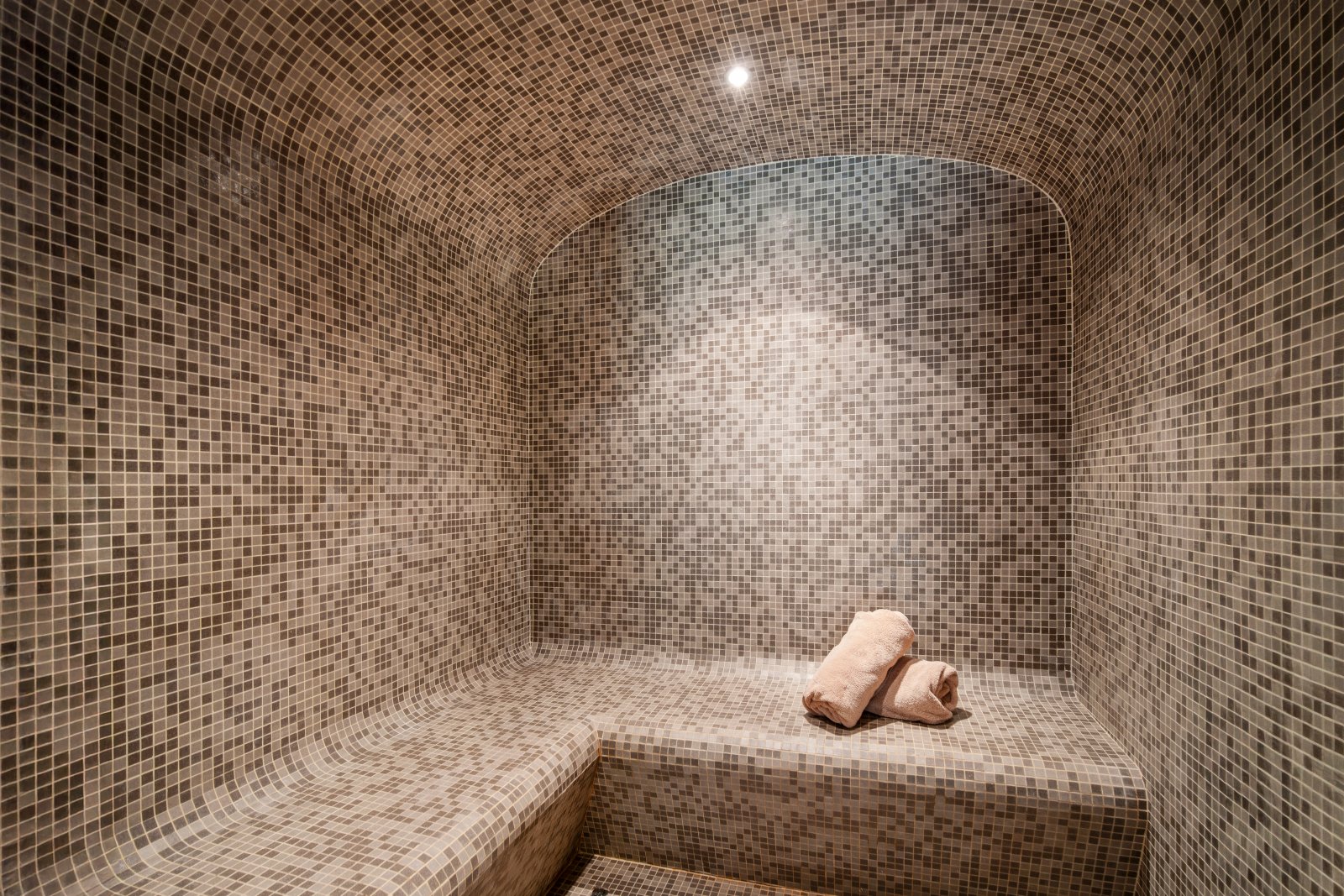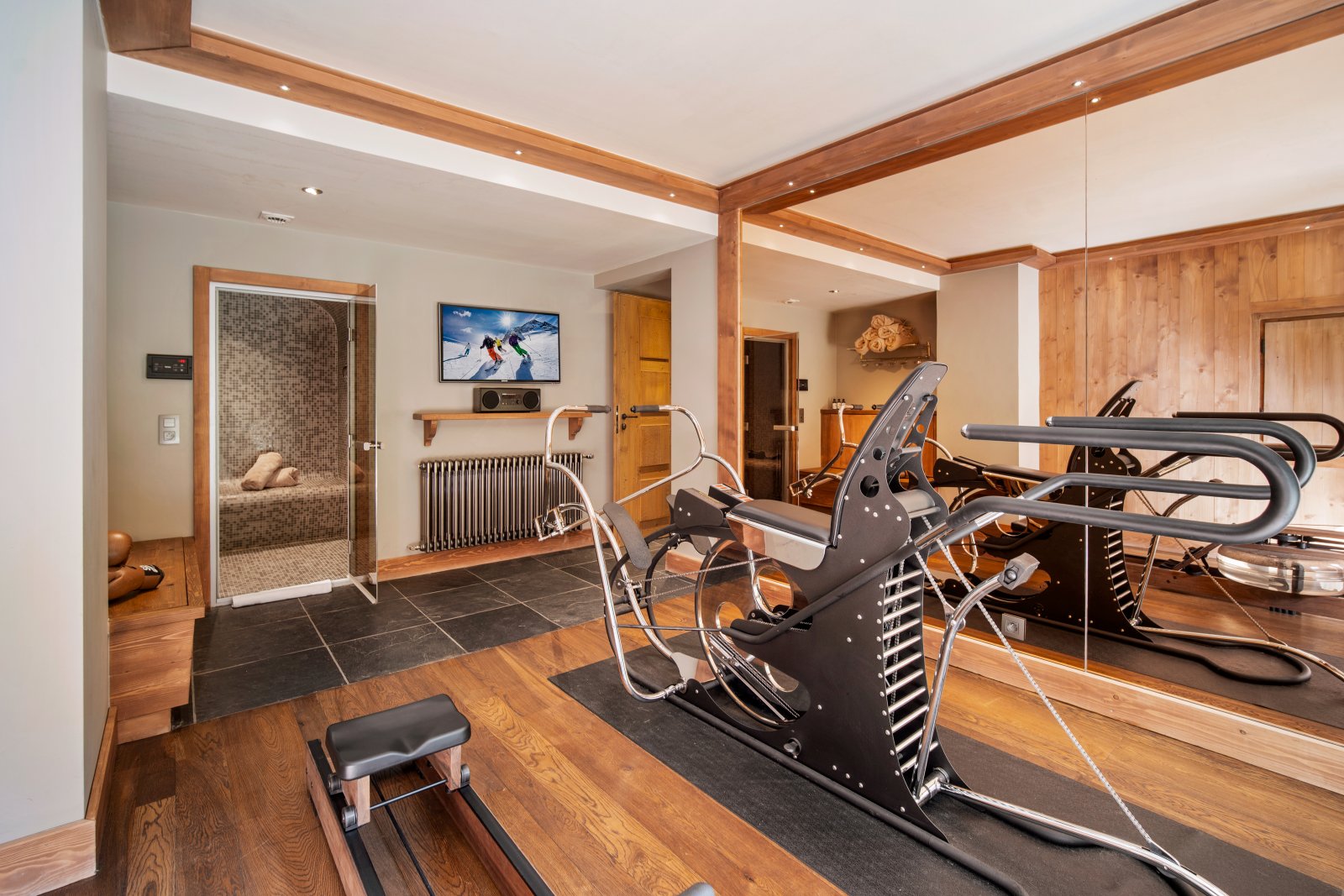 Level -1 – Comfort & Wellness: This level offers luxury suites and wellness amenities. Bedroom 2 has a queen-size bed, private balcony, and ensuite with shower and separate WC. Bedroom 3 has a queen-size bed, private balcony, and ensuite with bathtub and separate WC. Bedroom 4 has a king-size bed (or twin setup), balcony access, and ensuite with bathtub and separate WC. The fitness room is equipped with machines for cardio and strength training. A private hammam is available for relaxing after ski days or mountain hikes.