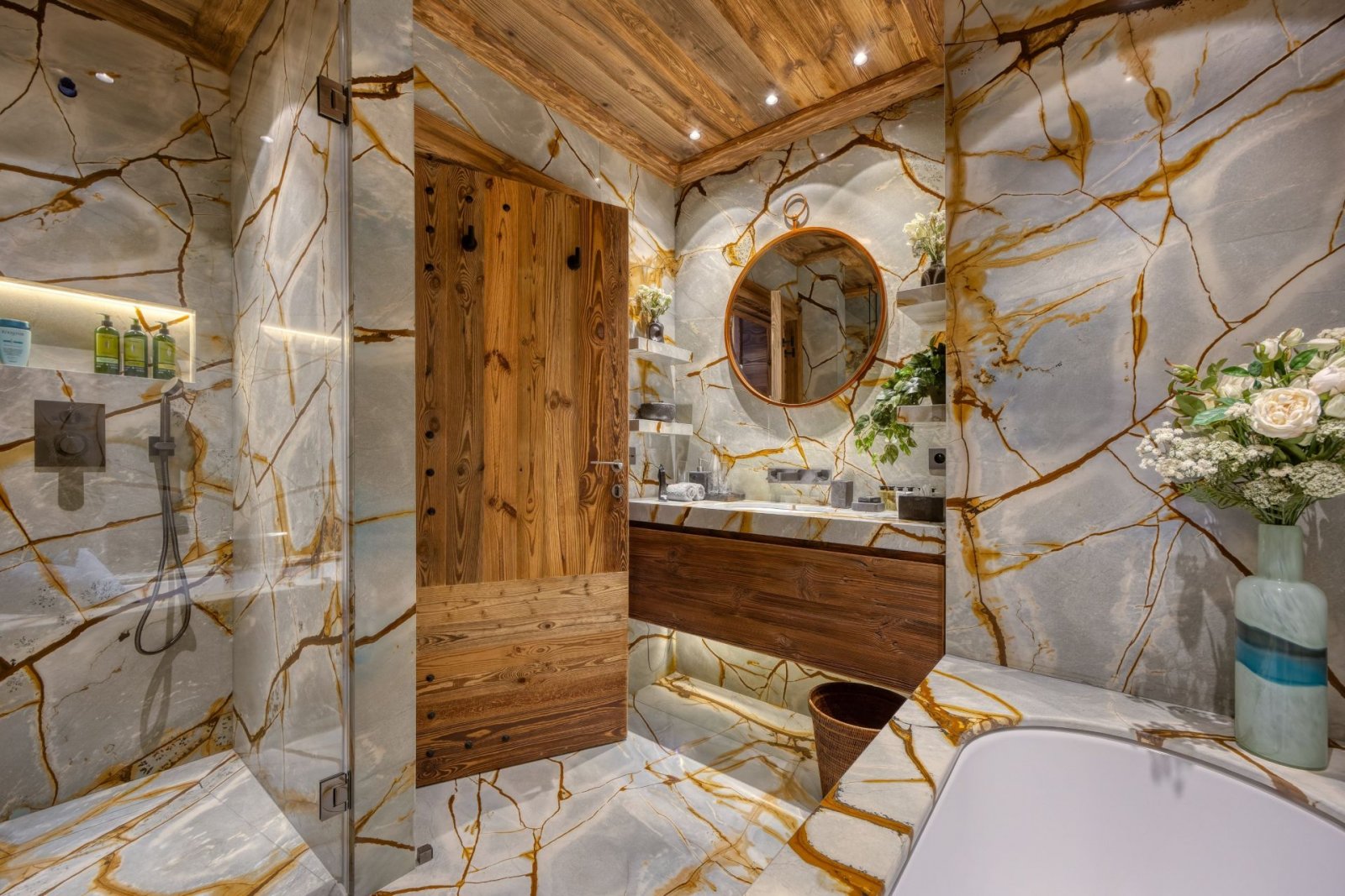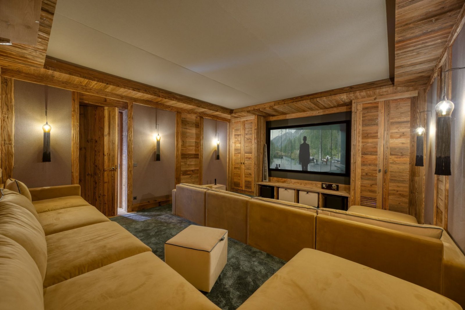 On the ground floor, its spacious living area under a high cathedral ceiling, bathes in light thanks to its large bay windows, creating a warm and welcoming atmosphere. The semi-open kitchen with a second fireplace overlooking the dining room and cosy library promises convivial moments, while the sunny terrace invites you to enjoy the surrounding nature. After a day of skiing on the slopes of the 3 Valleys, you can find entertainment in the first-class private cinema room.