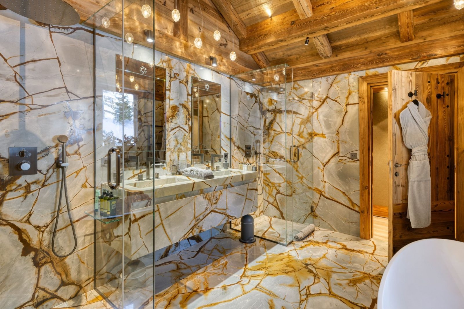 Below the ground floor the chalet has three luxurious suites, each with 2 double doors opening to a terrace with great mountain views. These spacious suites are perfect for adults but can also accommodate a couple with two young children. The fourth bedroom on this floor, with en suite bathroom and kitchen, is suitable for any additional guests or for supporting personnel.