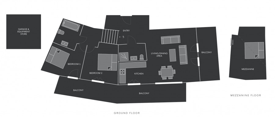 Apartment Tamarack can sleep four over two double bedrooms, both with south facing views and balcony access, and two bathrooms, both with WC and shower plus the master bathroom also has a bath. There is a mezzanine level (recommended for children, due to restricted head height) with double mattress, smart TV and bean-bags – it’s the perfect snug for kids!