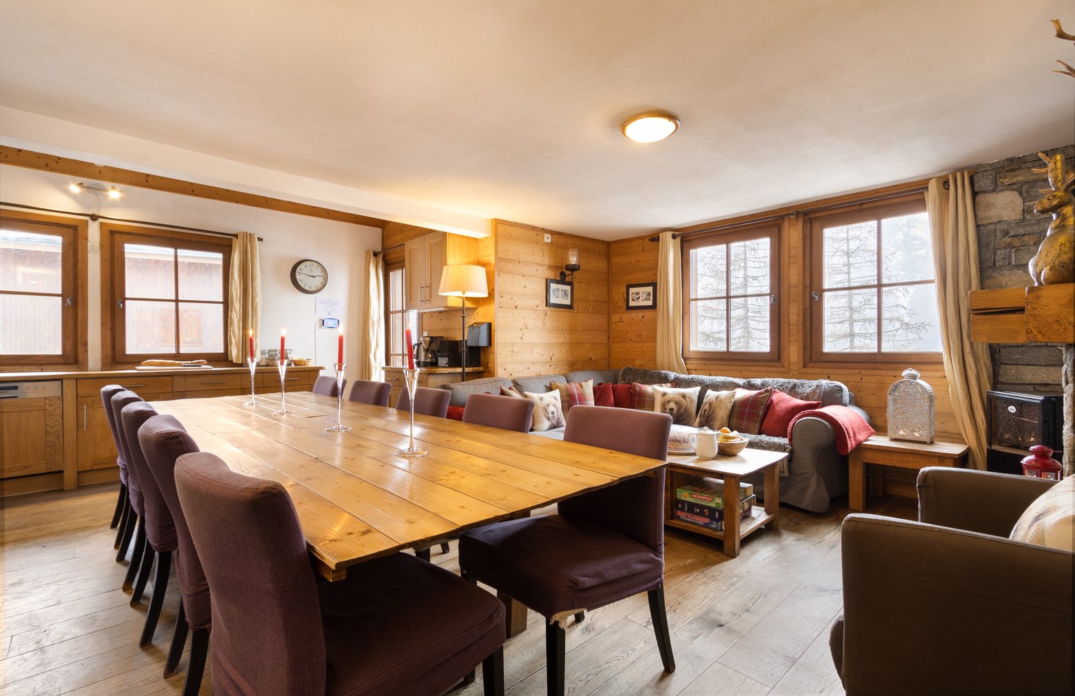 With its wood and stone finish, the cosy living/dining/kitchen area has an abundance of character and a sociable, open-plan layout. Guests can use the fully equipped kitchen, indulge in delicious meals at the large banqueting table, warm up after a day on the slopes in front of the crackling fire, and admire the idyllic views of the picture-perfect snowy village, lake and mountains from the large picture windows and communal balcony. There is also UK satellite TV/DVD, a selection of movies, and a games console.