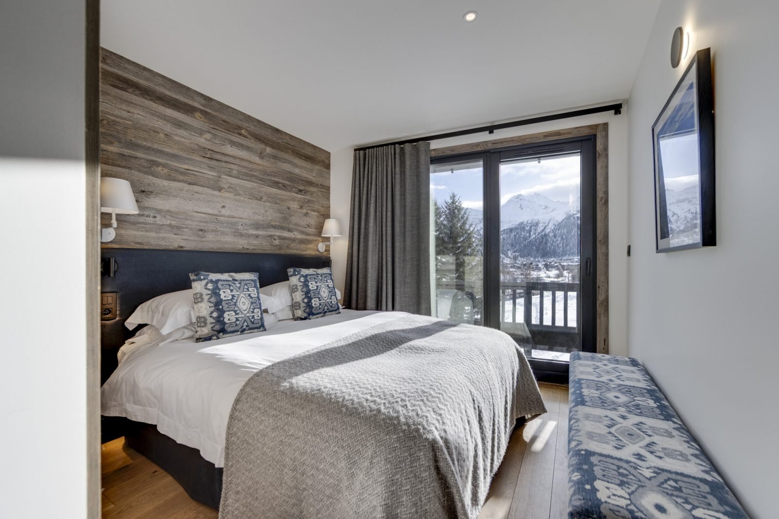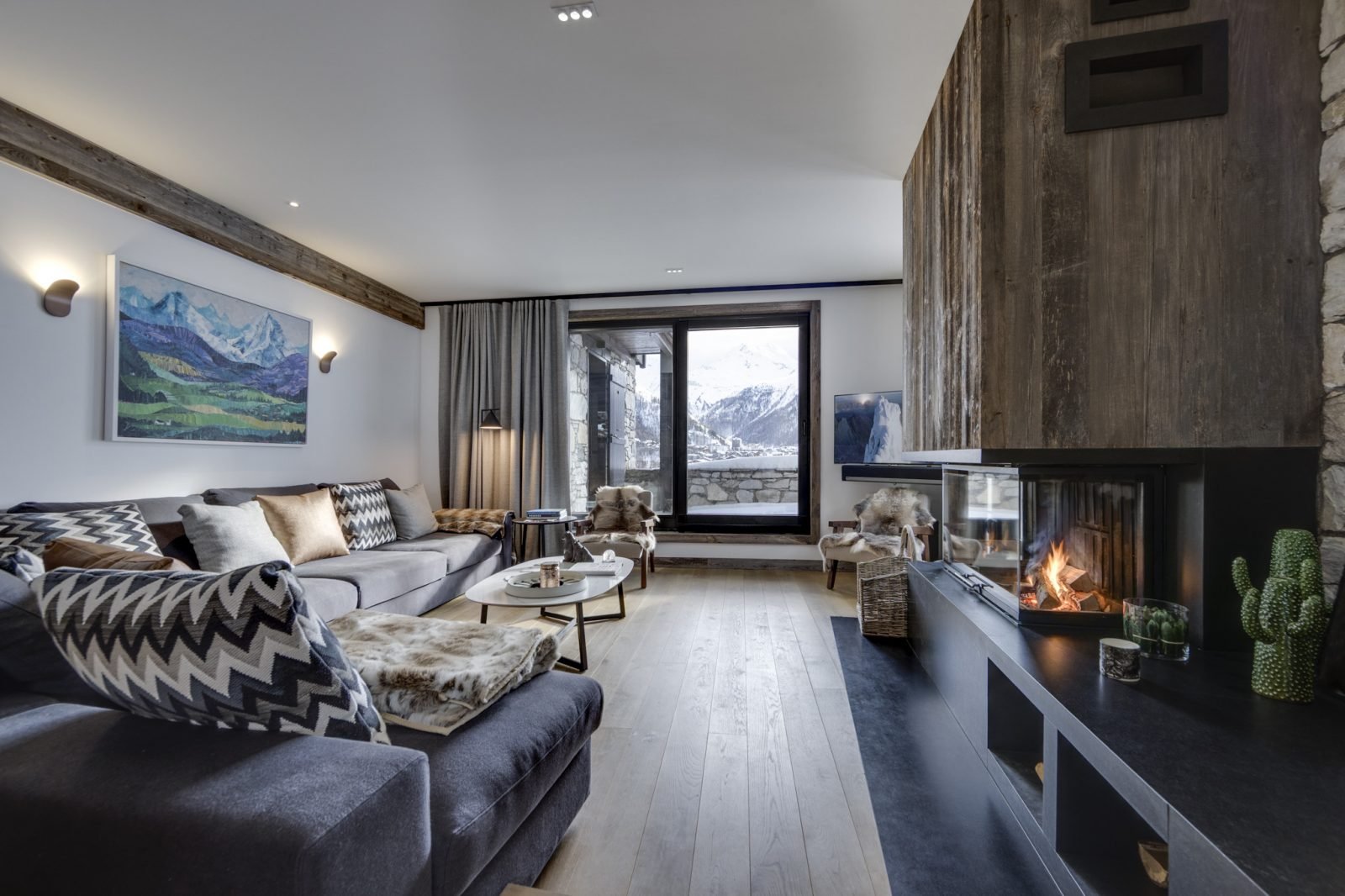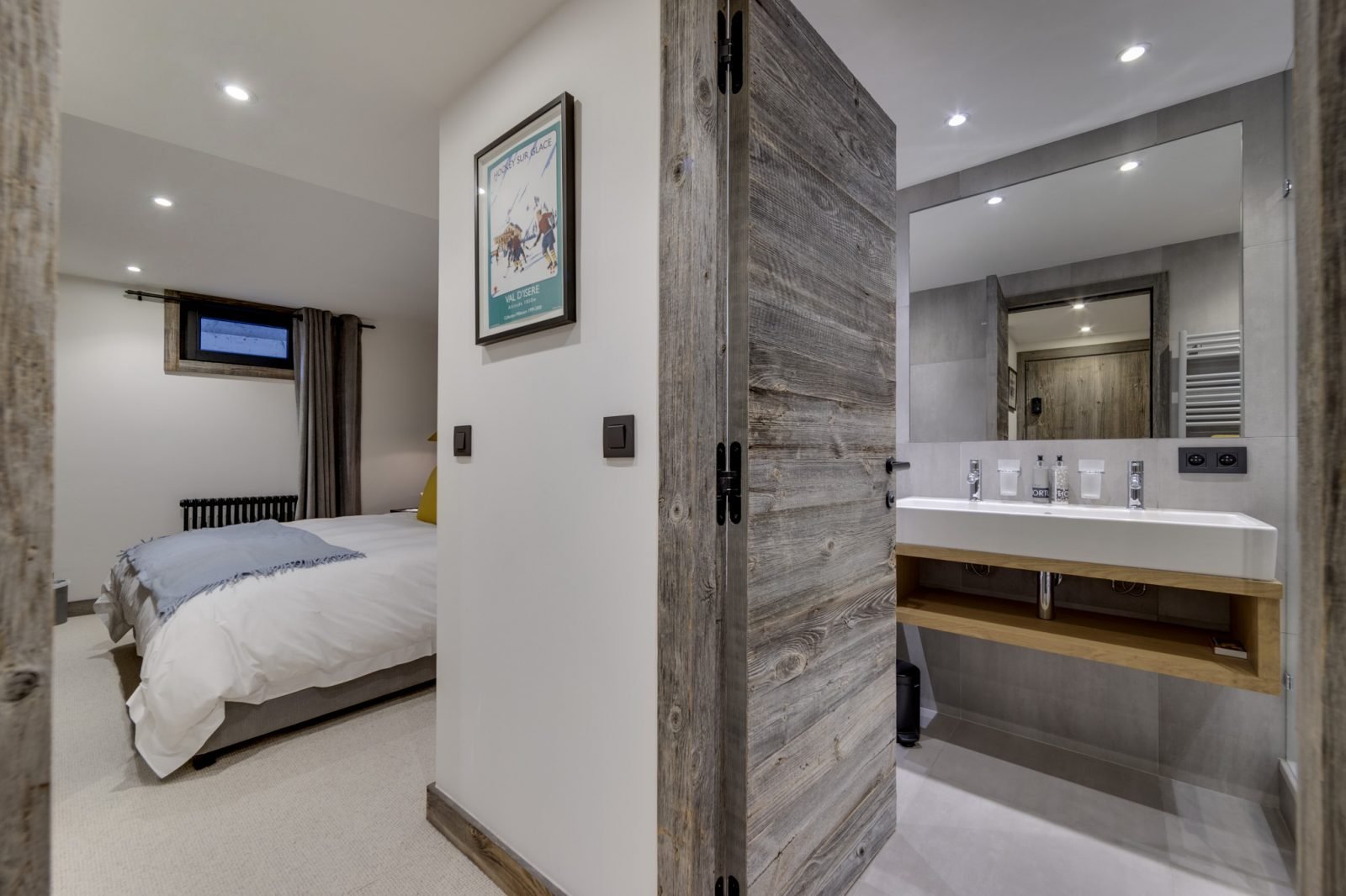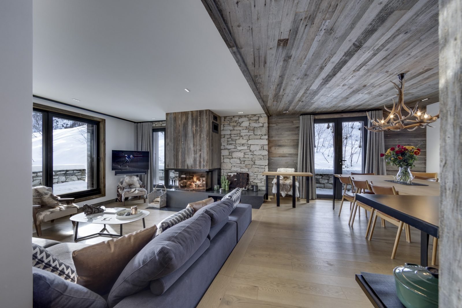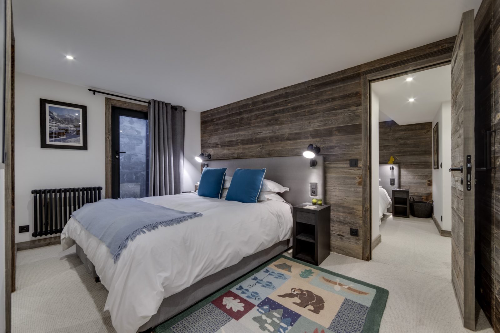 Soleil Levant is a stylish and spacious ski-in ski-out apartment located above the funicular in La Daille with spectacular views towards Solaise. It has been renovated to a very high standard and can sleep up to 12 guests in 6 bedrooms over two levels. On the upper level of the apartment you will find a beautifully light and airy open-plan living/dining/kitchen area which looks out onto a large terrace. There’s a lovely comfy corner sofa to relax in, as well as gorgeous hide-covered arm chairs, and a log-fire to make it extra cosy. For your entertainment there’s a smart TV and Sonos speakers. The well-equipped kitchen has a breakfast bar seating 3, and the dining table seats up to 12.
