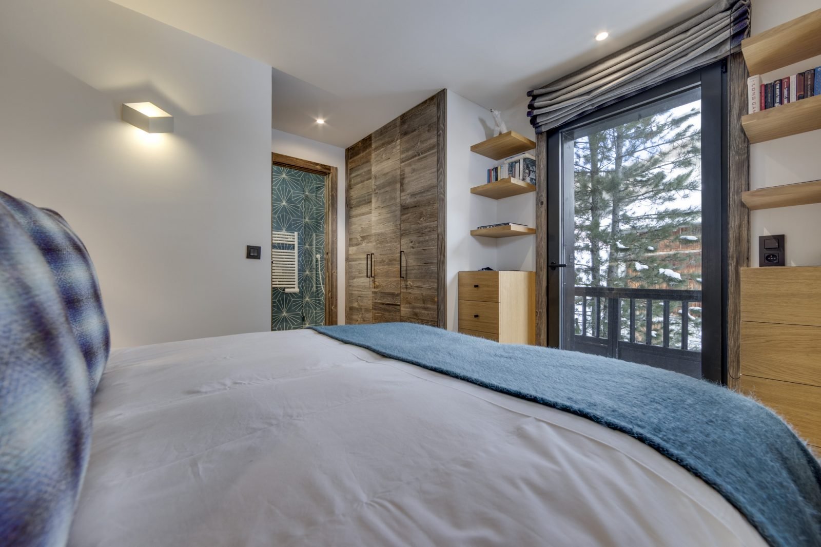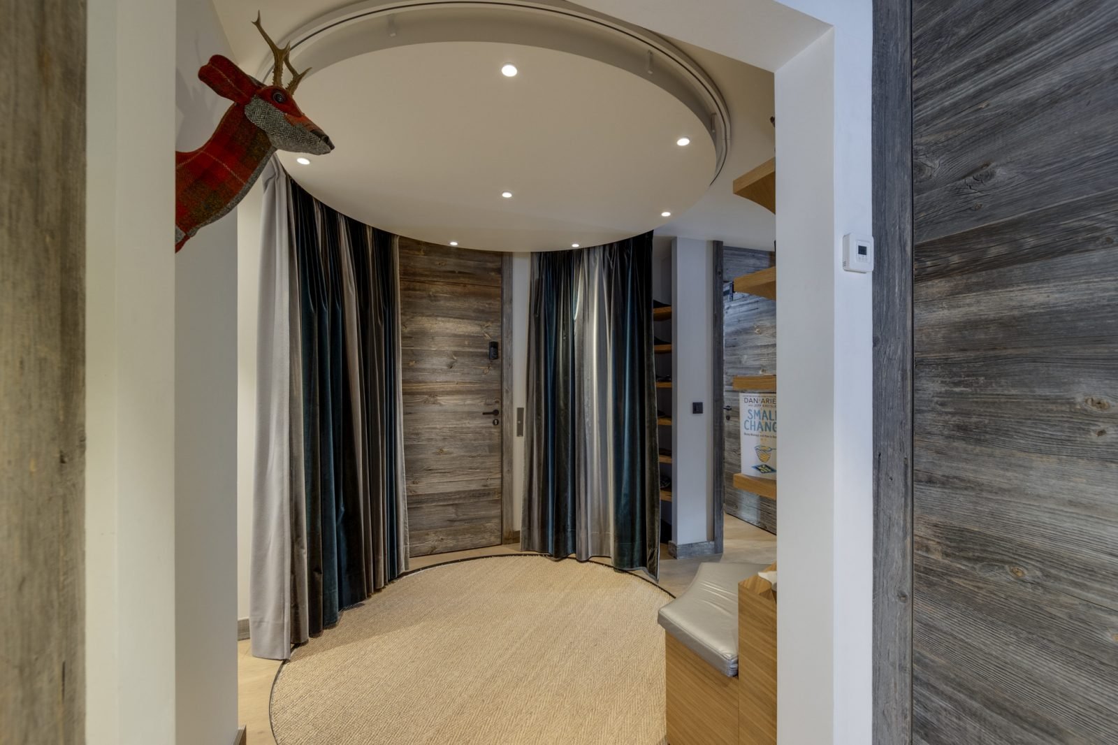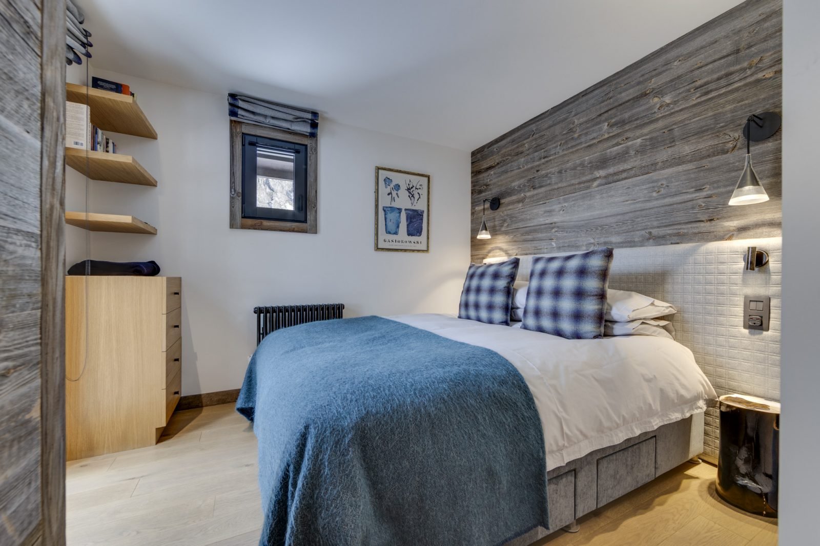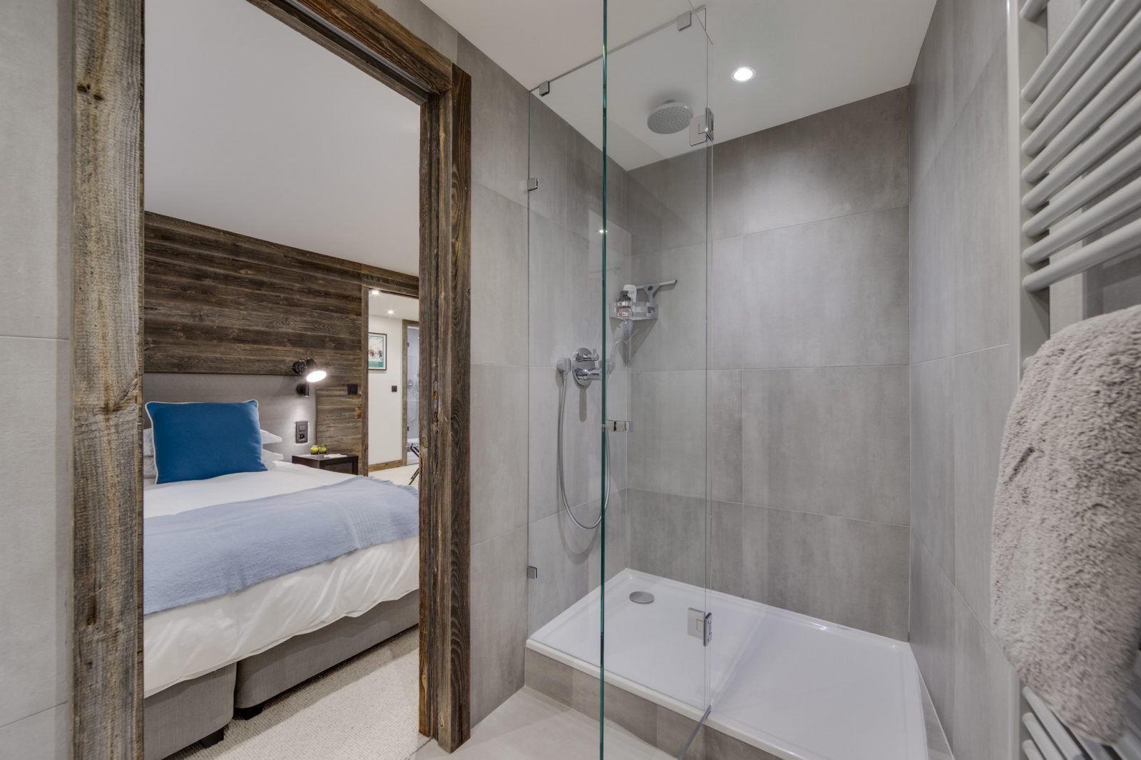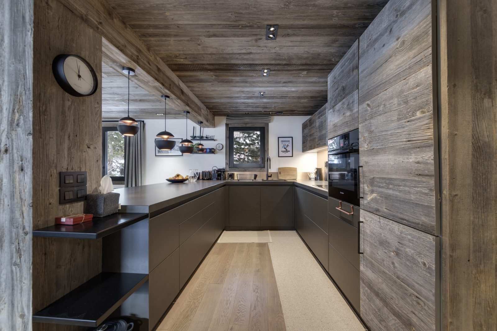 Soleil Levant is a stylish and spacious ski-in ski-out apartment located above the funicular in La Daille with spectacular views towards Solaise. It has been renovated to a very high standard and can sleep up to 12 guests in 6 bedrooms over two levels. On the upper level of the apartment you will find a beautifully light and airy open-plan living/dining/kitchen area which looks out onto a large terrace. There’s a lovely comfy corner sofa to relax in, as well as gorgeous hide-covered arm chairs, and a log-fire to make it extra cosy. For your entertainment there’s a smart TV and Sonos speakers. The well-equipped kitchen has a breakfast bar seating 3, and the dining table seats up to 12.