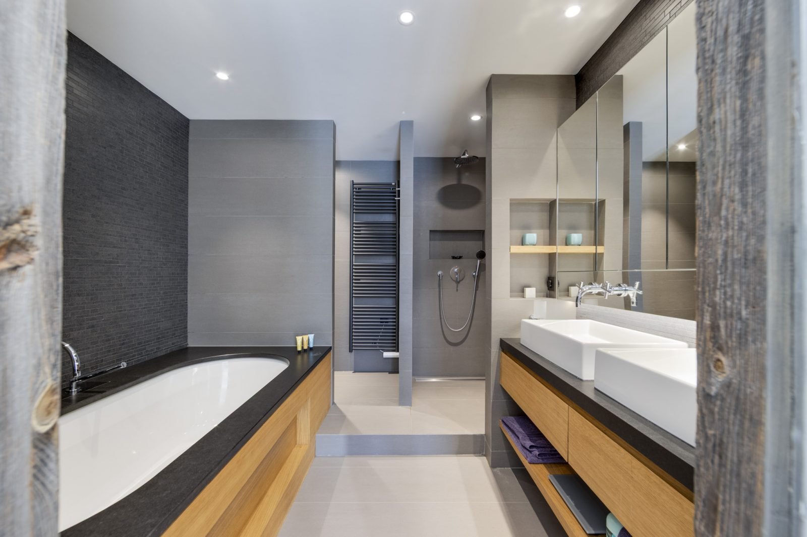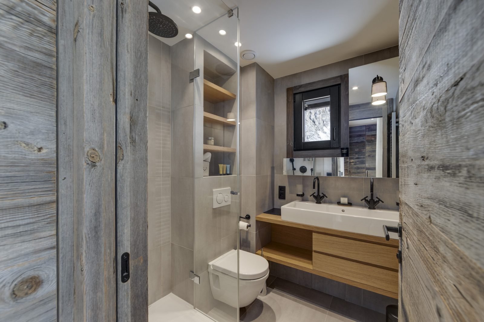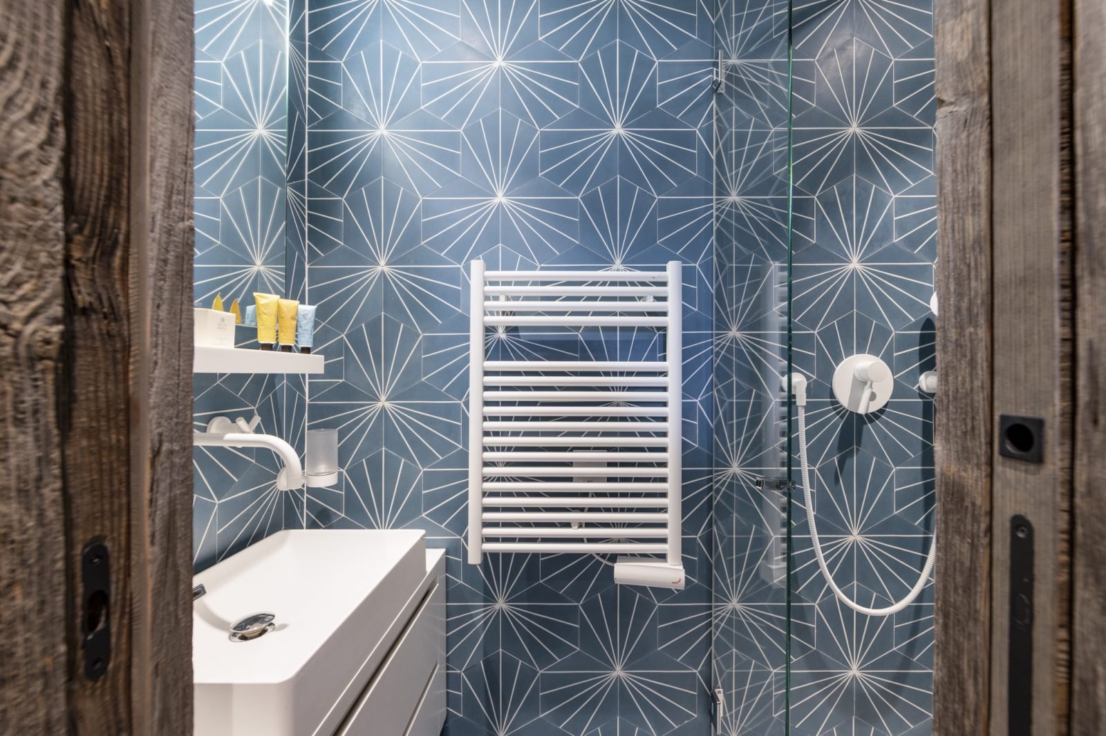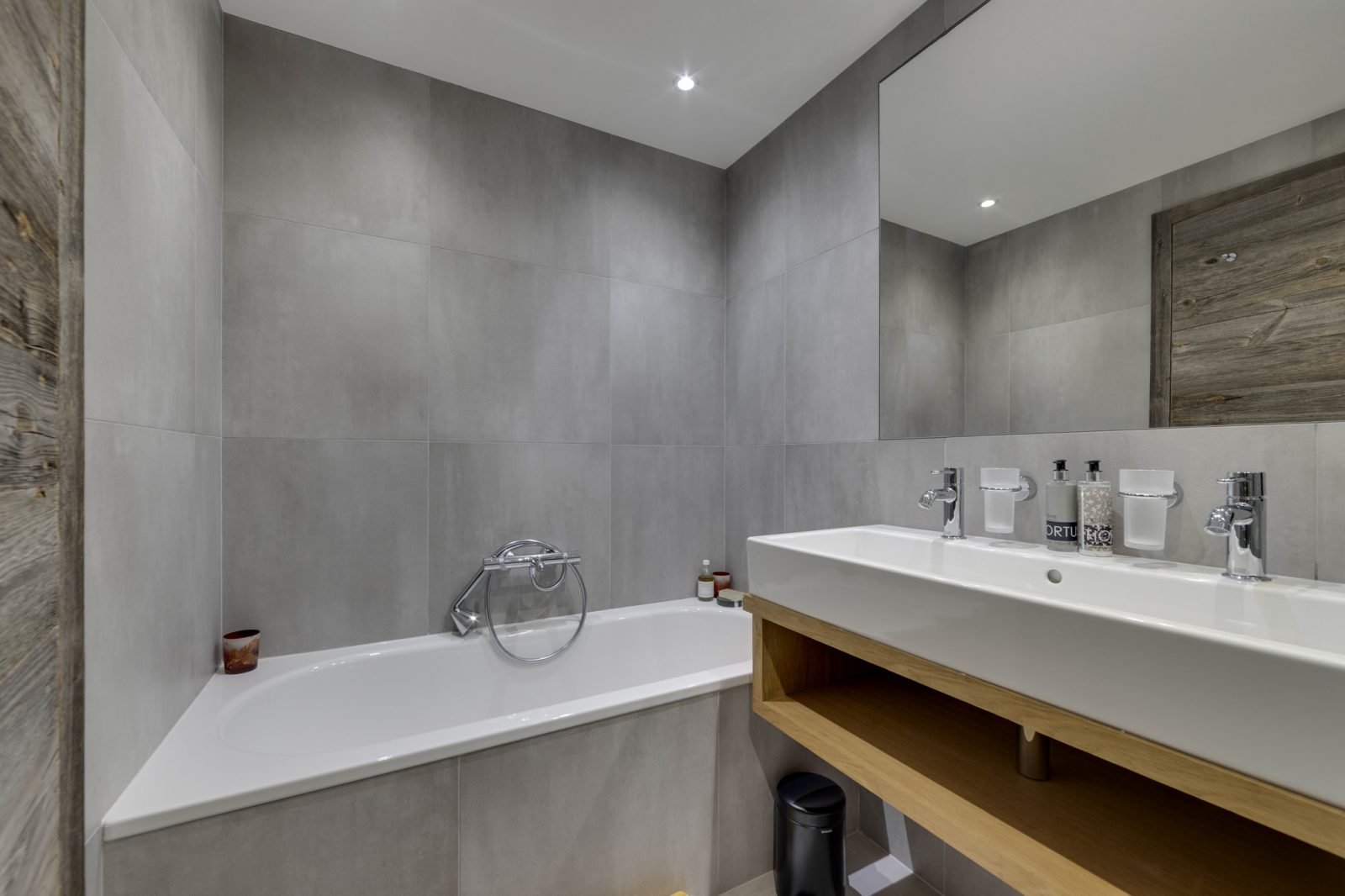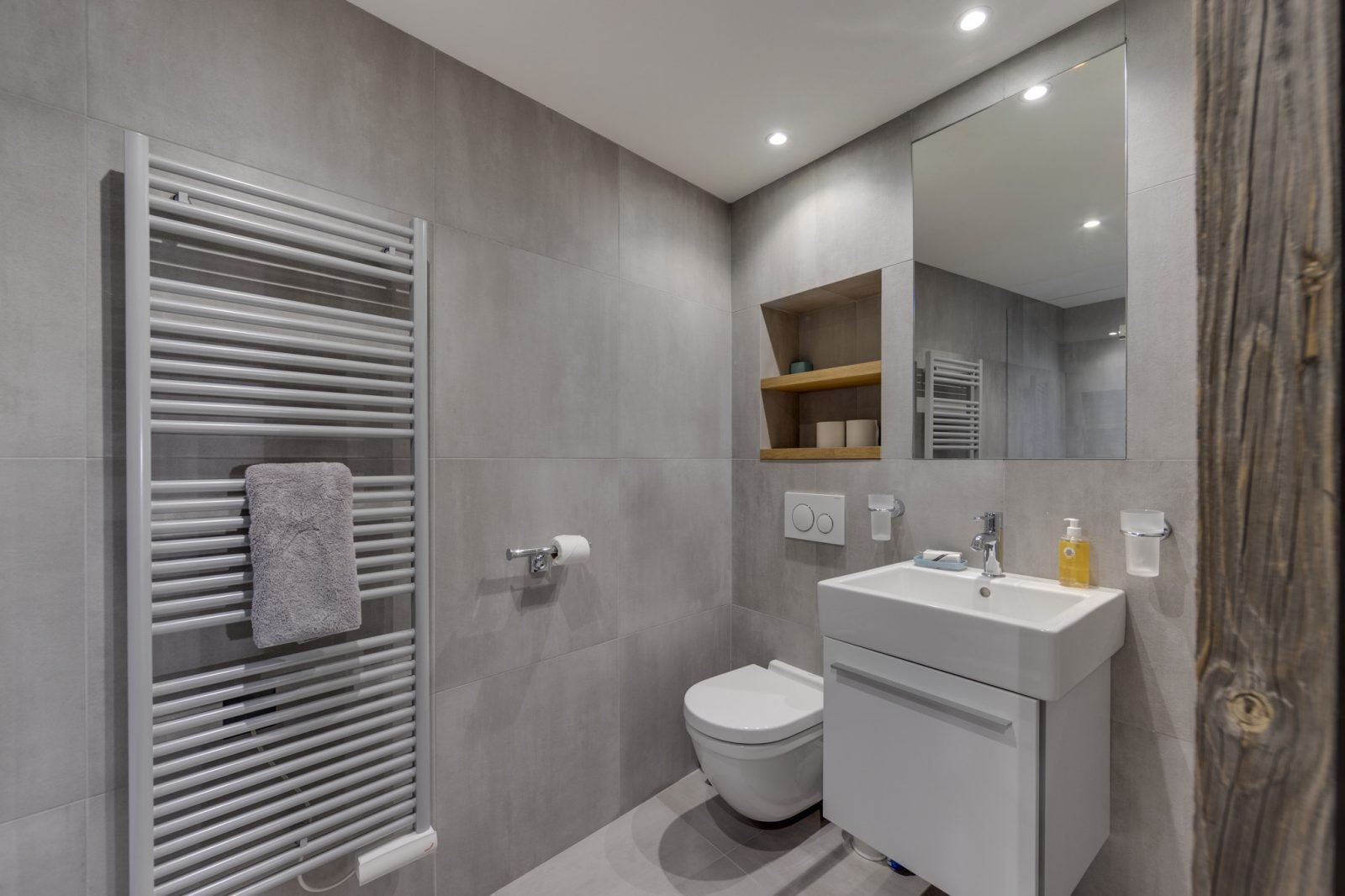Soleil Levant is a stylish and spacious ski-in ski-out apartment located above the funicular in La Daille with spectacular views towards Solaise. It has been renovated to a very high standard and can sleep up to 12 guests in 6 bedrooms over two levels. On the upper level of the apartment you will find a beautifully light and airy open-plan living/dining/kitchen area which looks out onto a large terrace. There’s a lovely comfy corner sofa to relax in, as well as gorgeous hide-covered arm chairs, and a log-fire to make it extra cosy. For your entertainment there’s a smart TV and Sonos speakers. The well-equipped kitchen has a breakfast bar seating 3, and the dining table seats up to 12.