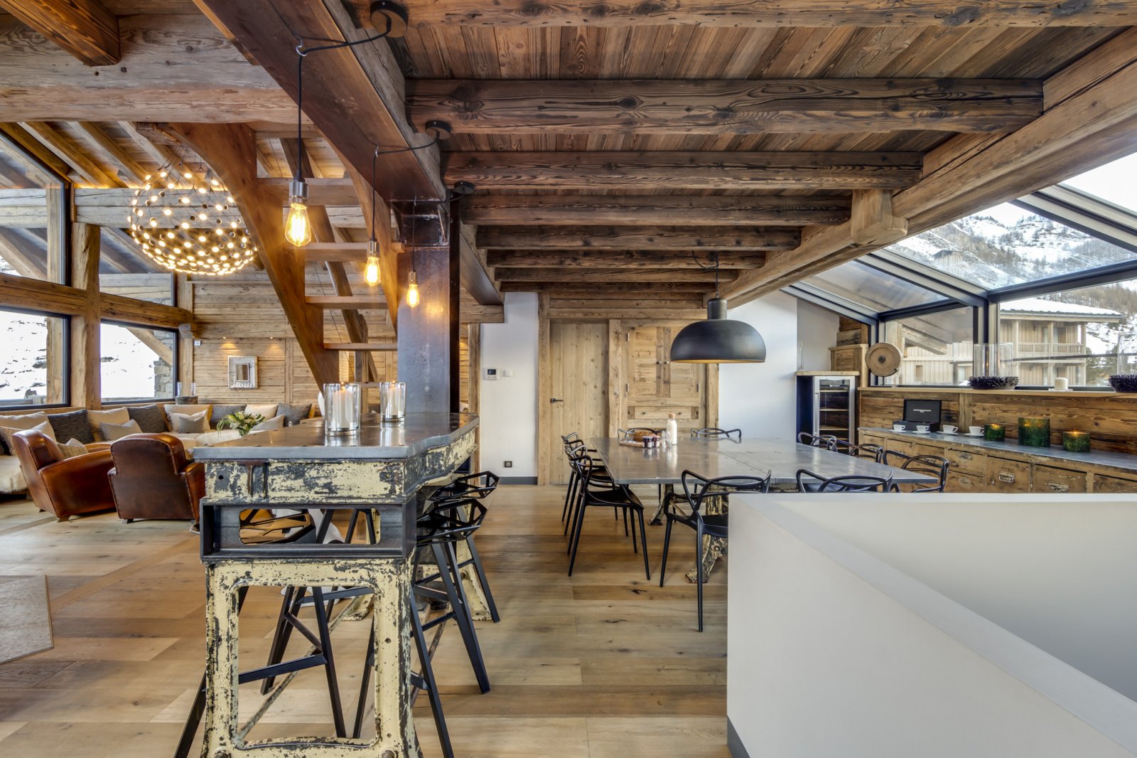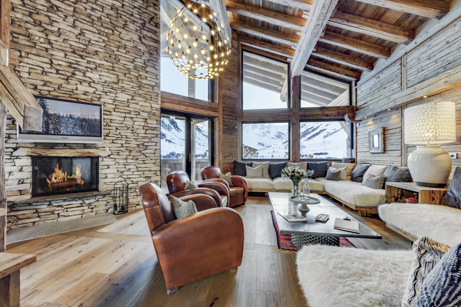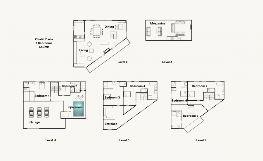 The chalet is proudly set over five levels. The main entrance is on the west facing side of the chalet and leads straight into the cloakroom and ski room. All the bedrooms in the chalet are en-suite and feature reclaimed wood and natural Vanoise stone tiles. On the ground floor there are two large bedrooms which can both be configured as twin or kings. Three more bedrooms can be found moving up to the next floor, one having a stunning south facing balcony. The main living floor is on the second floor and is truly spectacular, with towering double height windows bathing the living space in afternoon sun. The fireplace creates a focal point for the room and features a wide heated terrace delivering some of the most privileged views in the valley.