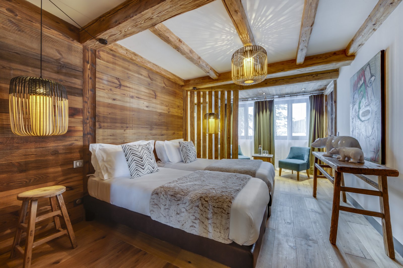 In chalet Daria there is a band of windows above the dining table which means the mountains accompany diners from above. The higher floor provides a large mezzanine area where you will find a place to relax and is perfect for children to play in the evening. Returning back to the lowest level you will find two further bedrooms, both of which can be configured as kings or twins. On this level, soothing spa facilities, a swimming pool with contraflow system, a moroccan hammam and a massage room for in-house treatments can be found. There is also a large covered parking area for up to three cars.