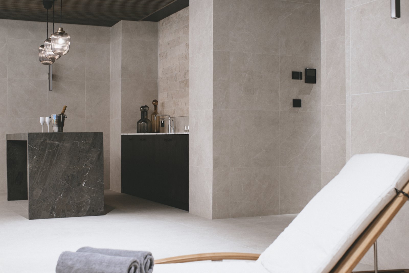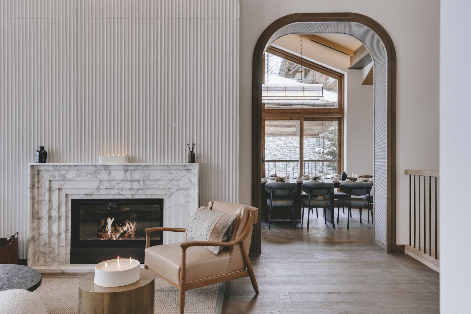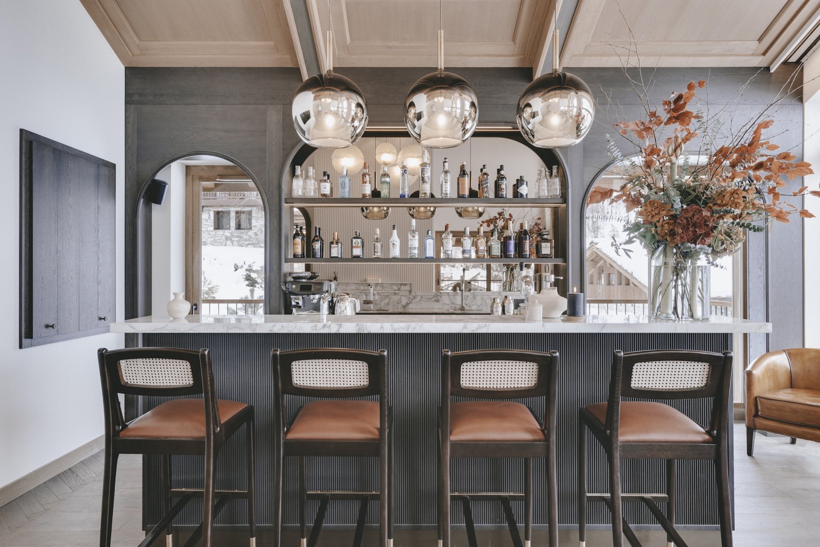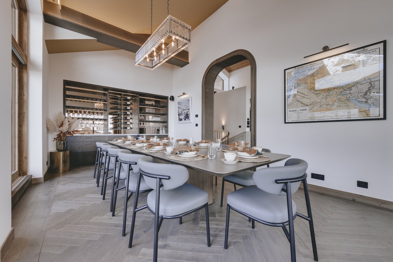 The centre piece of the chalet is the magnificent bar where you can sit and sip cocktails prior to dinner service. The imposing black run, La Face is lluminated at night and provides the atmospheric backdrop to the Dining Room.