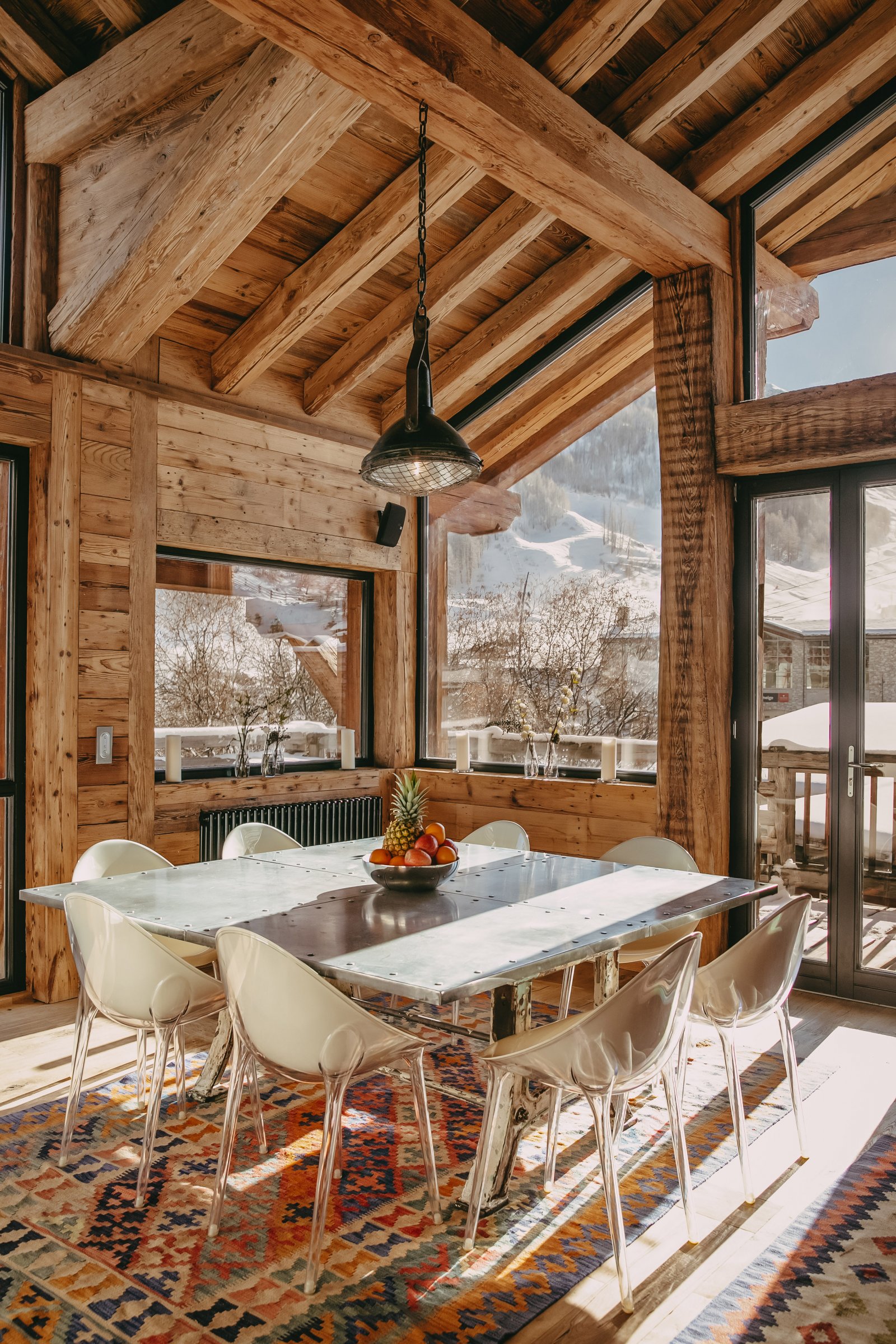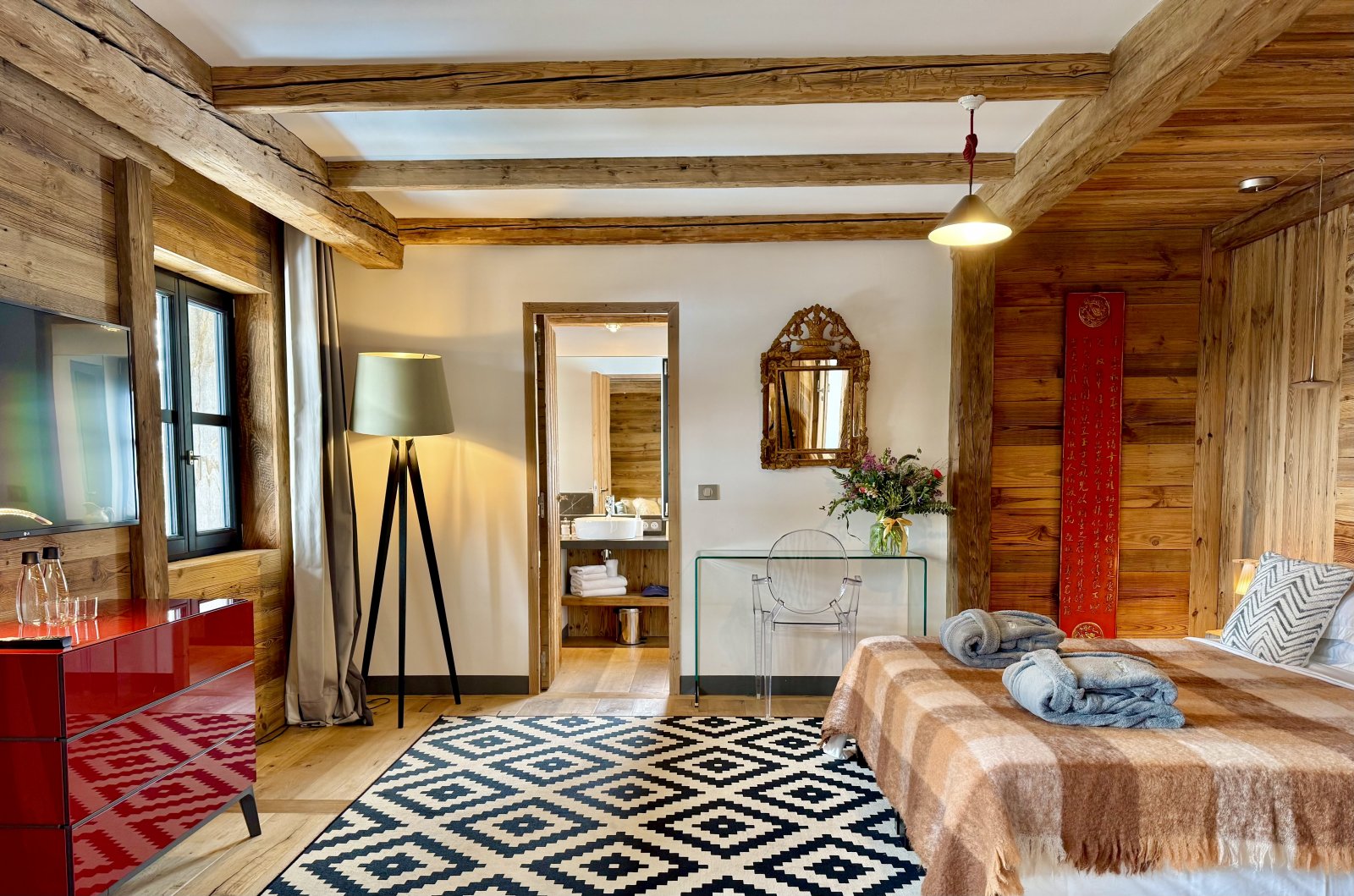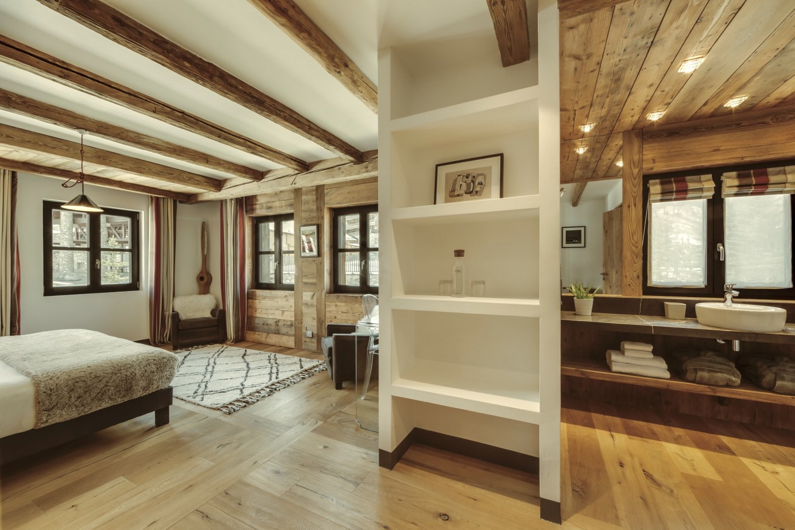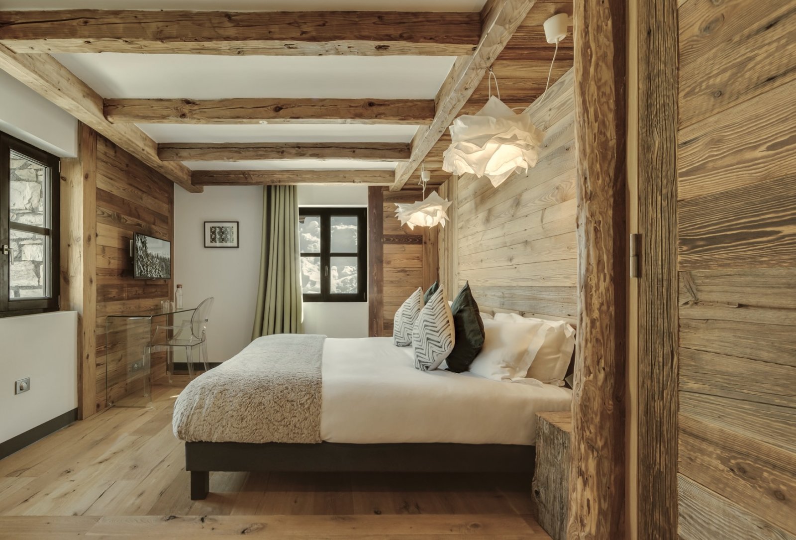 Shar-Pei is all about the spectacular light that enters through the south facing windows on the top floor. Huge reclaimed wood beams and a wrap-around terrace really gives the feeling of space and the design draws the surrounding mountains into the chalet. Natural stone and wood floors harmonise with the rawness of the surrounding mountains, and the soft cosy linens and natural wools combine beautifully with bespoke industrial pieces that have been built and designed especially for the property from a family cherry farm near Paris. Michel Covarel spectacularly captures a timeless feel with his architecture and delivers time after time and Shar-Pei is no exception. You don’t really need many works of art on the walls here because nature has provided them all around.