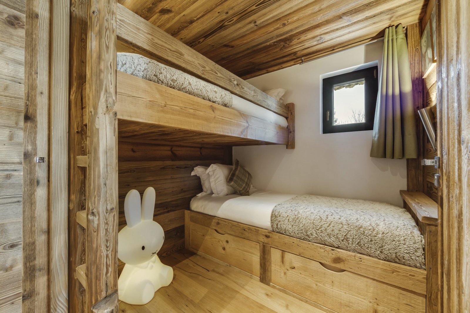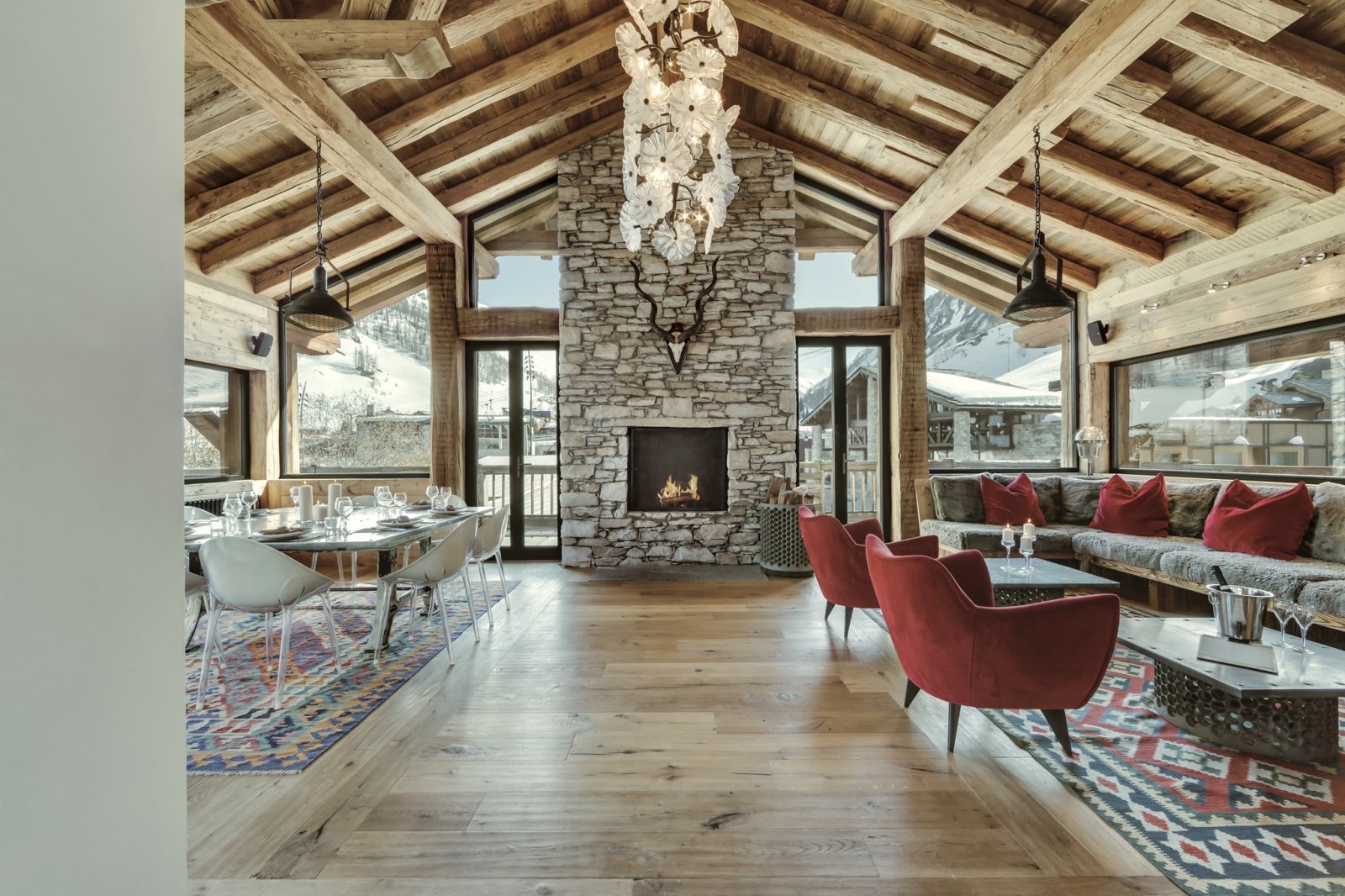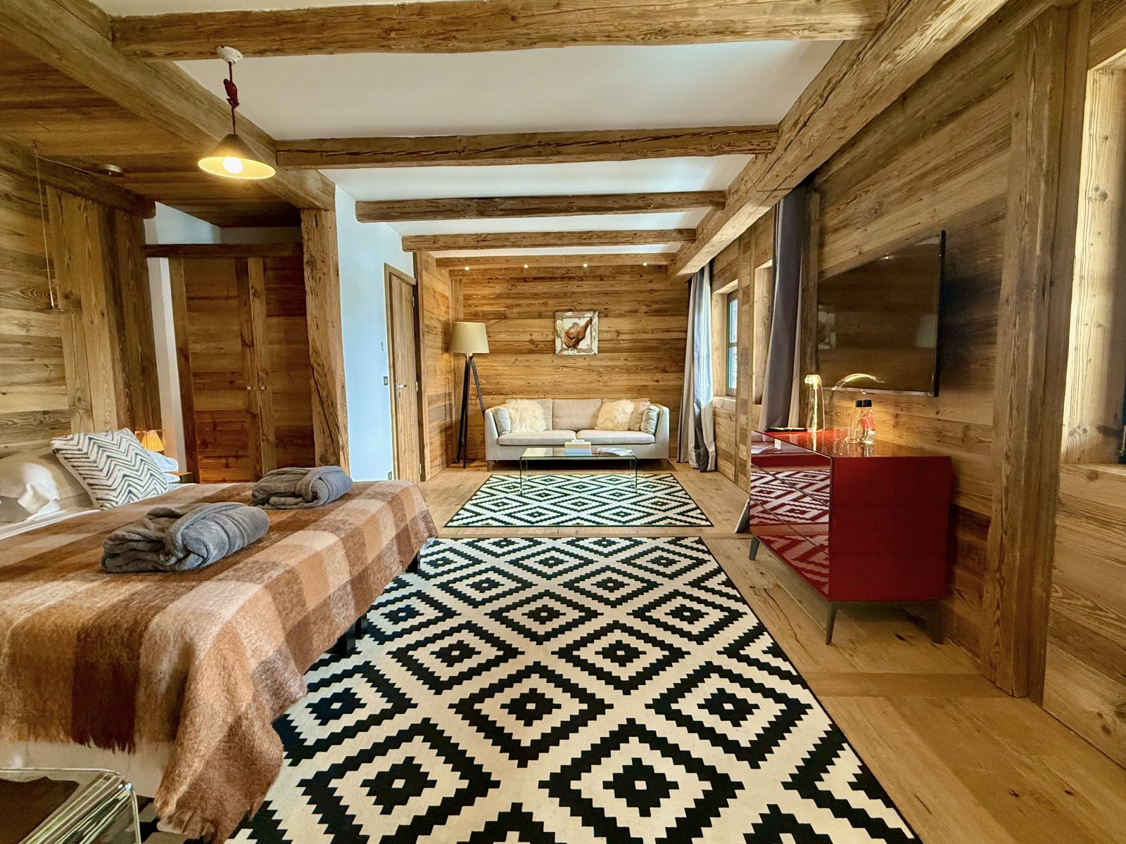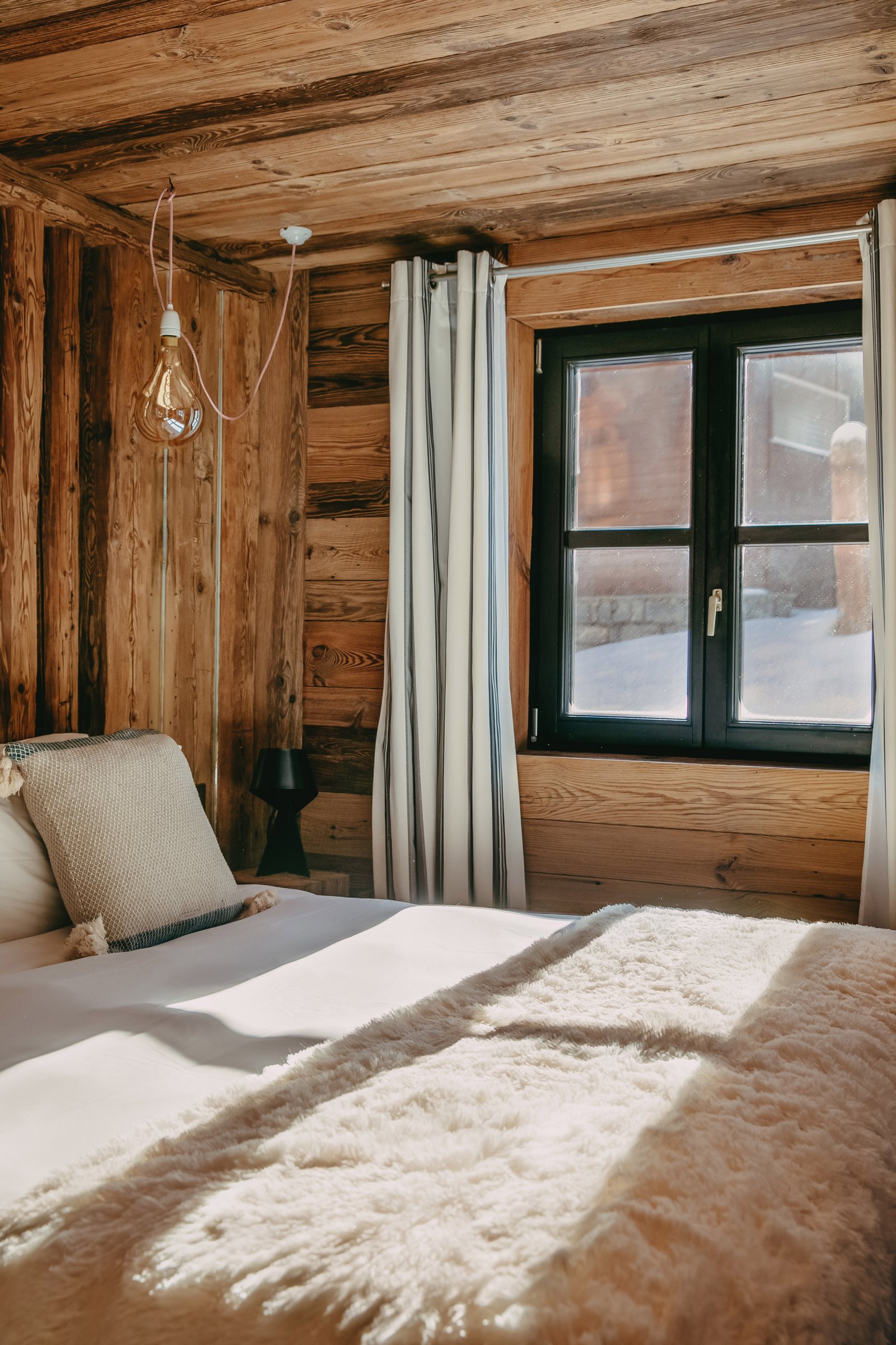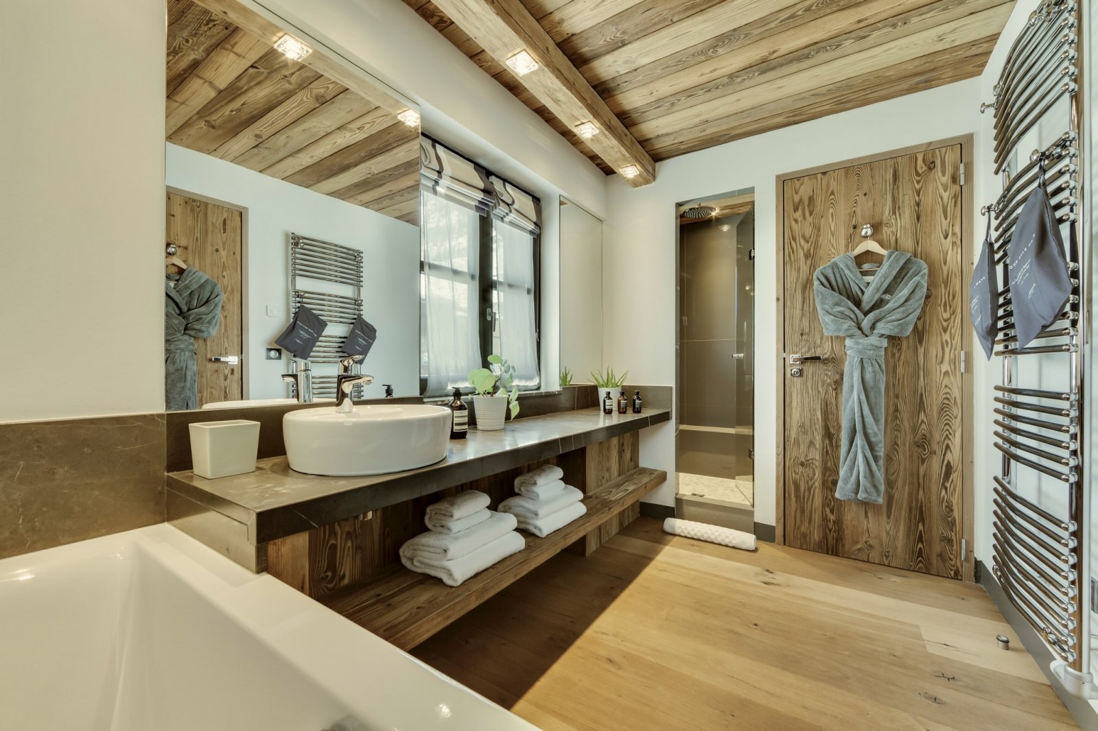Shar-Pei is all about the spectacular light that enters through the south facing windows on the top floor. Huge reclaimed wood beams and a wrap-around terrace really gives the feeling of space and the design draws the surrounding mountains into the chalet. Natural stone and wood floors harmonise with the rawness of the surrounding mountains, and the soft cosy linens and natural wools combine beautifully with bespoke industrial pieces that have been built and designed especially for the property from a family cherry farm near Paris. Michel Covarel spectacularly captures a timeless feel with his architecture and delivers time after time and Shar-Pei is no exception. You don’t really need many works of art on the walls here because nature has provided them all around.