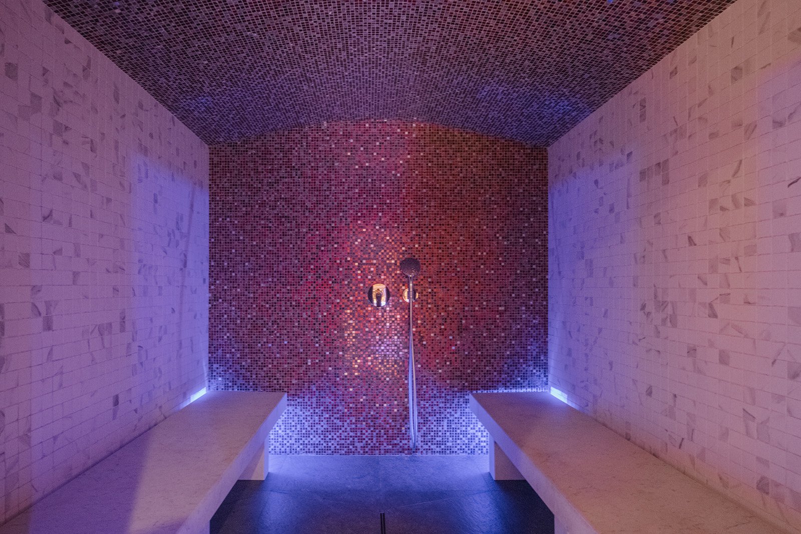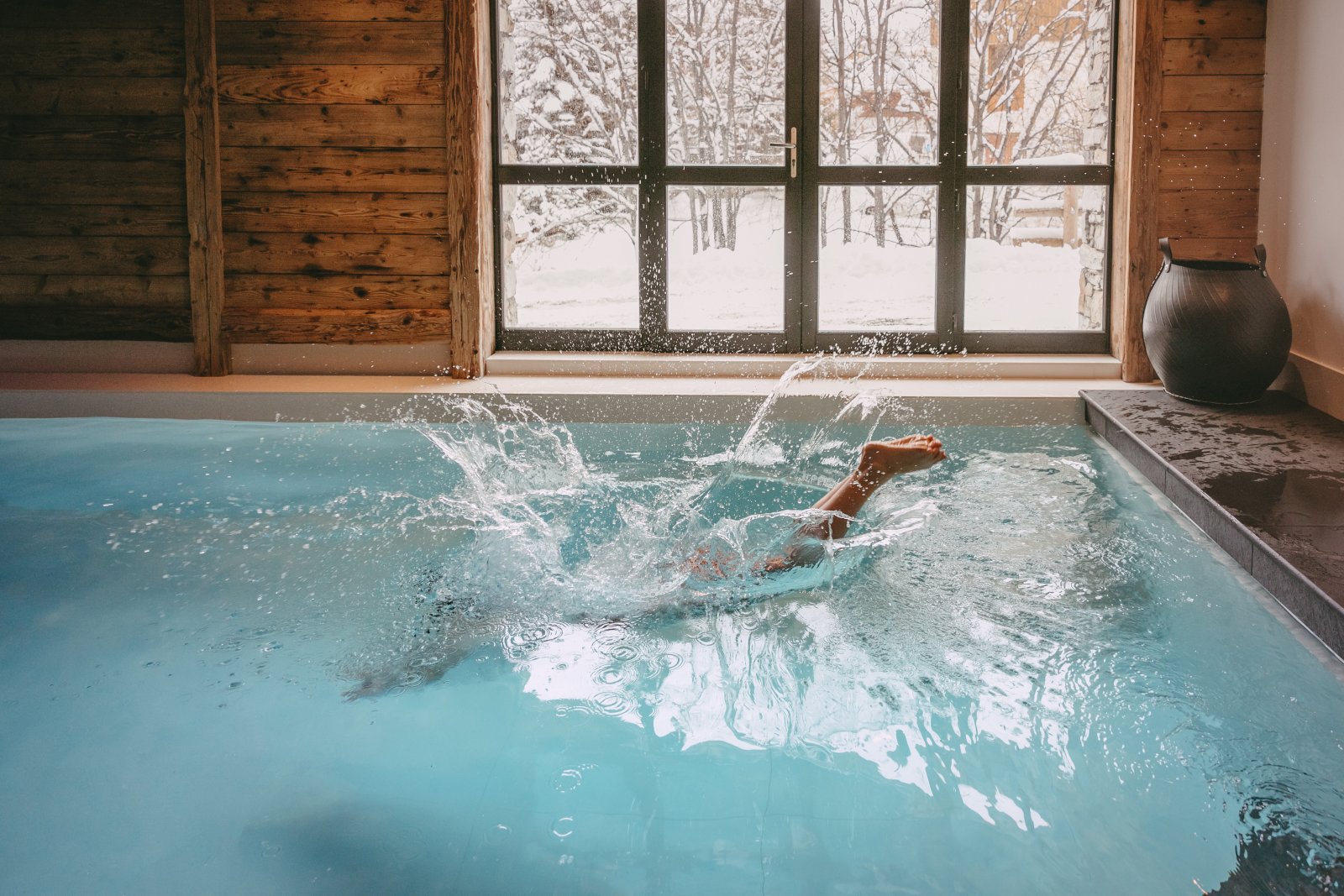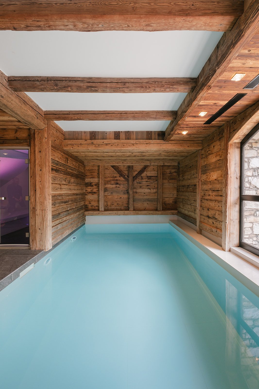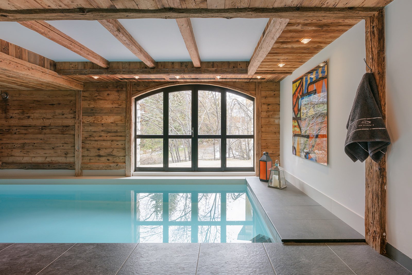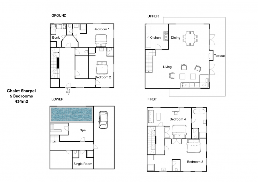 The top floor is a huge open plan living and dining space which has a double height fireplace and a dramatic floral chandelier. The space truly transforms after dark with the village lighting up all around the chalet. Nighttime is certainly special in Shar-Pei, the views of the Solaise and Bellvarde mountains are hugely imposing and add lots of drama to your evening supper. There are five bedrooms in total, four ensuite and one additional bunk room suitable for children. Two ensuite bedrooms are situated on the ground floor and this is where you will find the extra room attached to the bedroom that overlooks the river. Leading up to the first floor is where you will find two expansive rooms each with their own bathrooms and amazing views, the river side room has a more suite feel to it. All of the bedrooms can be configured as a king or a twin and of course come with their own private bathrooms with the exception of the bunk room which shares with the adjoining room. Down to the basement level you will find your private spa area. The 6mx3m pool is a great place to relax after a day on the hill and overlooks the stream and there is also a Turkish tiled hammam to soothe the bones. Massages can taken in this area or equally in the privacy of your room. Of course we have our driving service on hand should you require it.