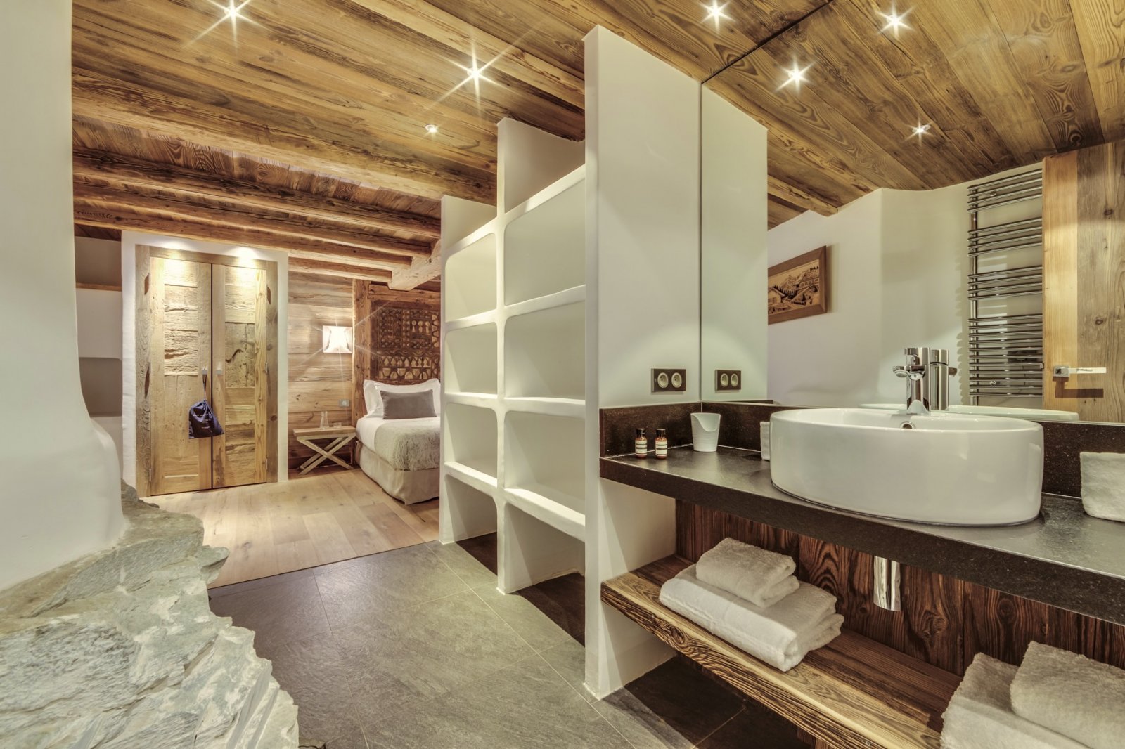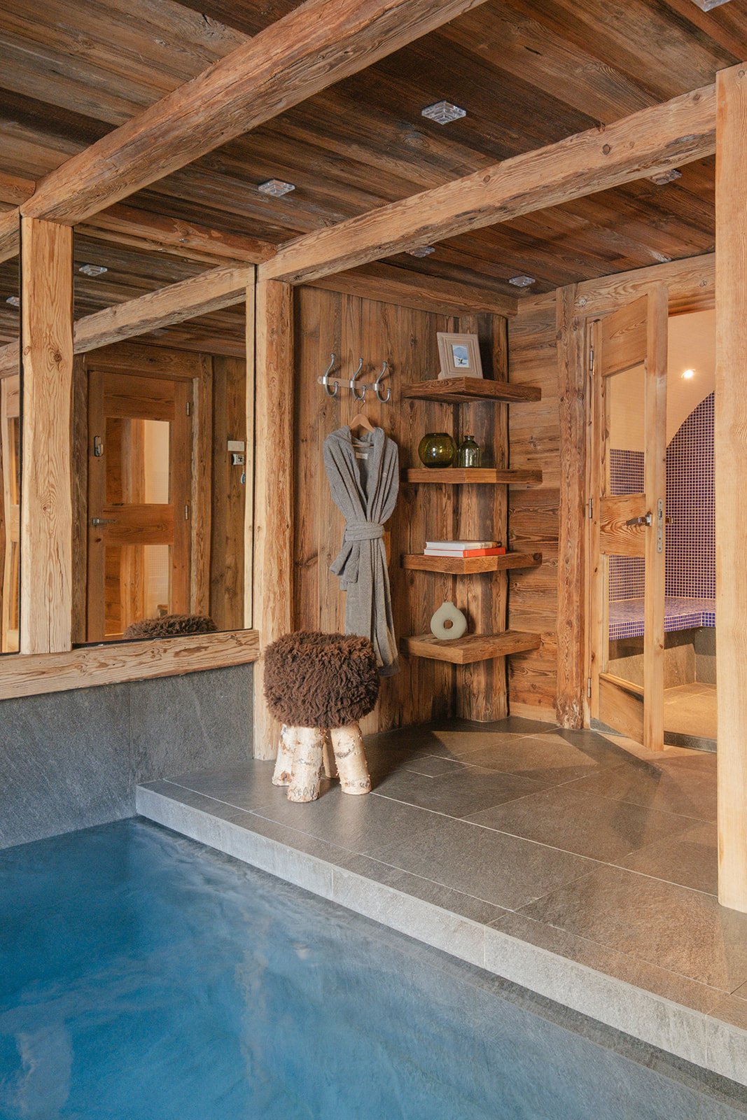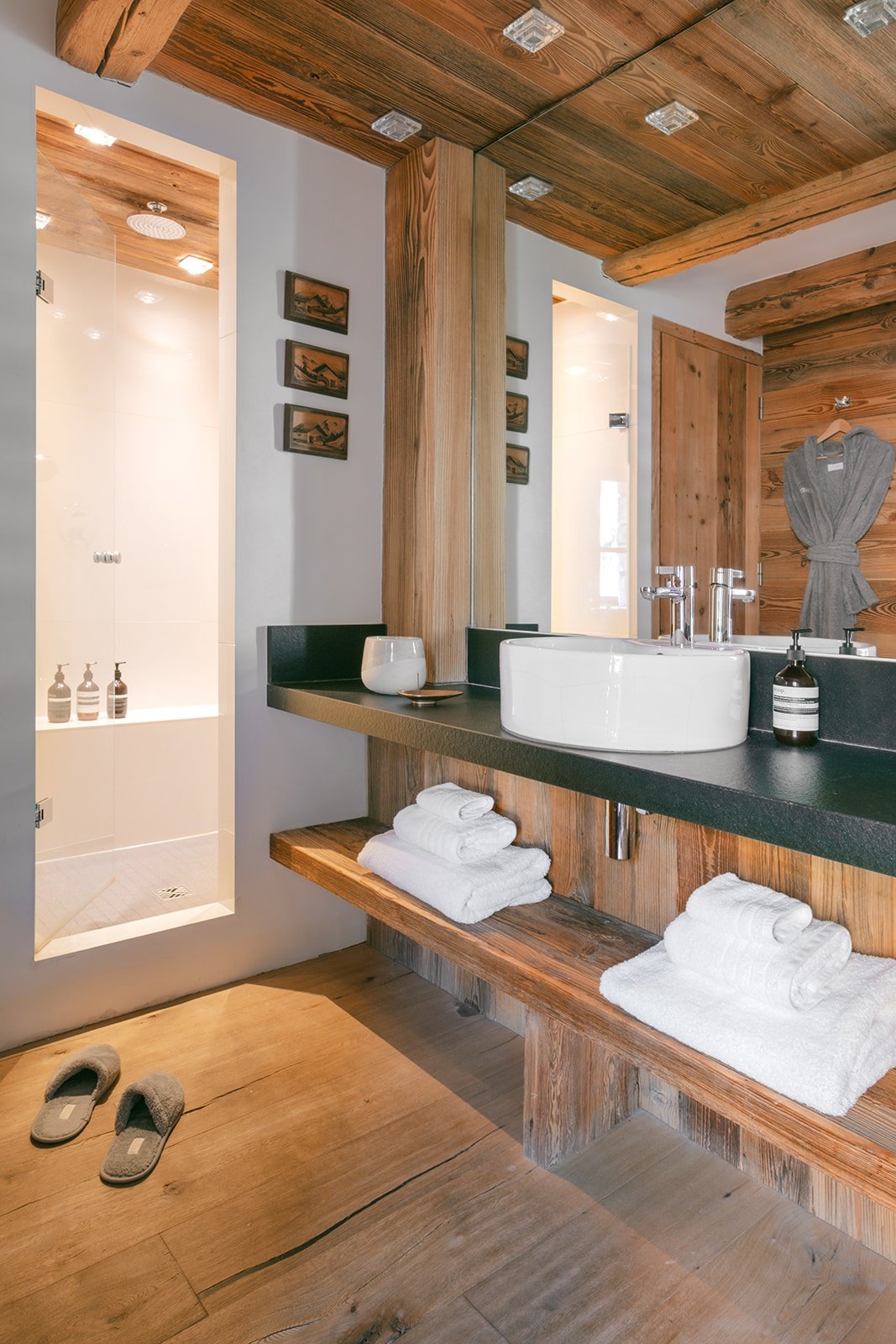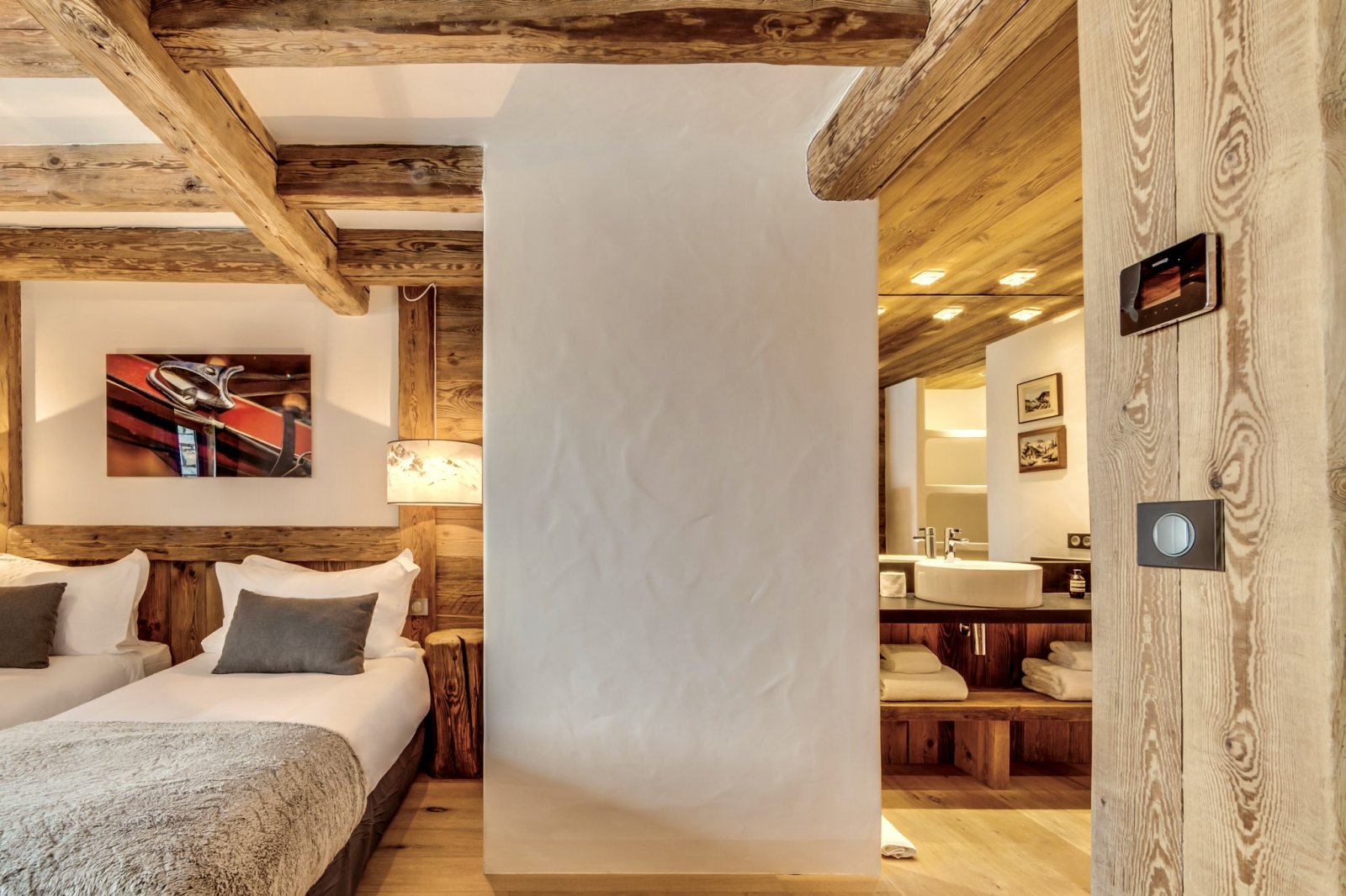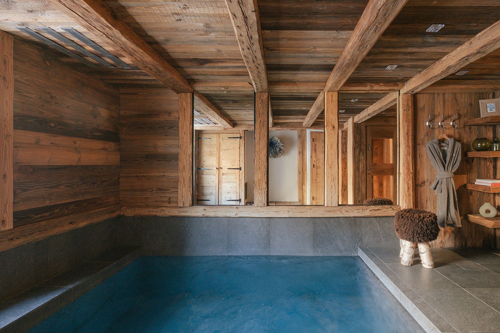 Situated beautifully next to her sister chalet, Rive Gauche, you enter the reception area and ski room where you will find a simple place for ski storage and all important boot warmers. There is also a master en-suite bedroom with king/twin beds and a wrap around balcony on this level. Moving down a level you will find three large king/twin rooms, each with their own personality and style; one contains an antique carved door headboard and the rock face of the chalet that runs along the inside of the room. Heading down again to the lowest level you will find a private bedroom with stunning views of the old bridge and a small terrace. You will also find an indoor pool with a flow machine and a relaxing steam room. The highest floor of the chalet contains the large open plan living and dining area. With a trio aspect there is huge amounts of light that floods into this floor. The reclaimed wood table seats ten and there is also a card and games table for four. The log fireplace is a central focus for the room and there is a large flat screen television for catching up on sporting events or just watching a movie.