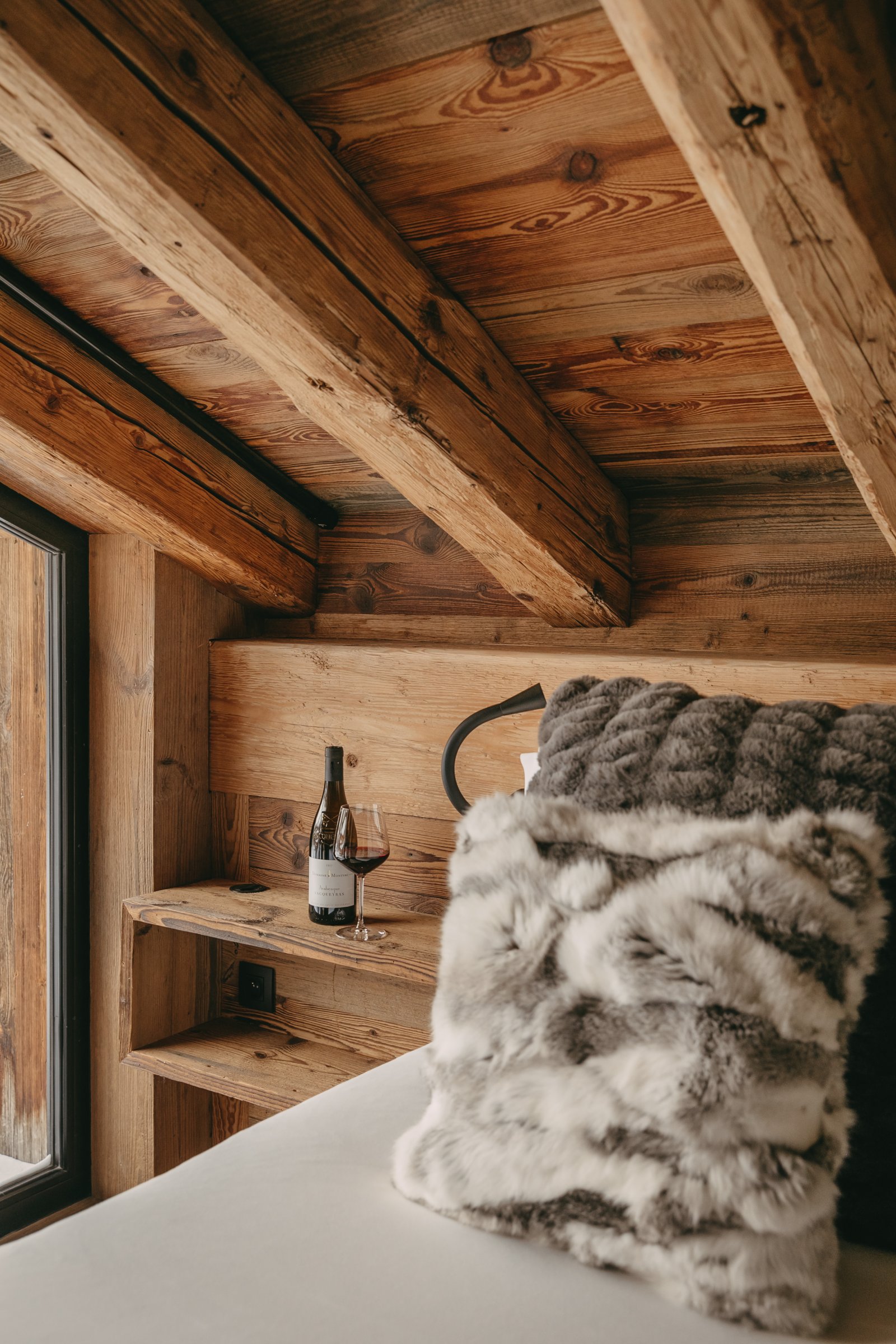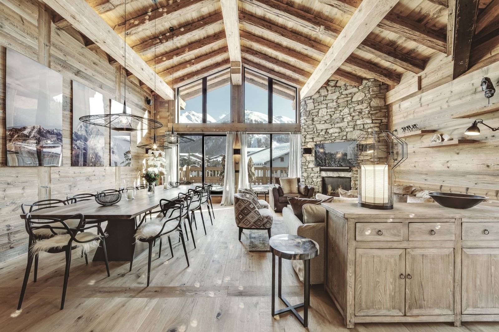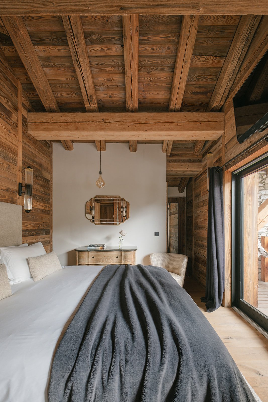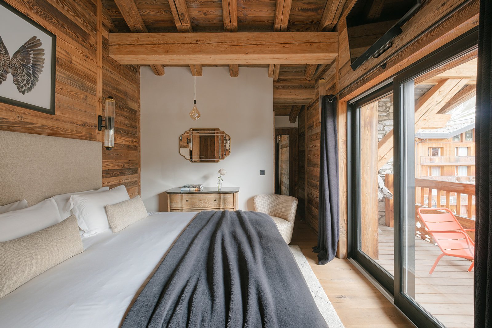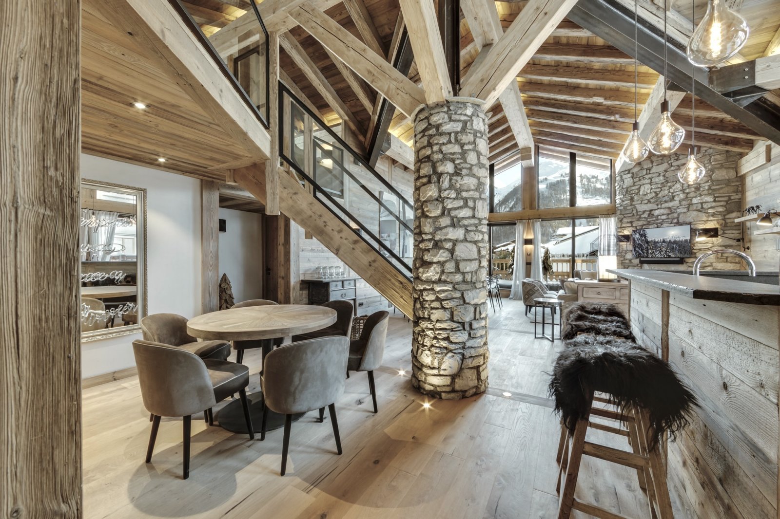 Rocca Penthouse is all about the views and spectacular light that filters through the interiors. Huge reclaimed wood beams and wrap-around balconies give depth and character to make this property simply fabulous. Enter the penthouse by a lift with a private key that opens direct into your property. The entrance level features an expansive open plan living and dining space with a centrally located fireplace and a beautiful dining table. The furnishings are pared back and thoughtful, beautiful ceramics mixing with reclaimed wood and cathedral windows on three aspects. Contemporary lamps and bespoke art feature throughout this floor and compliment the wooden interior.