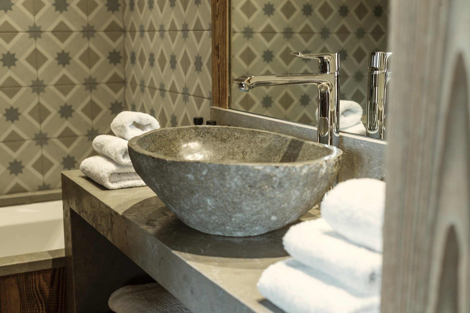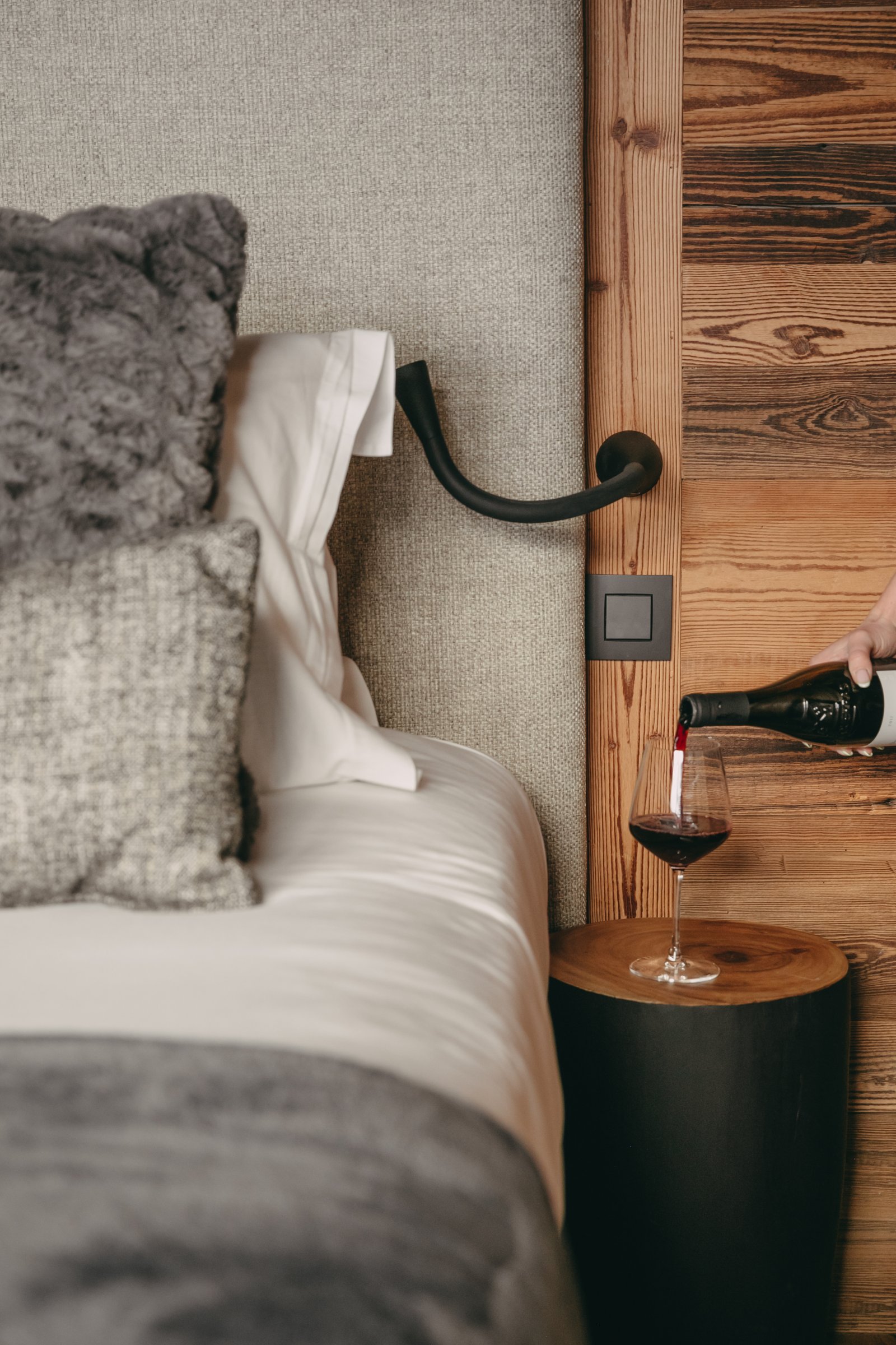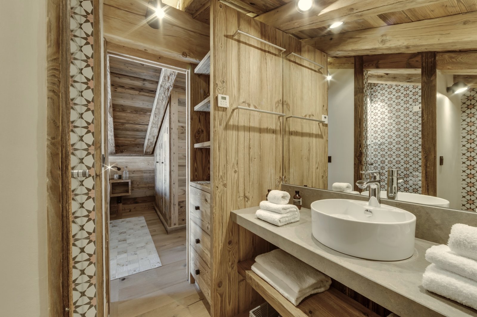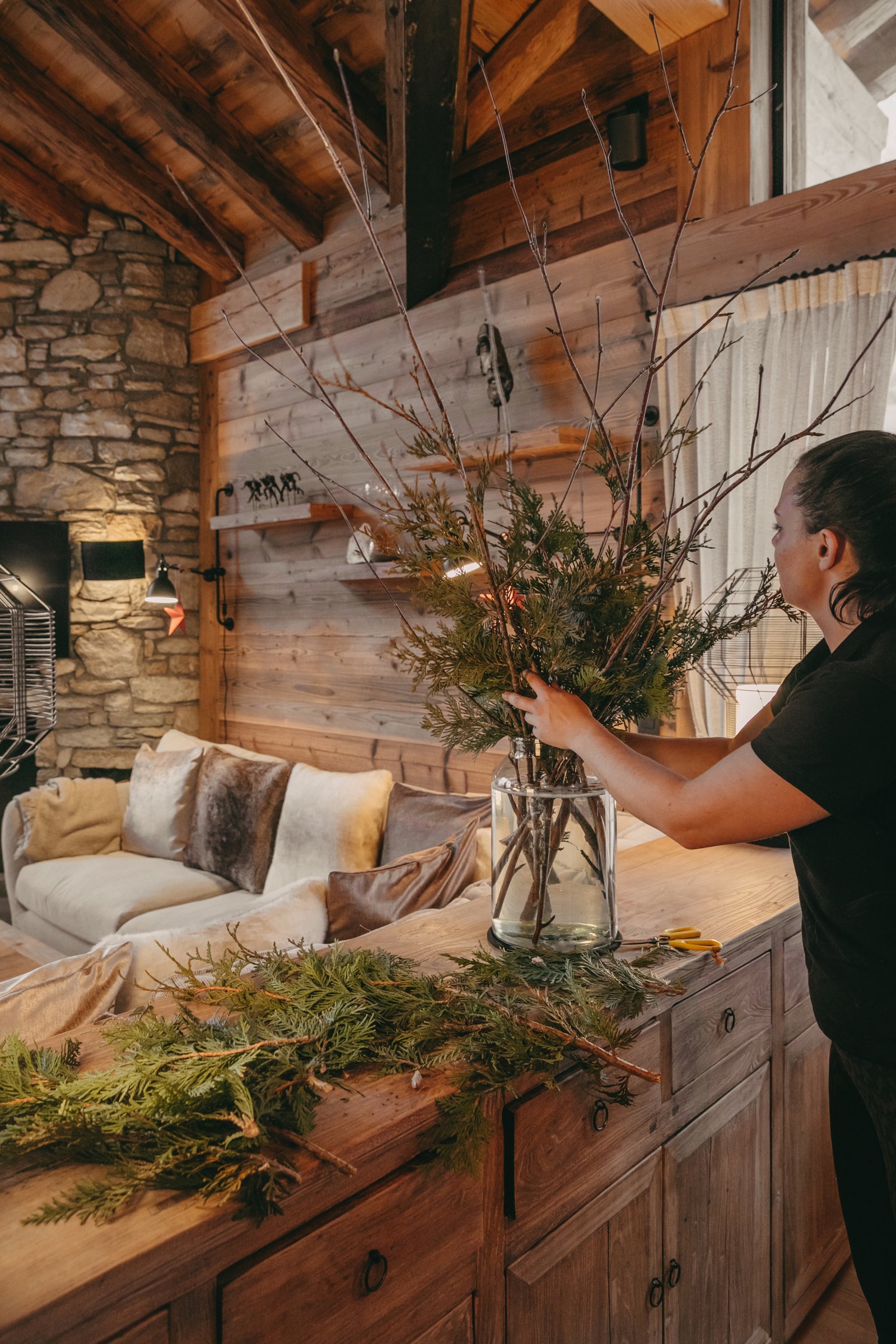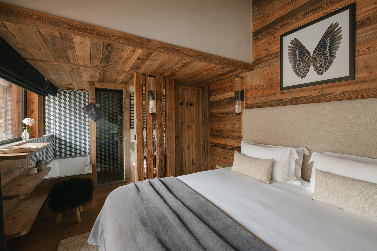 Rocca Penthouse is all about the views and spectacular light that filters through the interiors. Huge reclaimed wood beams and wrap-around balconies give depth and character to make this property simply fabulous. Enter the penthouse by a lift with a private key that opens direct into your property. The entrance level features an expansive open plan living and dining space with a centrally located fireplace and a beautiful dining table. The furnishings are pared back and thoughtful, beautiful ceramics mixing with reclaimed wood and cathedral windows on three aspects. Contemporary lamps and bespoke art feature throughout this floor and compliment the wooden interior.