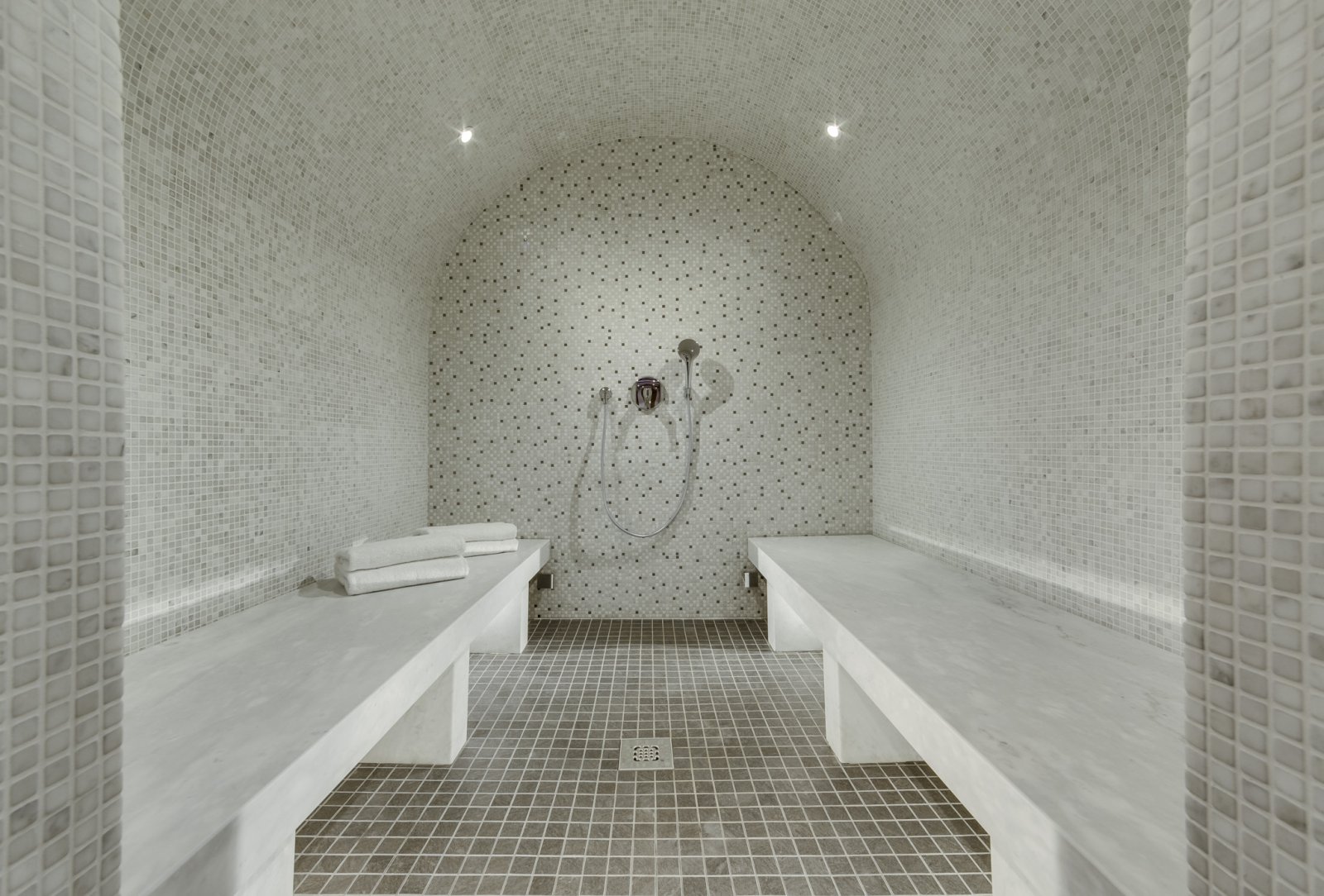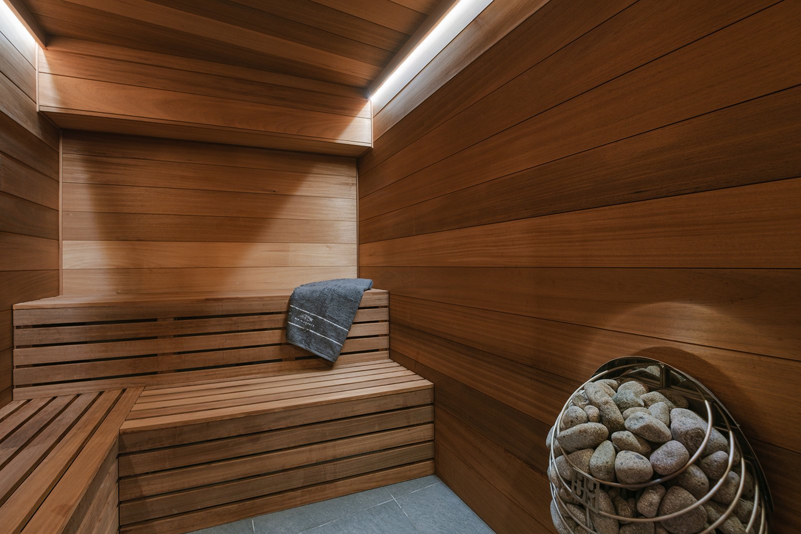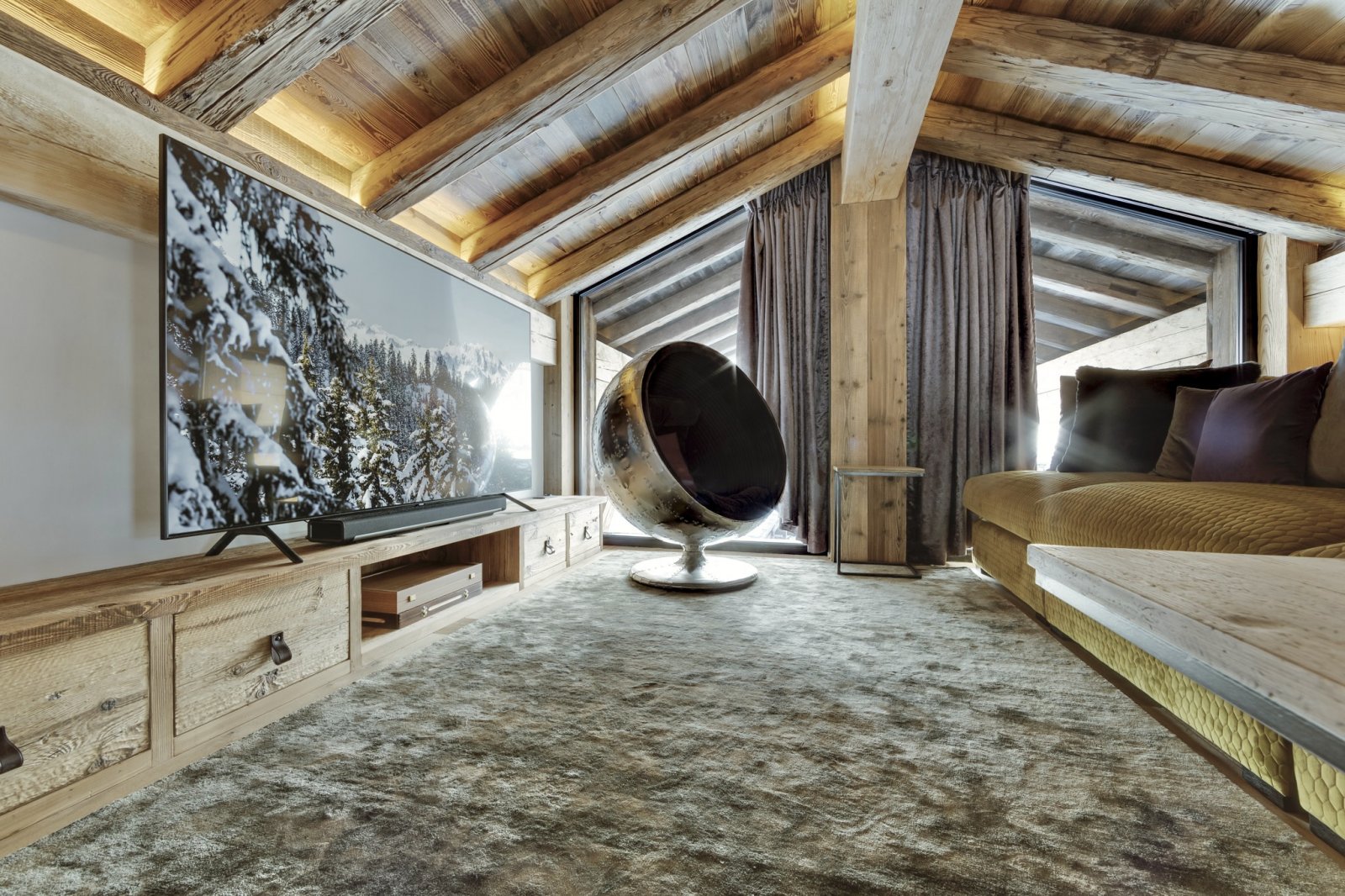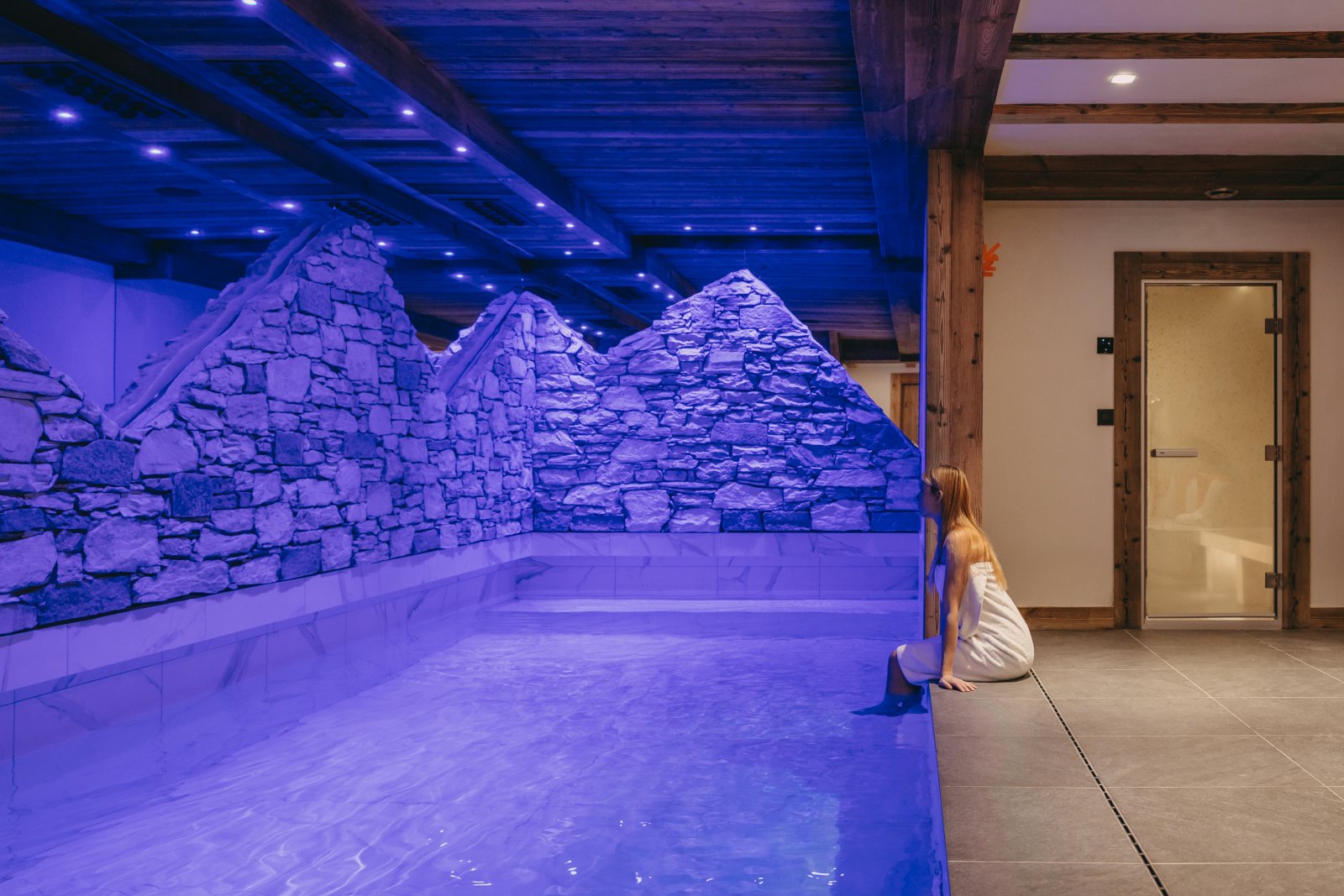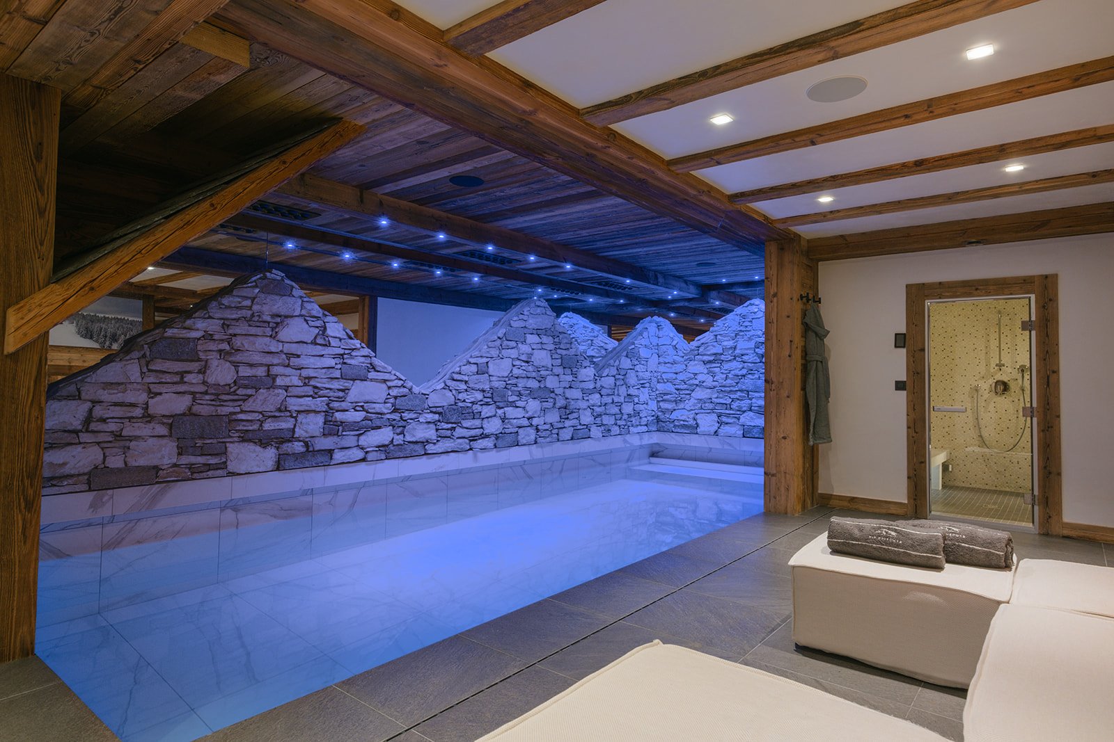 The five bedrooms are situated on three levels. Three bedrooms are situated off the central living space, a smaller bedroom in on the lower level and an open stairwell leads to the upper level where you find a cute bedroom that sits above the main living space with amazing views down towards the gorge of La Daille. All of the bedrooms can be configured as a king or a twin and of course come with their own private bathrooms. On the mezzanine level you will also discover a snug to watch tv or reading away from main living space, perfect for families with children. Taking the elevator down to the basement level you will find your private spa area. The large 8mx3m pool is a great place to relax after a day on the hill and there is also a Turkish tiled hammam to soothe the bones. Massages can taken in this area or equally in the privacy of your room. There is a covered car parking space which is included with the penthouse, and of course we have our driving service on hand should you require it.