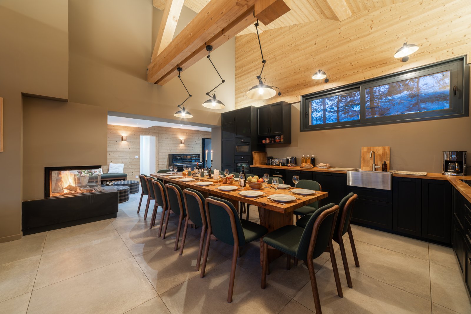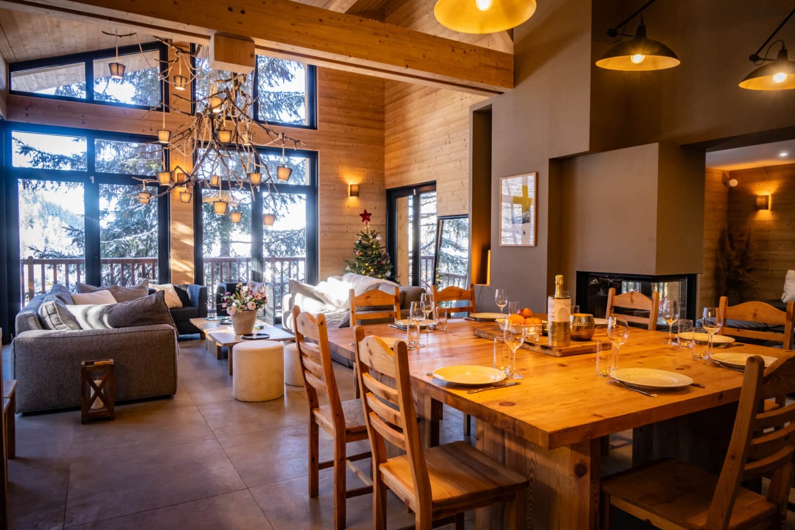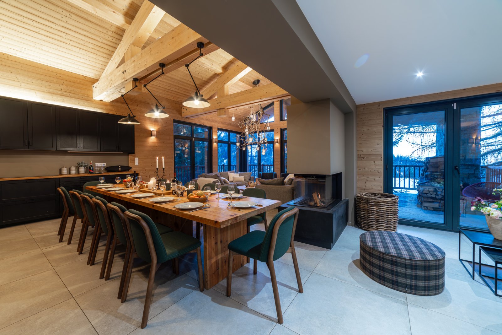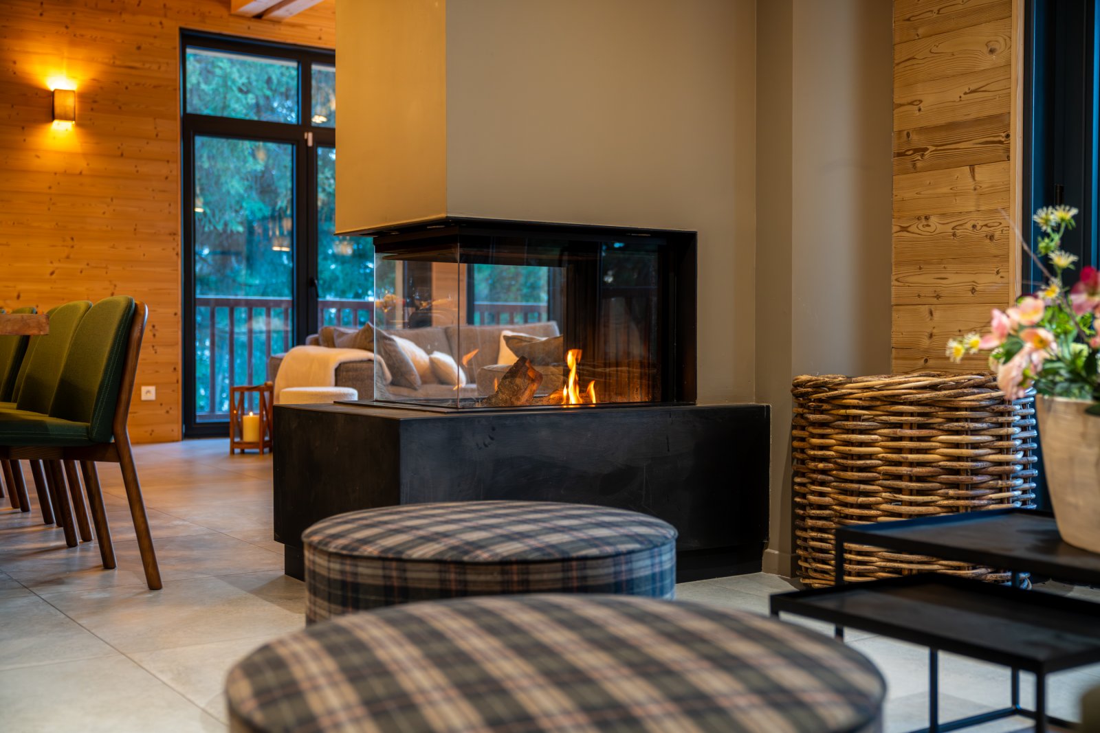 Le grand salon est lumineux avec de grandes baies vitrées et un toit cathédrale avec la charpente apparente. Il vous permettra de profiter d’un environnement ressourçant avec une superbe vue sur la montagne et les sapins enneigés. La chaleur du bois intérieur, les canapés moelleux et la cheminée design à trois faces vitrées vous offriront des moments de détente inégalés.