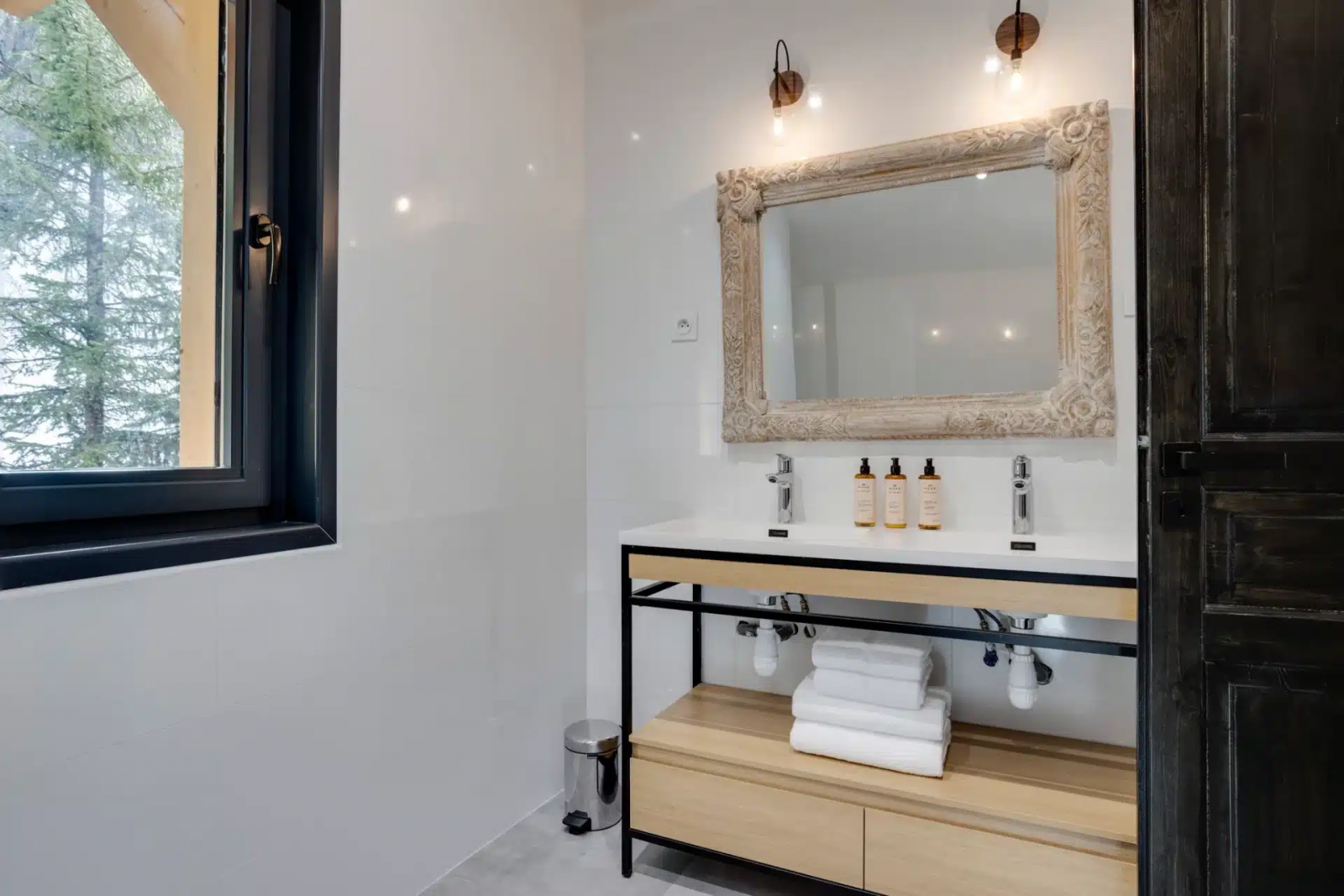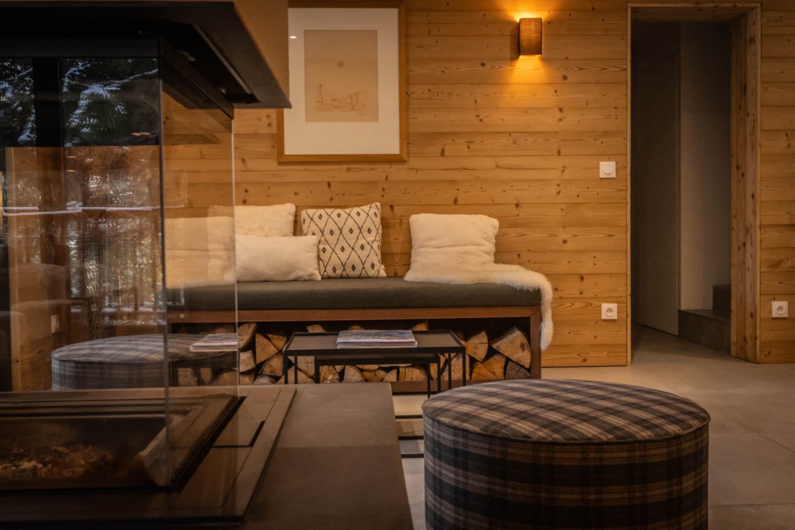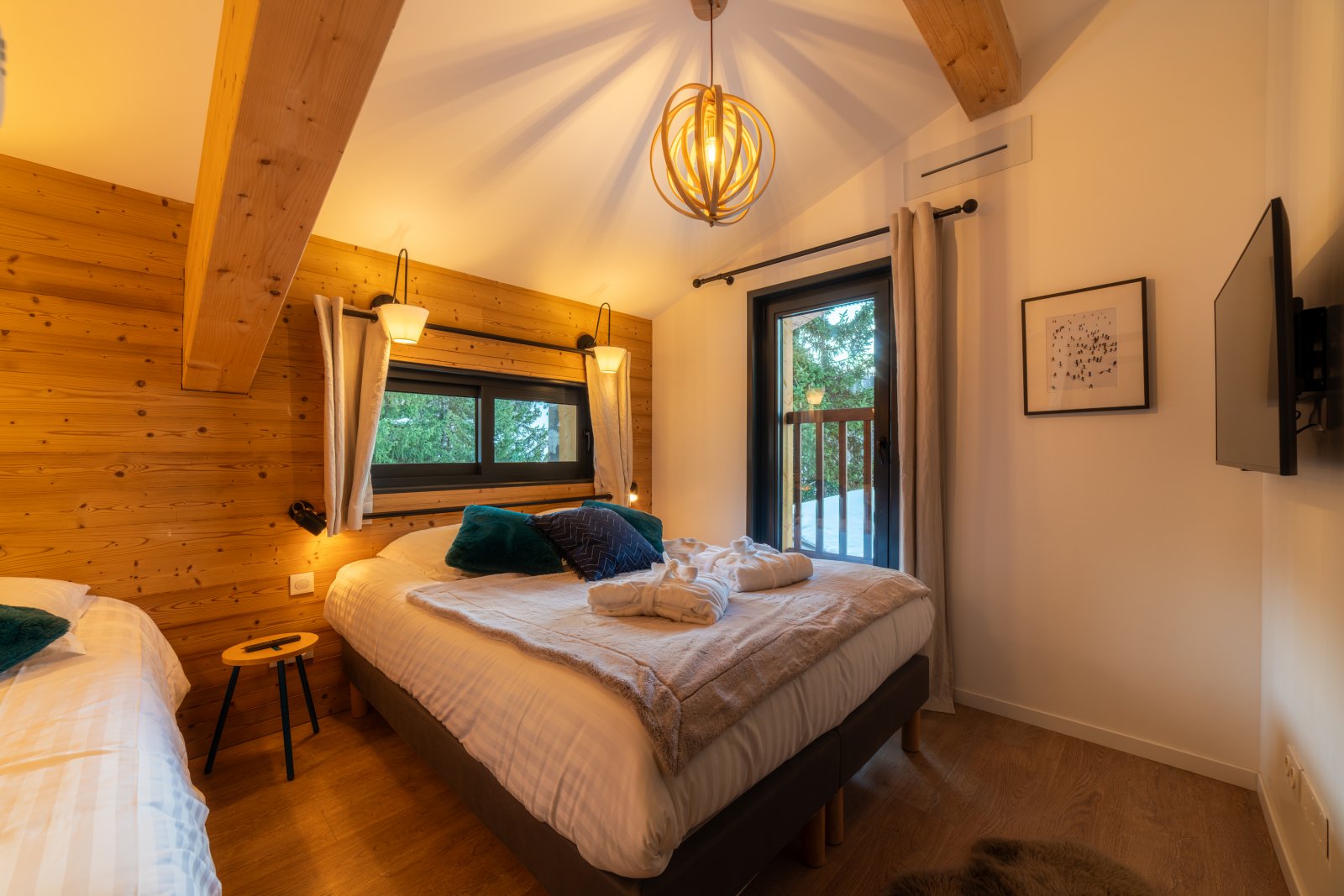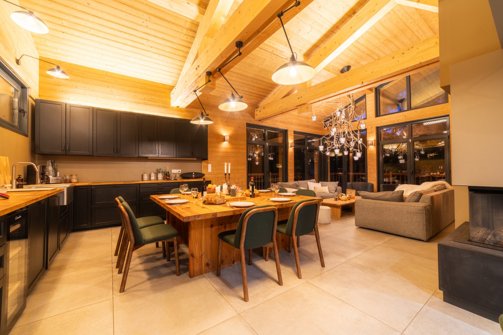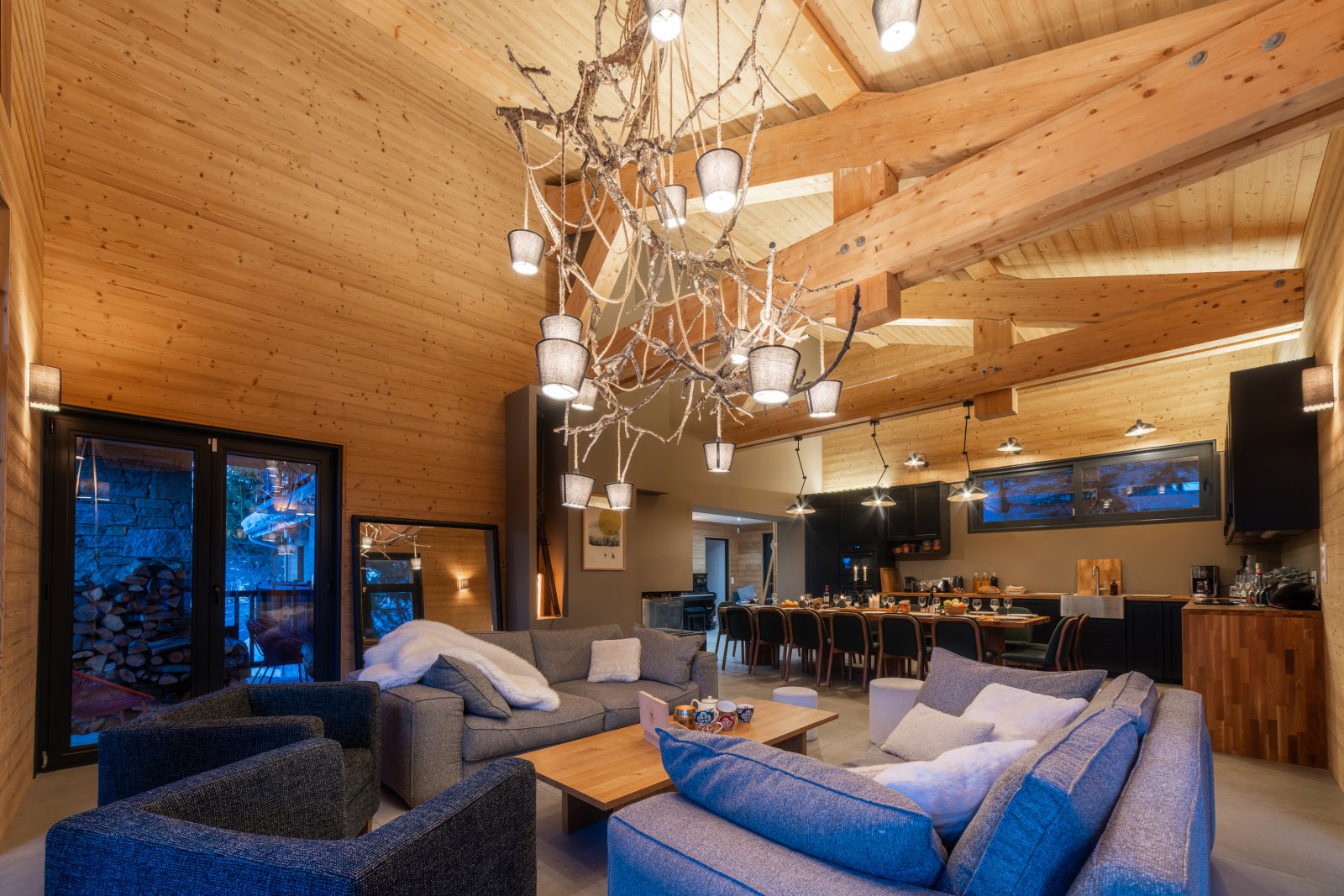 Le grand salon est lumineux avec de grandes baies vitrées et un toit cathédrale avec la charpente apparente. Il vous permettra de profiter d’un environnement ressourçant avec une superbe vue sur la montagne et les sapins enneigés. La chaleur du bois intérieur, les canapés moelleux et la cheminée design à trois faces vitrées vous offriront des moments de détente inégalés.