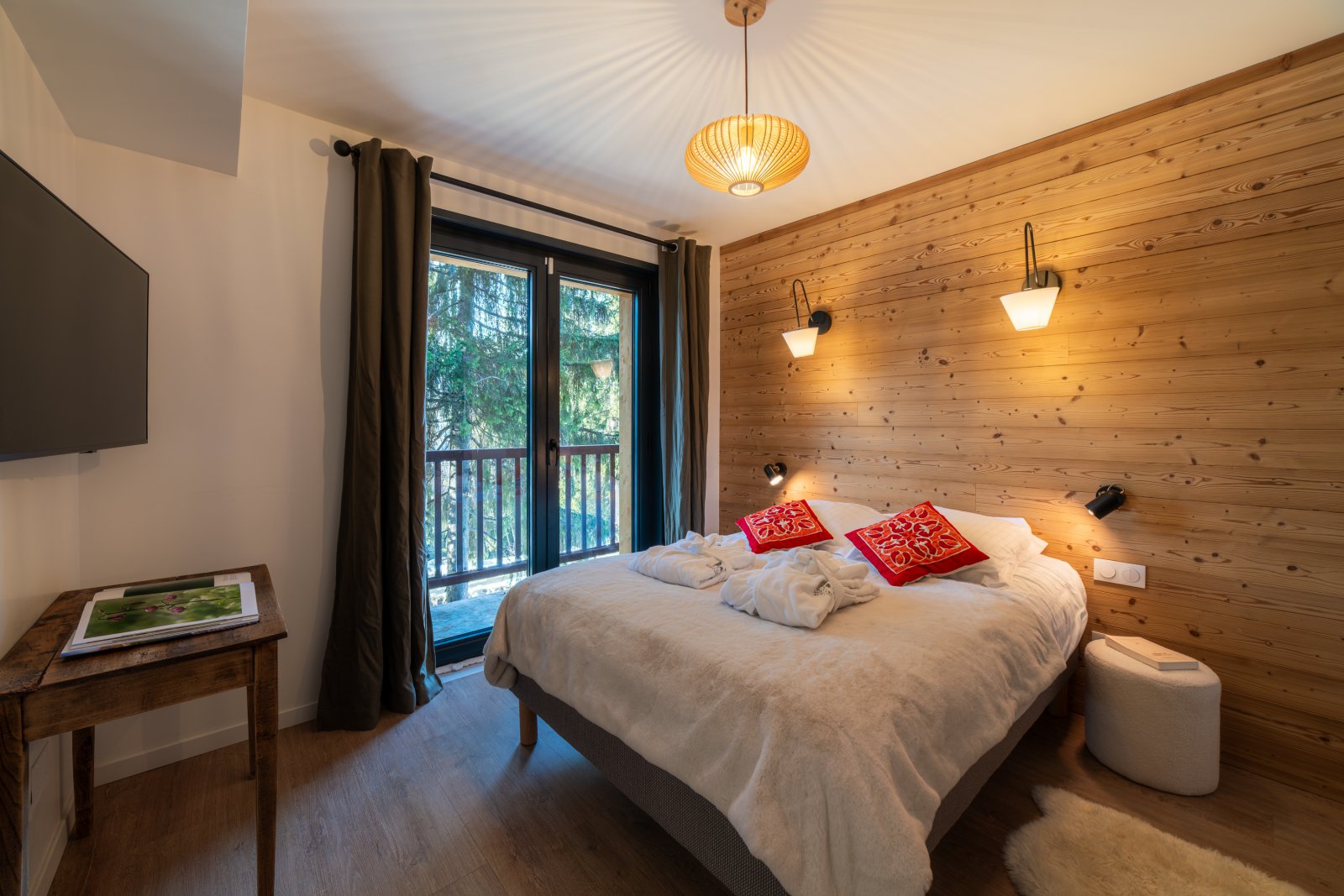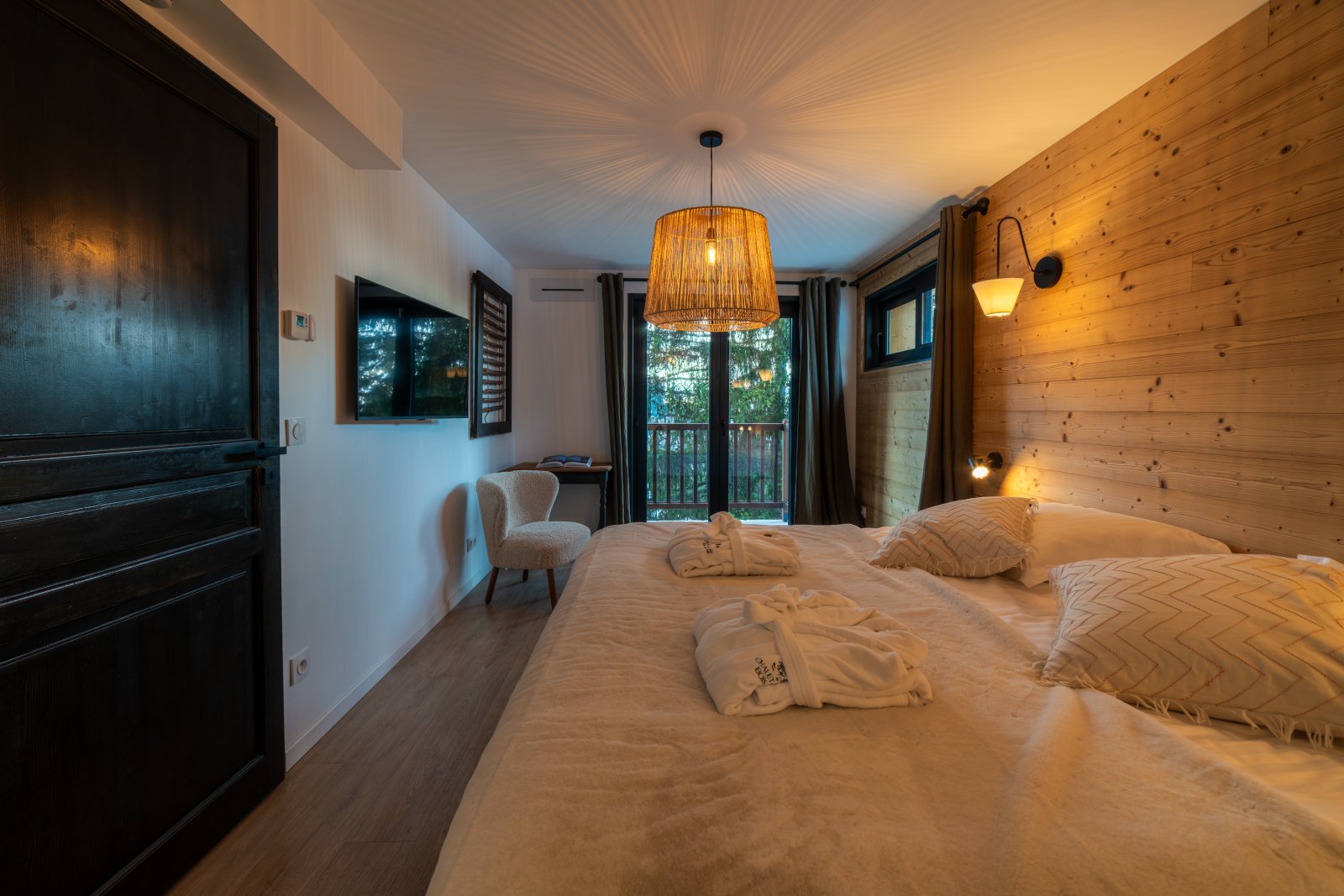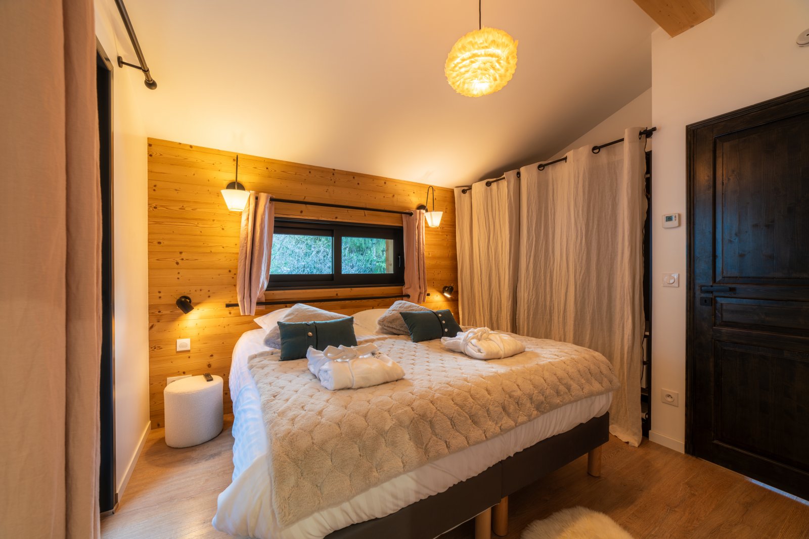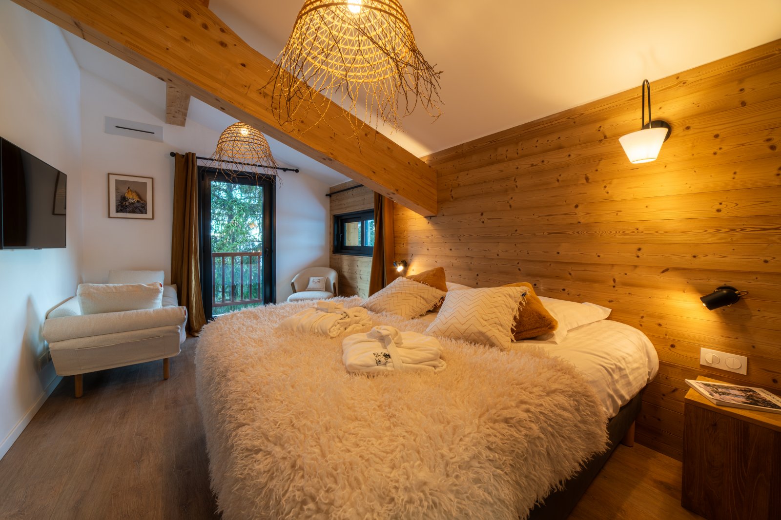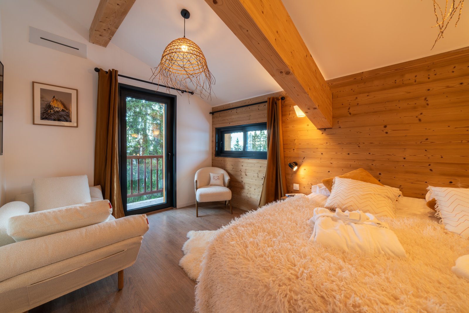 Chacun pourra disposer de son intimité avec 7 chambres toutes en suite avec salles de bain, dont deux chambres de maître très spacieuses en suite avec baignoire. La literie haut de gamme apportera confort à vos nuits. Chaque chambre dispose d’un balcon ou terrasse avec une jolie vue sur la montagne ou la forêt.