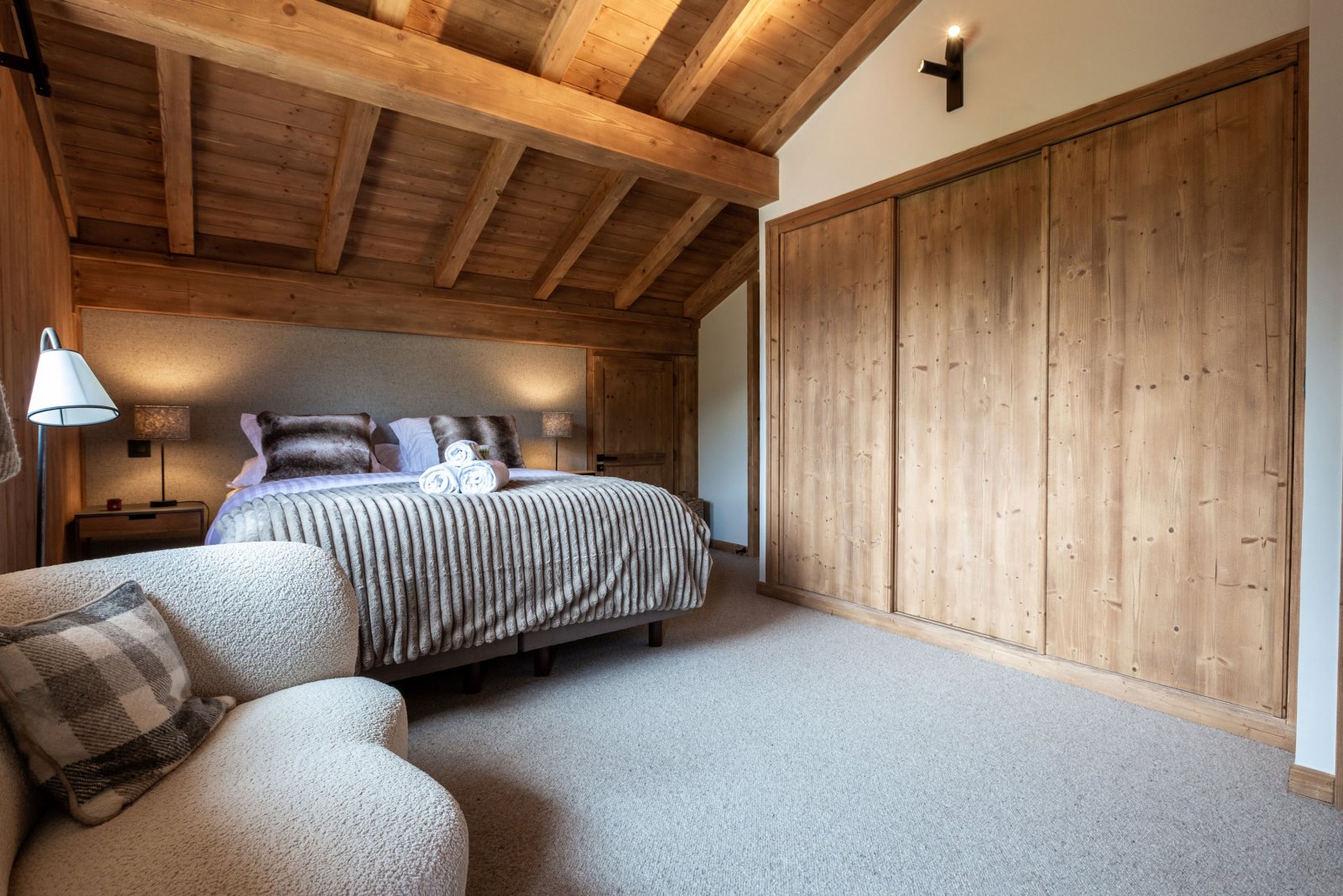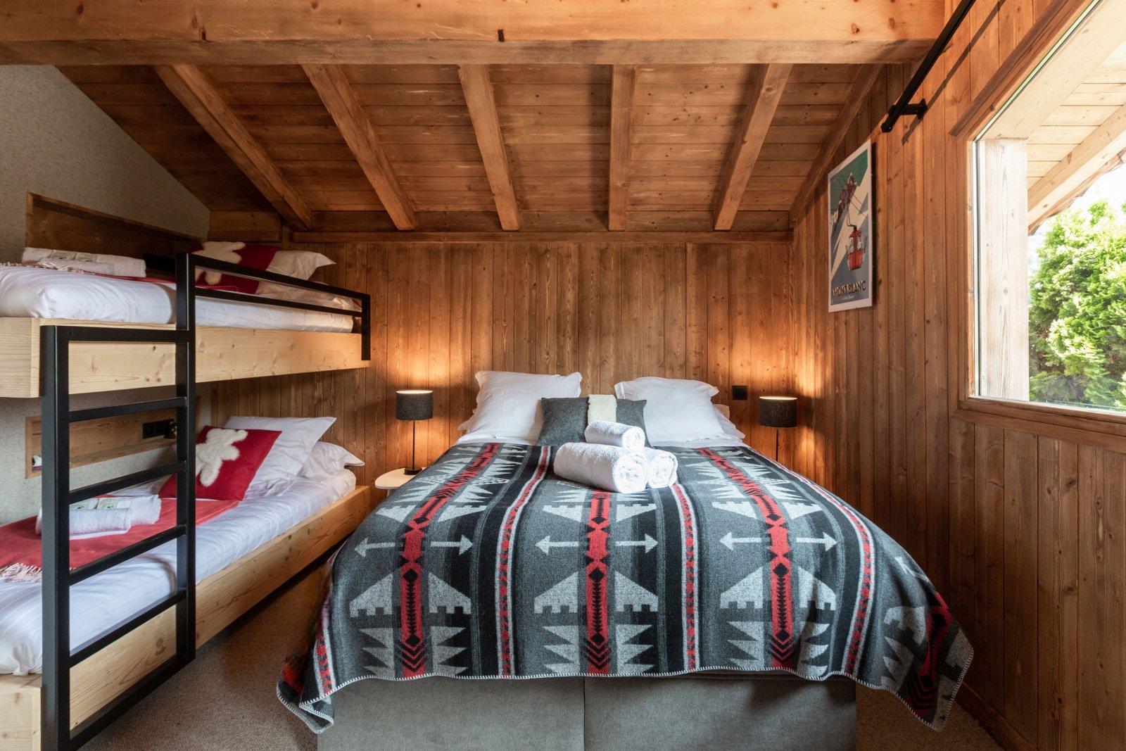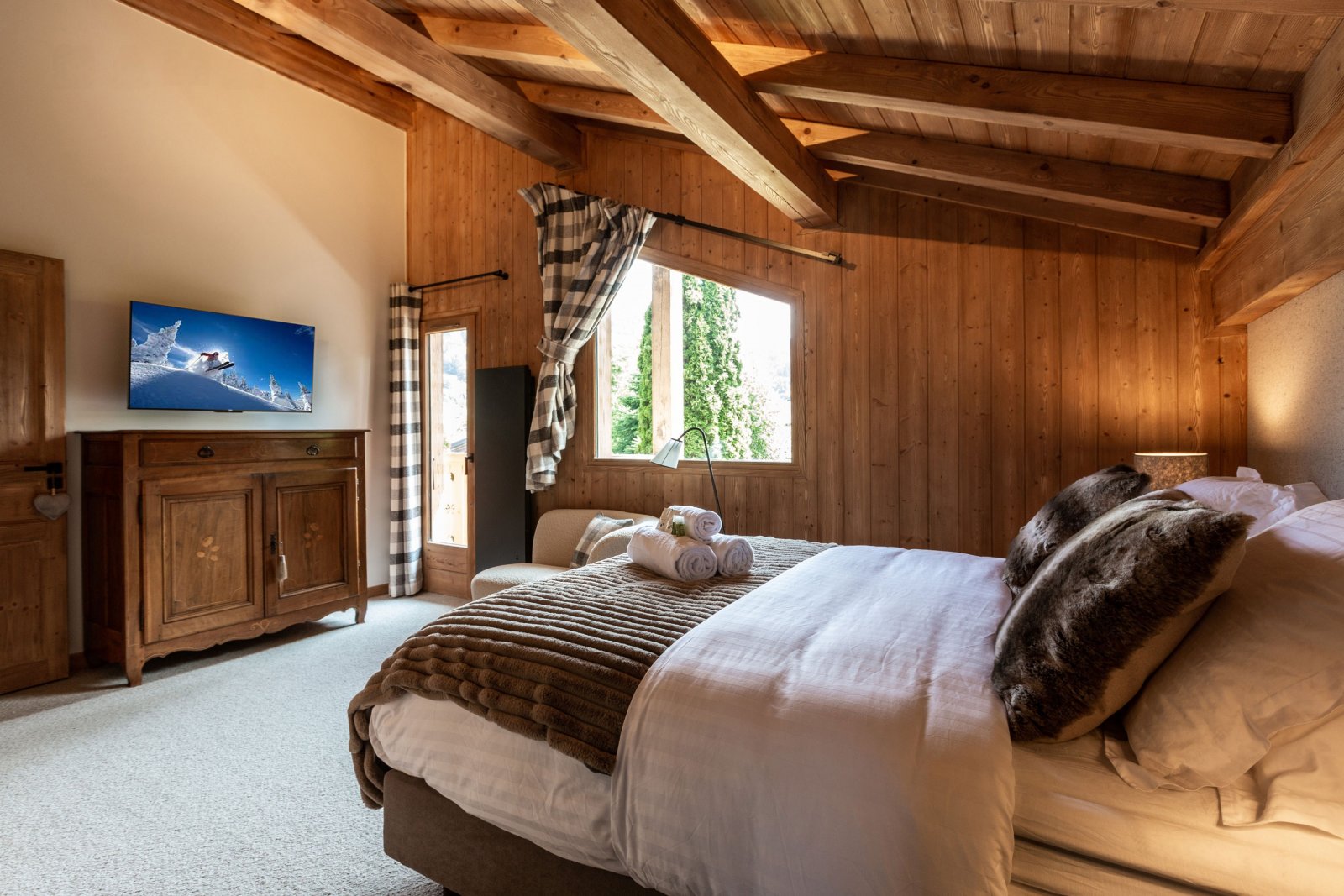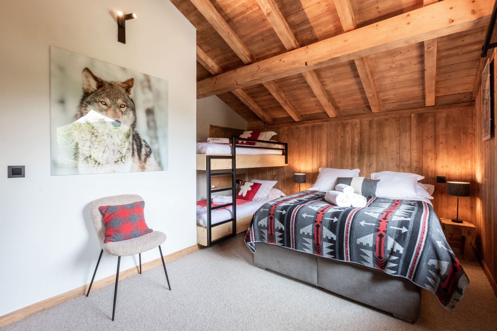À l’étage, le chalet dispose de 3 chambres fermées, chacune étant équipée d'une TV : une suite parentale avec salle d’eau attenante et balcon, une chambre familiale avec un lit king-size, deux lits superposés et un balcon, une chambre avec deux lits simples.