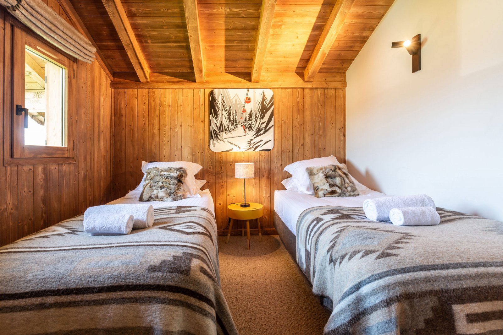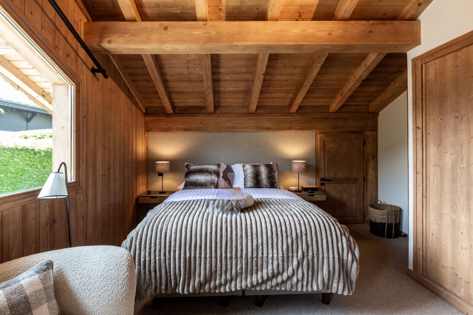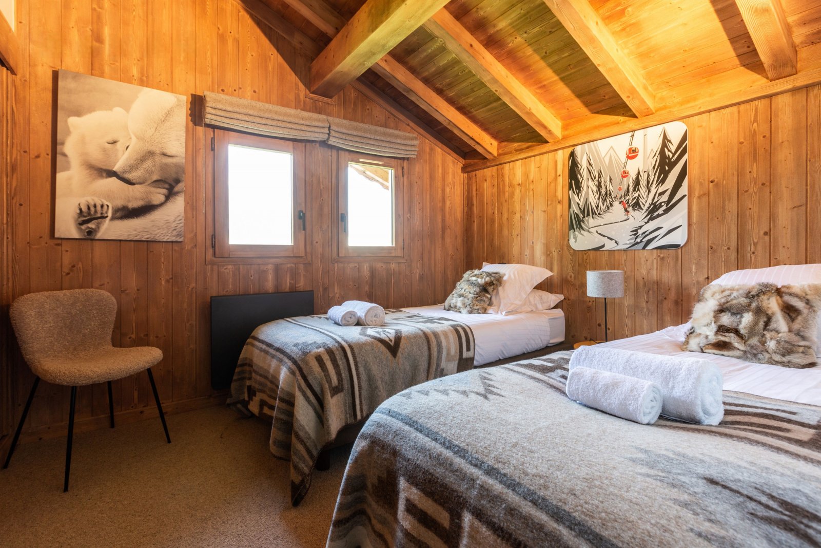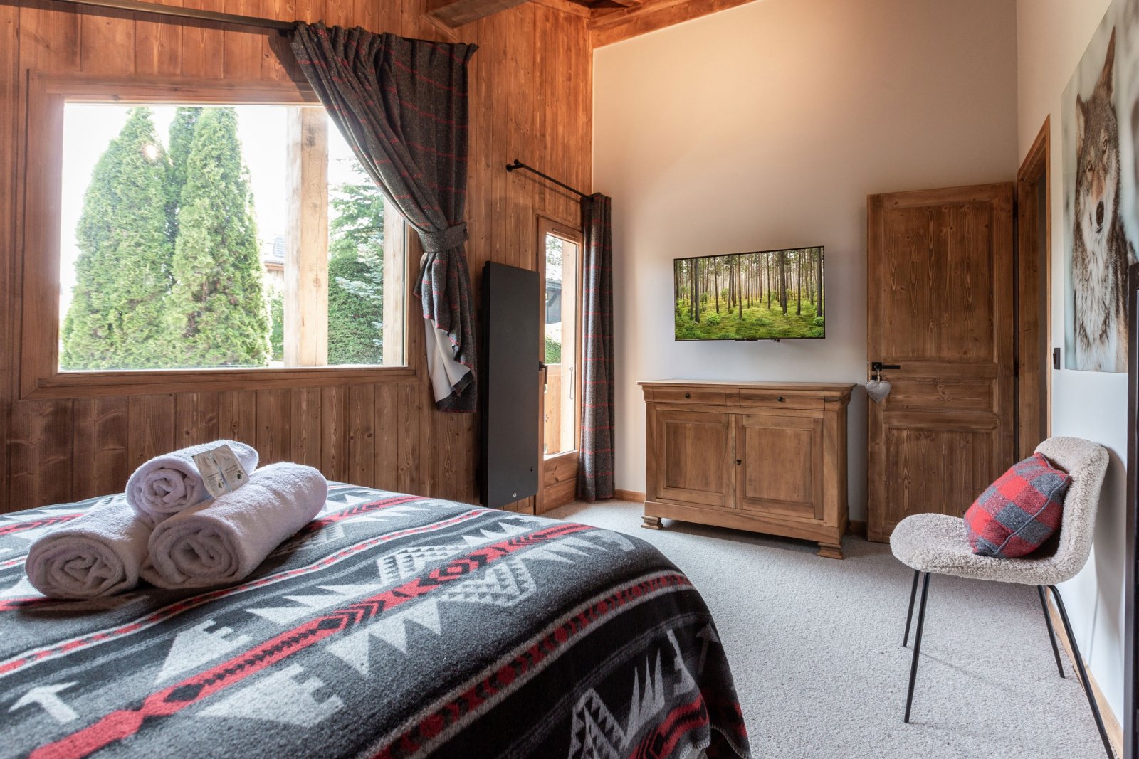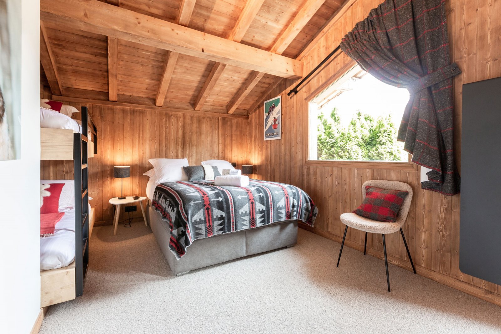 À l’étage, le chalet dispose de 3 chambres fermées, chacune étant équipée d'une TV : une suite parentale avec salle d’eau attenante et balcon, une chambre familiale avec un lit king-size, deux lits superposés et un balcon, une chambre avec deux lits simples.
