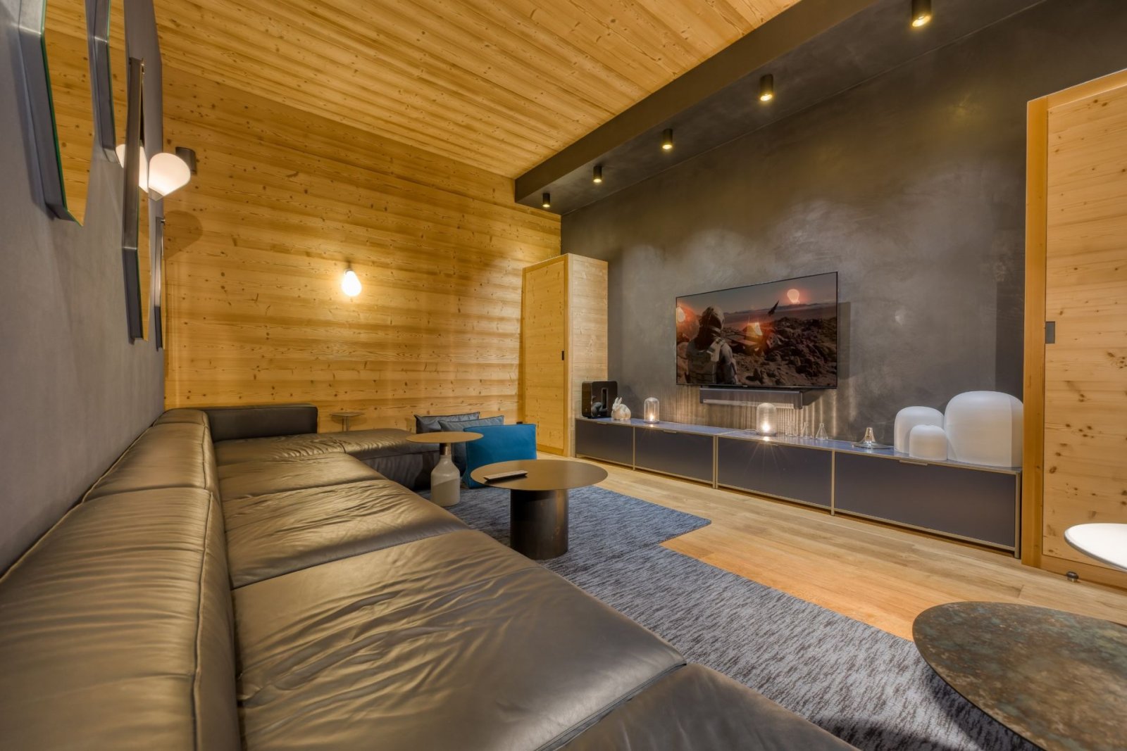 Niveau -1 : Le niveau -1 comprend un espace de dégagement avec coin jeux, deux chambres doubles en suite avec salle de douche et WC, un espace spa avec jacuzzi pour des moments de relaxation après-ski, des toilettes indépendantes et un salon TV idéal pour des soirées cocooning en famille.