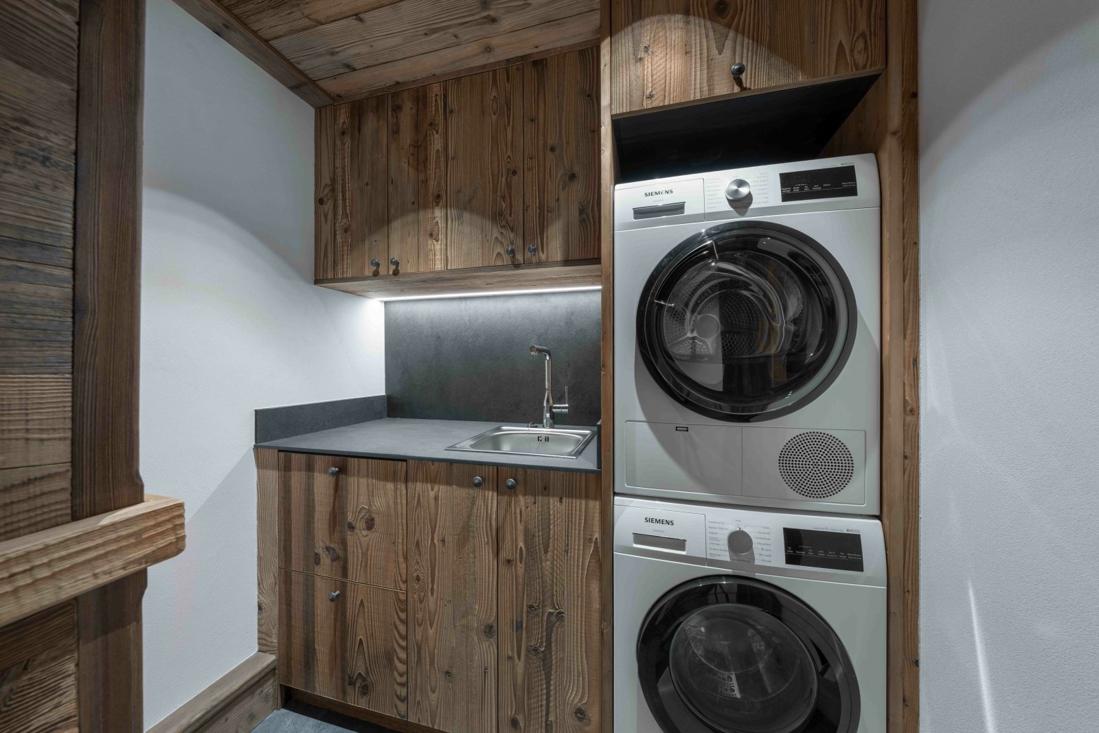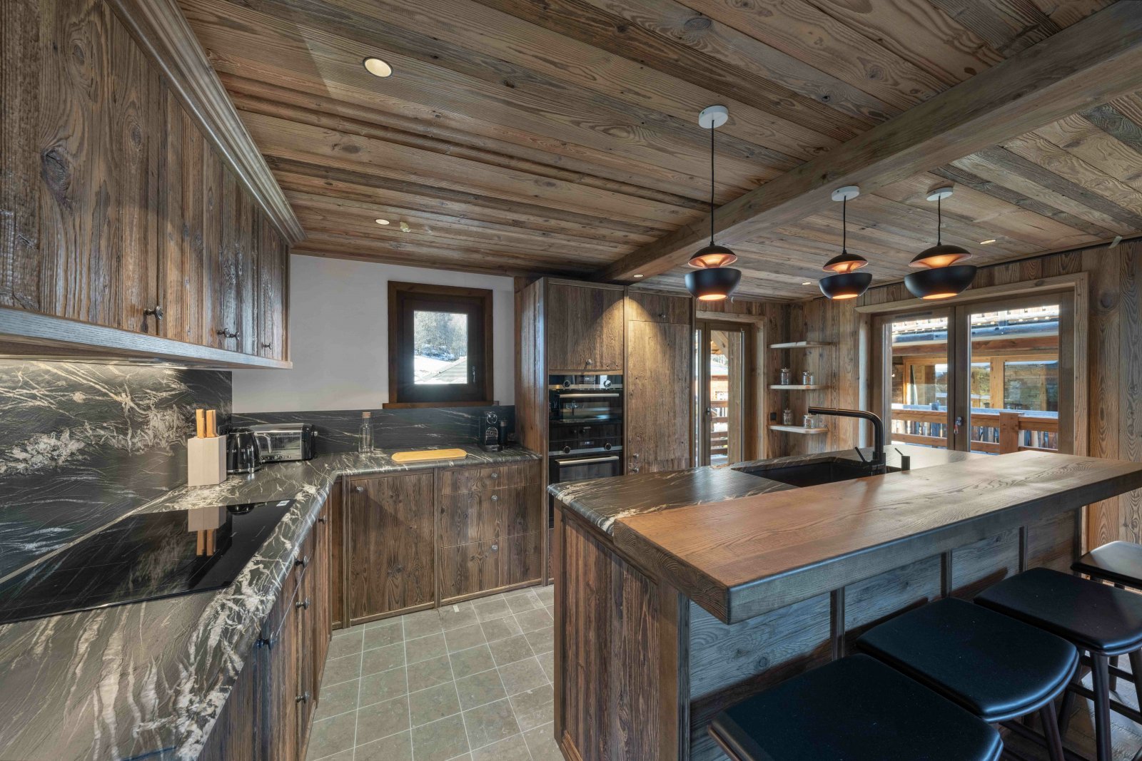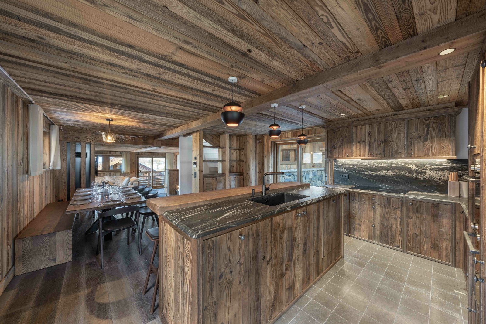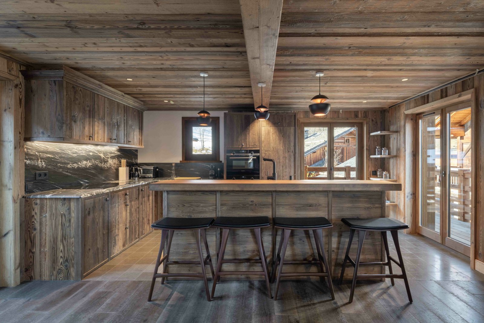 Le premier étage dévoile une spacieuse pièce de vie comprenant une cuisine moderne et entièrement équipée, ainsi qu’un coin cheminée pour des soirées douillettes après le ski.