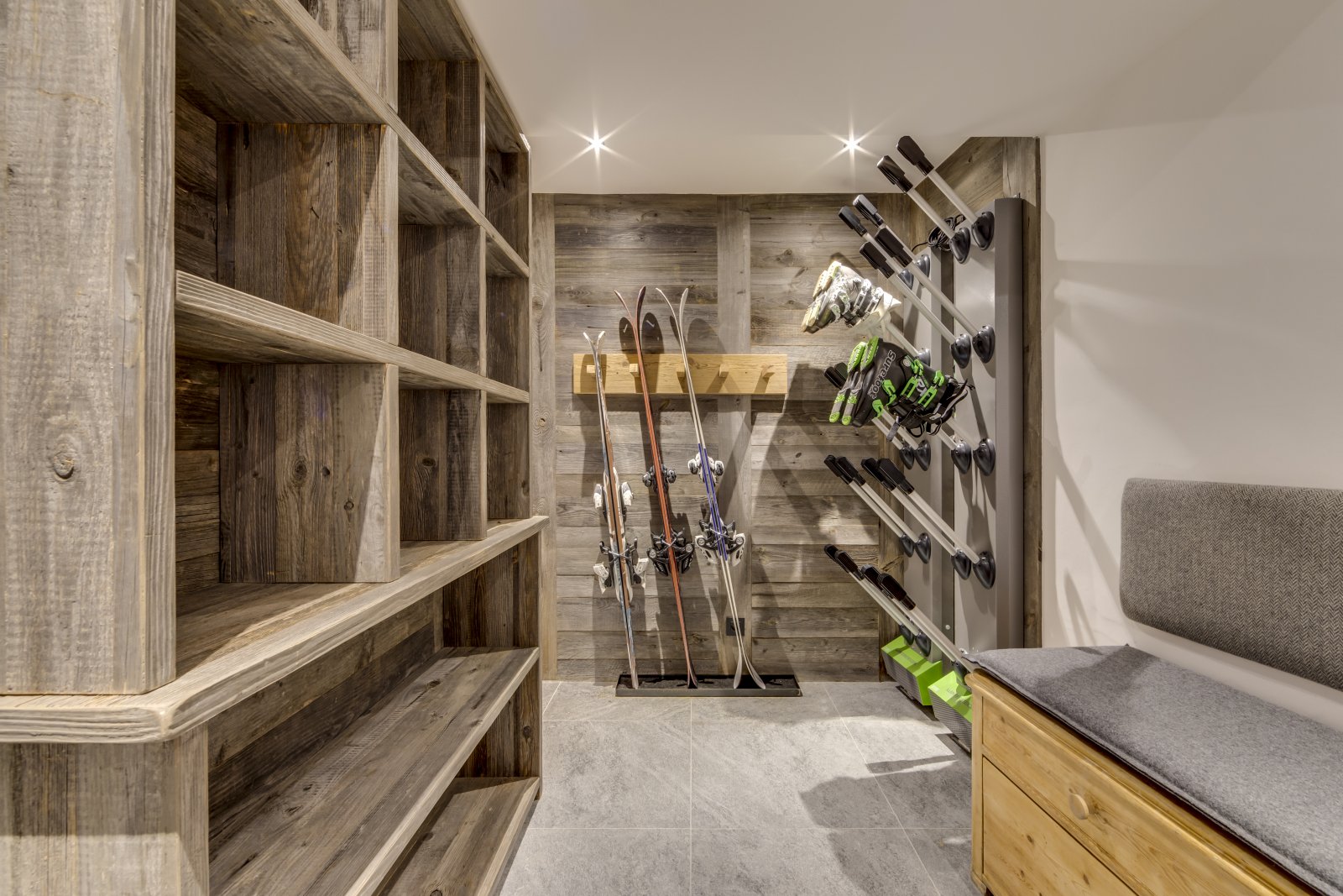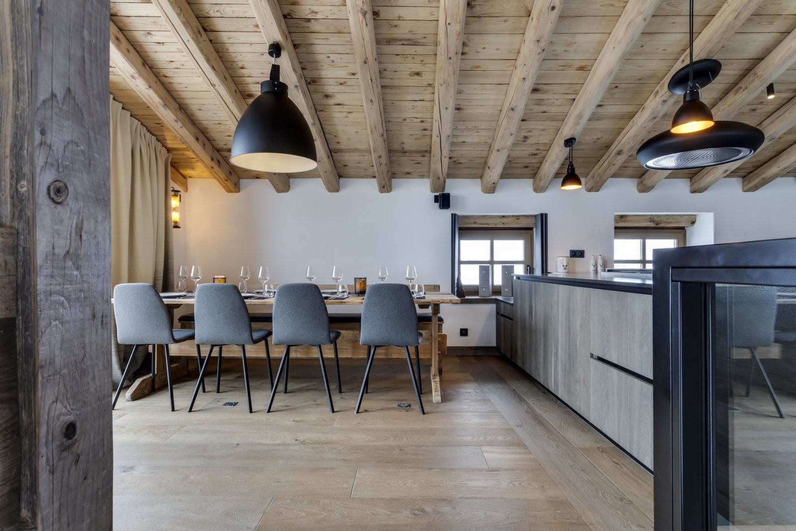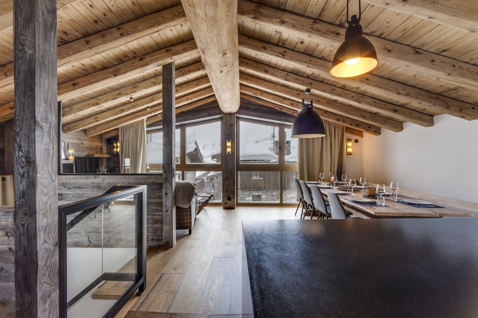 Le Chalet Loup est l'un des plus anciens bâtiments de Val d'Isère. Il a été magnifiquement restauré en 2021 selon des normes exceptionnelles, en conservant ses caractéristiques d'origine uniques, telles que la terrasse couverte en bois. Ce chalet de ski de luxe possède des murs épais et profonds qui procurent un réel sentiment de protection et de confort à l'intérieur. L'entrée du chalet se trouve au rez-de-chaussée, où vous trouverez les deux premières chambres, dont l'une est une chambre avec des lits superposés, parfaite pour les enfants, bien que les lits soient de taille adulte. En montant l'escalier central en colimaçon, vous accédez à trois chambres avec salle de bains privative parfaitement agencées. Les magnifiques intérieurs en bois gris et les tissus Les Cinq Frères apportent une touche contemporaine et équilibrée à ce bâtiment historique en pierre du village. Chaque chambre dispose de sa propre salle de bains avec baignoire ou douche, en marbre clair ou foncé. En montant au dernier étage, vous passez devant la terrasse en bois orientée à l'ouest qui mène à un jacuzzi extérieur. La terrasse est l'endroit idéal pour profiter du soleil printanier en fin de journée, un apéritif à la main. Le salon et la salle à manger occupent tout le dernier étage du bâtiment et forment un bel espace ouvert. Les cuisiniers en herbe apprécieront la cuisine conviviale, ouverte et bien équipée, parfaitement aménagée pour pouvoir profiter de la compagnie de ceux qui se sont installés confortablement près du feu de bois dans le salon. La table à manger contraste le bois brun avec les chaises scandinaves gris clair et offre un espace apaisant pour profiter du dîner. Il y a également un espace de lecture supplémentaire qui offre une vue sur le village du Fornet et le parc national de la Vanoise.