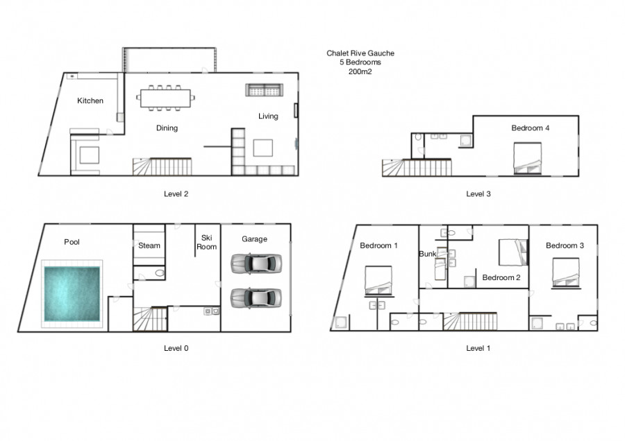 Situé juste à côté du Chalet Vieux Pont, ce chalet de luxe s'ouvre sur une réception et un local à skis équipé d'un espace de rangement pour les skis et de chauffe-chaussures. À ce niveau, découvrez la piscine intérieure à remous et le hammam marocain offrant l'une des plus belles vues de Val d'Isère, surplombant la rivière et le vieux pont. Au premier étage se trouvent les chambres principales. Trois de ces chambres sont équipées d'un lit king-size ou de deux lits jumeaux et leur configuration est modulable. Elles bénéficient principalement d'une orientation ouest, idéale pour profiter du soleil couchant. Une petite chambre dispose également de lits superposés fixes en bois de récupération, adaptés aux adultes, avec un espace lavabo et des toilettes attenants.