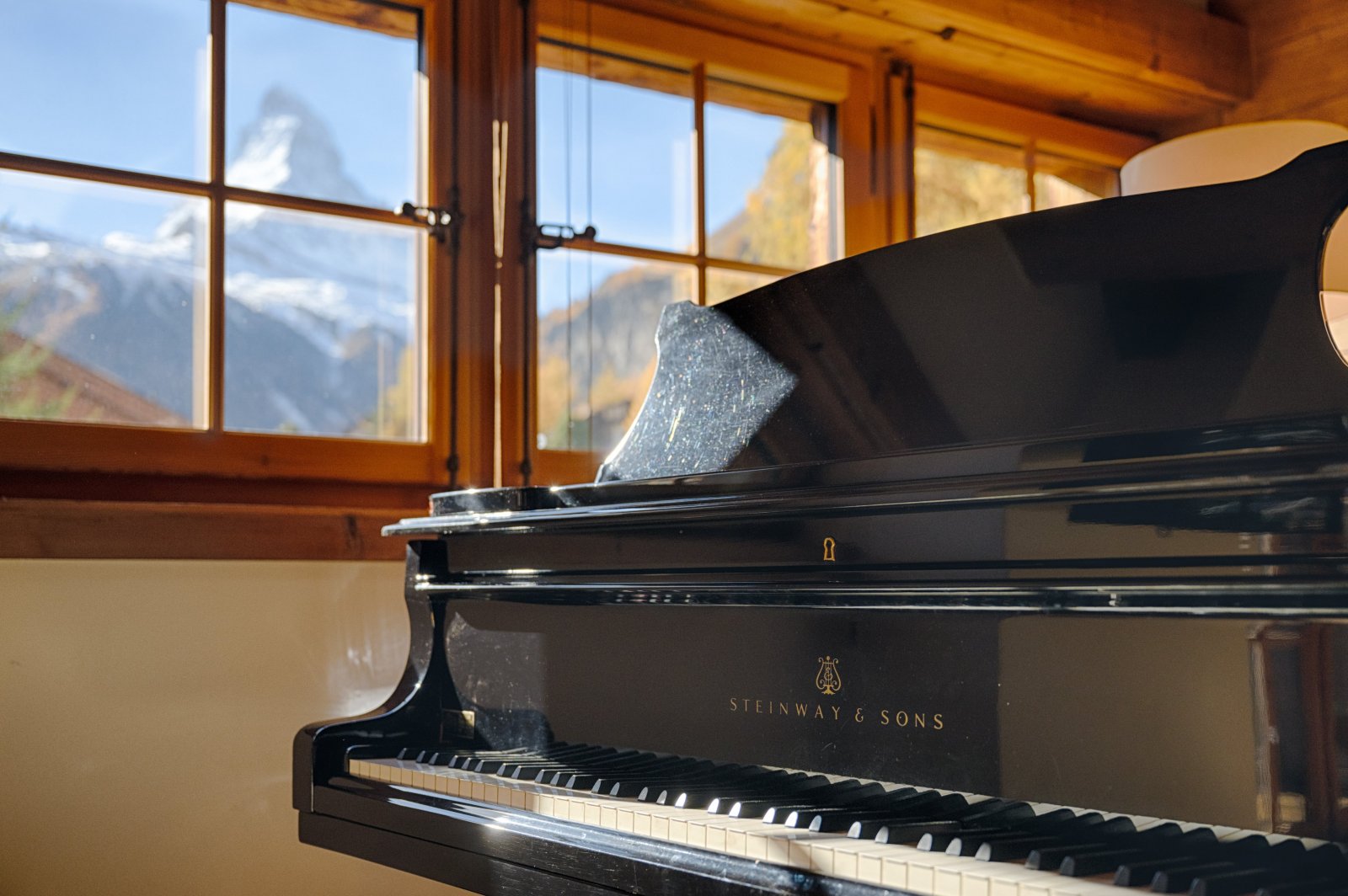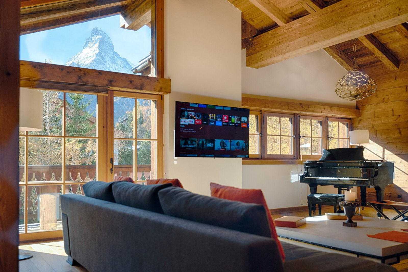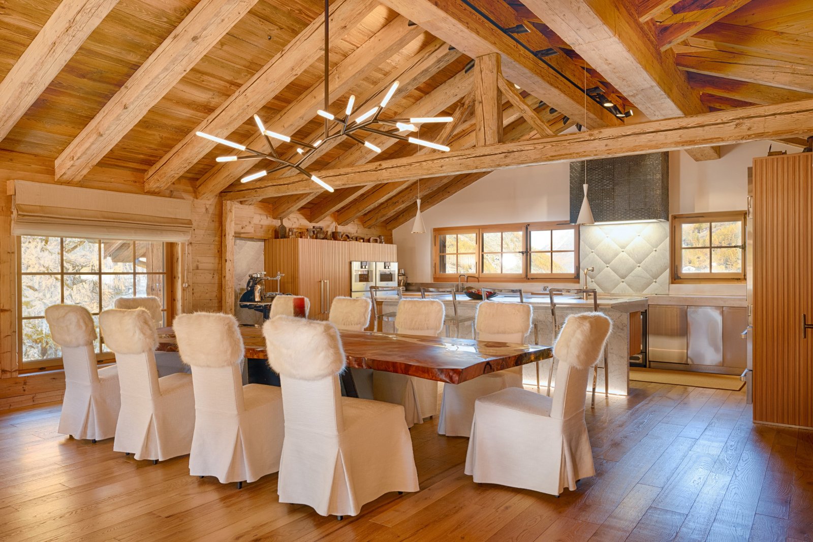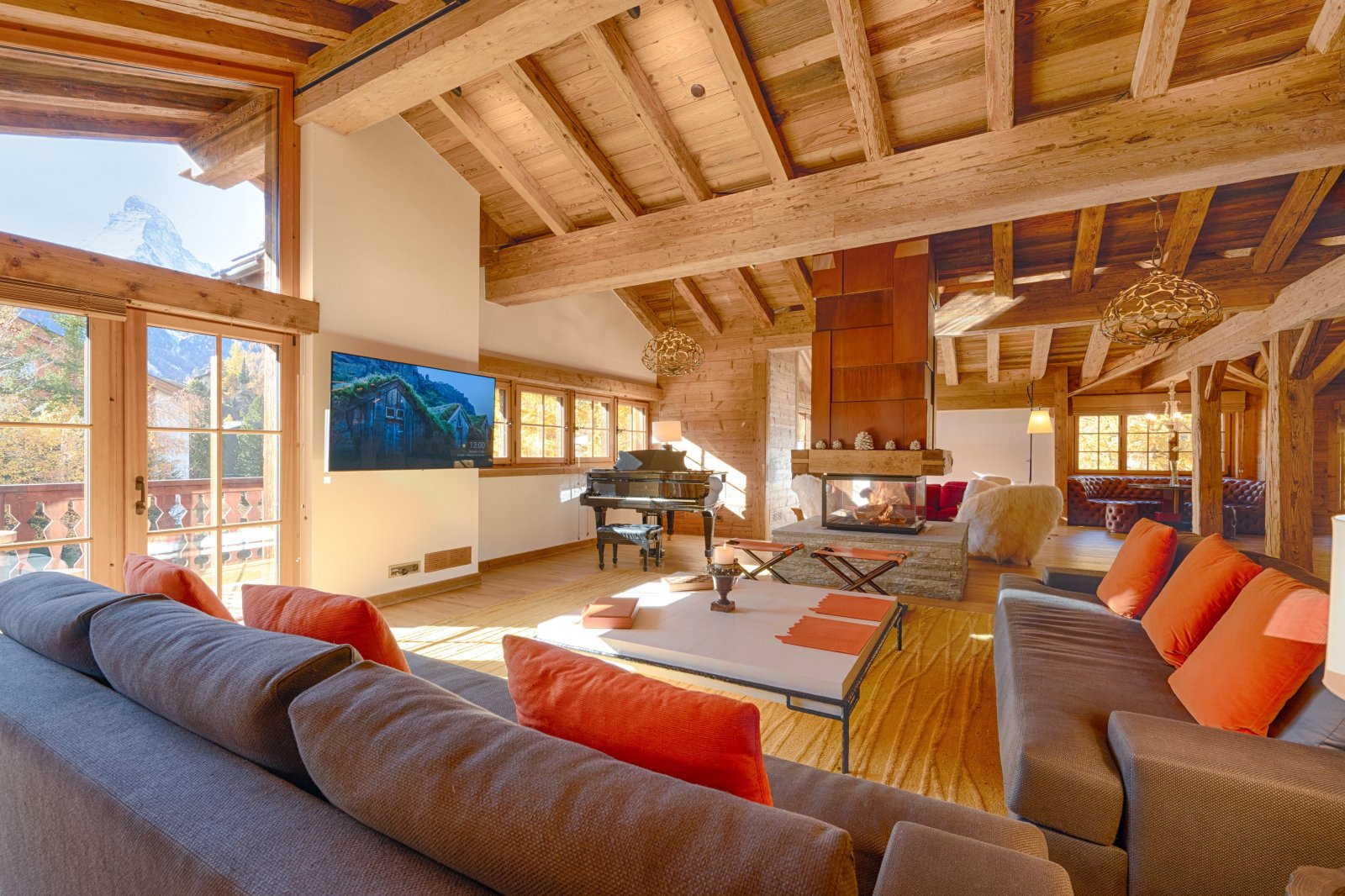 Réparti sur plusieurs étages avec un ascenseur privé, le chalet dispose d’espaces de vie lumineux et ouverts, de baies vitrées et de terrasses ensoleillées orientées au sud. L’élégant salon dispose de plusieurs espaces différents pour se détendre, d’un piano à queue Steinway et d’une cheminée centrale. Le grand coin repas et le bar avec îlot le rendent idéal pour les dîners avec traiteur ou les soirées de détente après avoir exploré les pistes de ski de Zermatt.