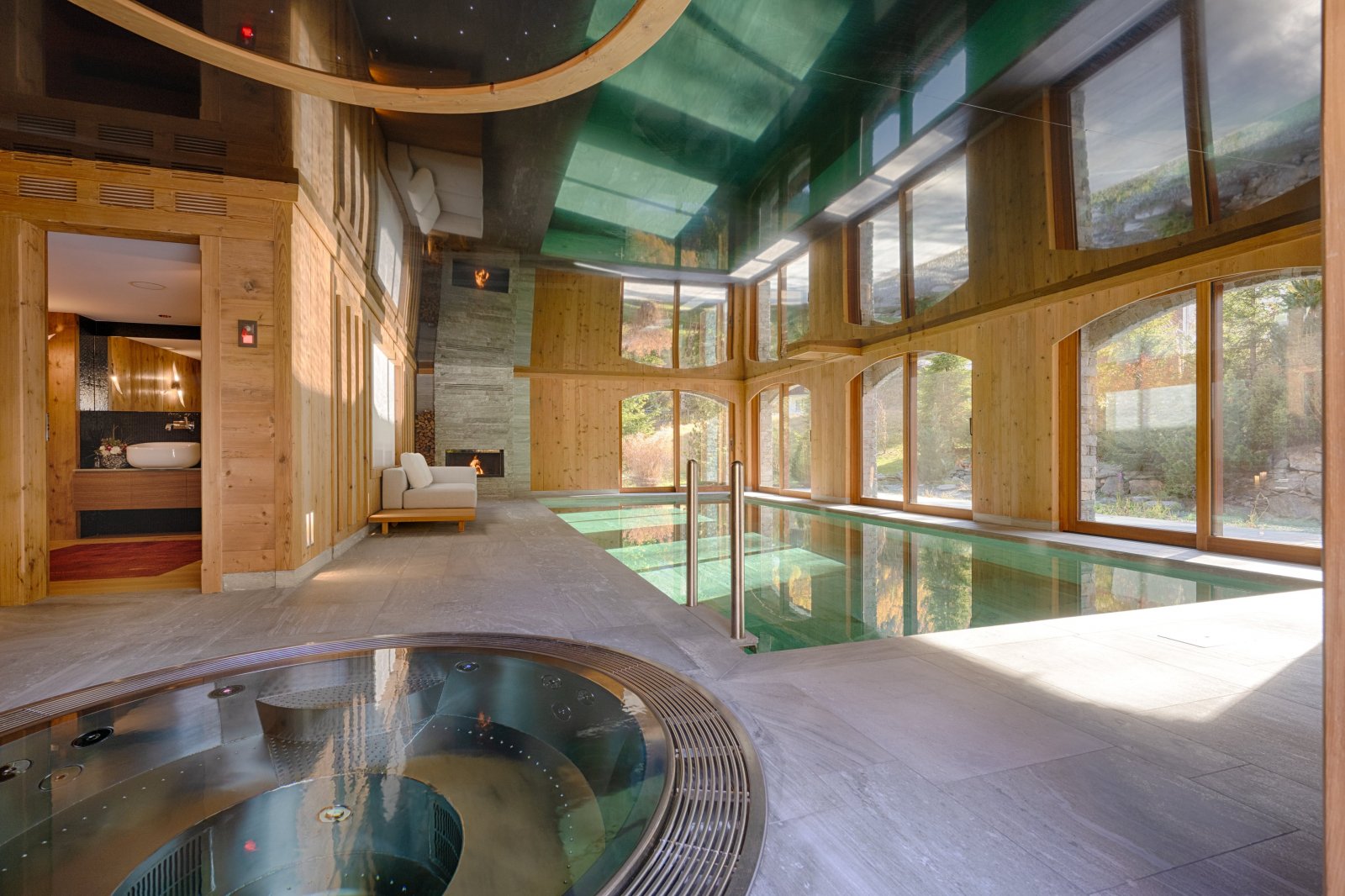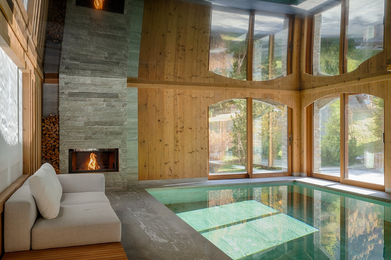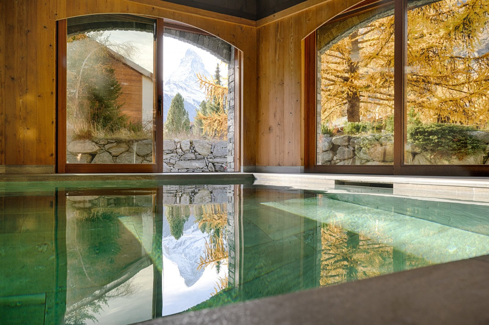 Au cœur de la propriété se trouve son impressionnante piscine privée, son spa et son espace bien-être. La piscine intérieure chauffée s’étend vers le paysage montagneux, complétée par une cheminée, un sauna, un hammam et une terrasse de relaxation extérieure, idéale pour se détendre après une journée sur les pistes de ski de Zermatt, mondialement connues, ou sur les sentiers de randonnée. Pour ceux qui recherchent encore plus de plaisir, une salle de soins de massage dédiée et un espace de remise en forme sont intégrés de manière réfléchie dans la conception.