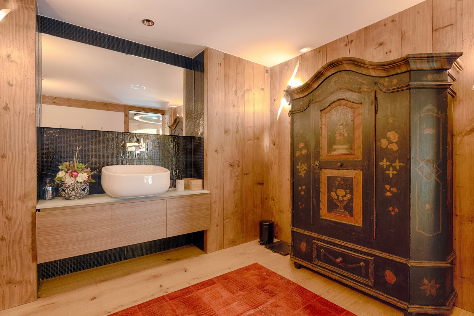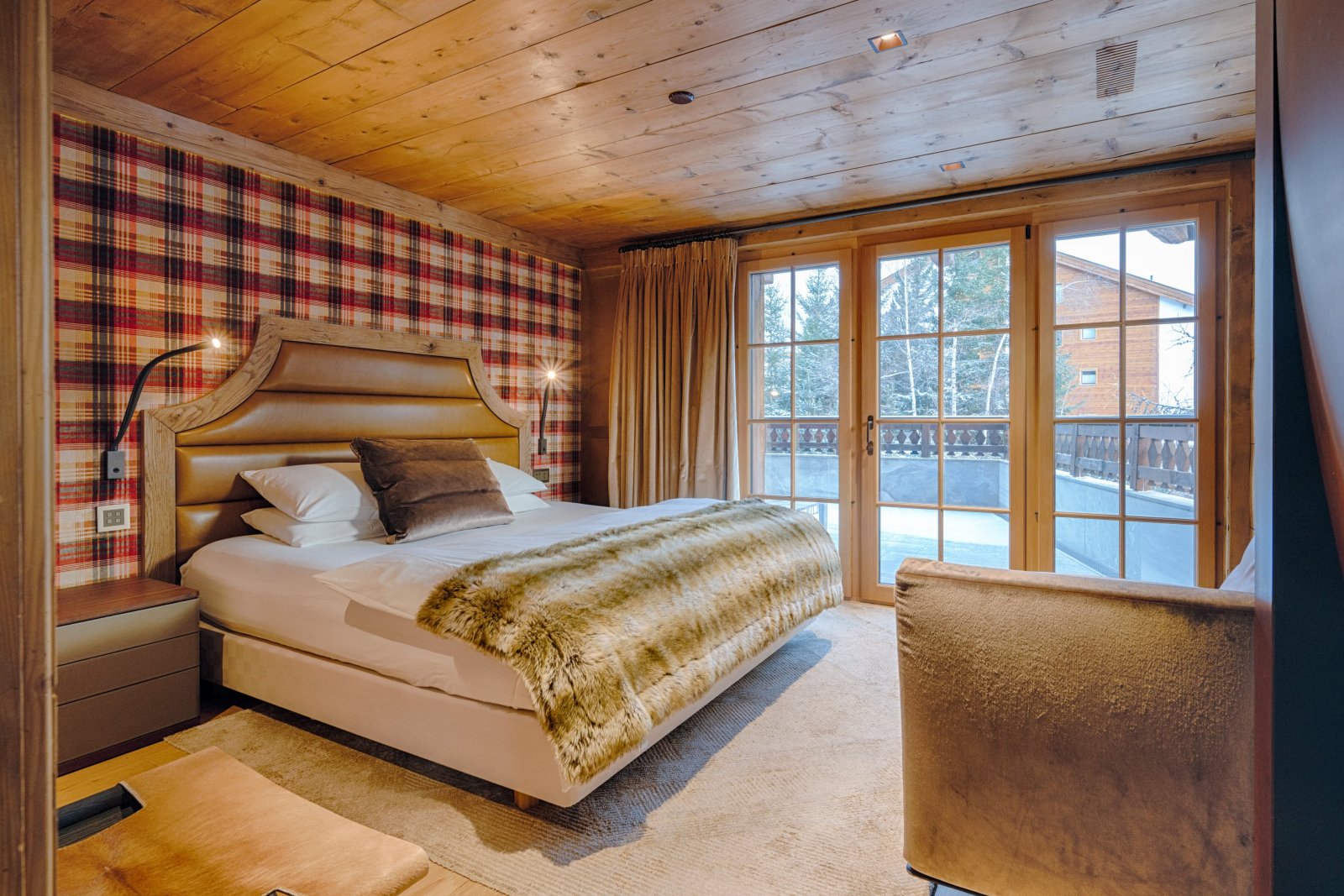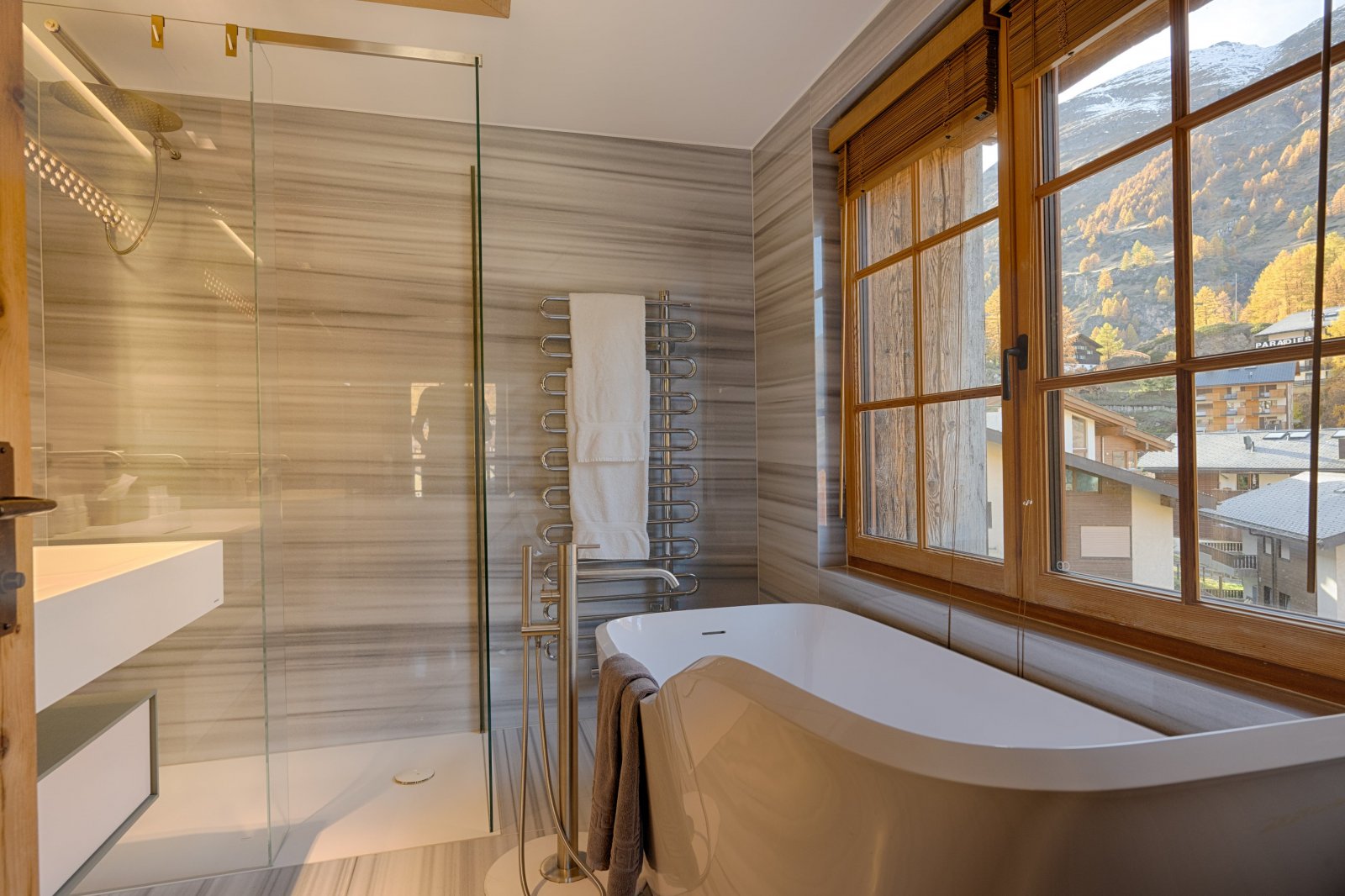 Le premier étage comprend deux chambres doubles avec salles de bains privatives et vue sur le Cervin, ainsi que trois chambres doubles avec salles de bains privatives et vue sur le village de Zermatt.