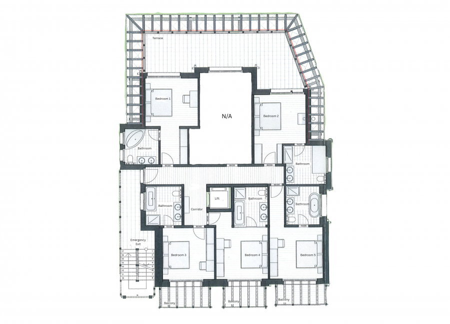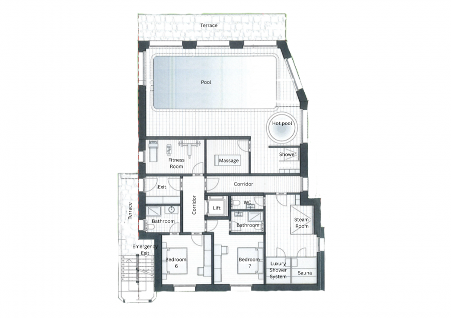 Depuis l’entrée au niveau de la rue, vous traversez un magnifique tunnel orné de bois de cerfs pour accéder à l’ascenseur privé qui dessert les trois étages principaux. Le rez-de-chaussée abrite la piscine et le spa, ainsi que deux chambres doubles/twin avec salles de bains privatives.