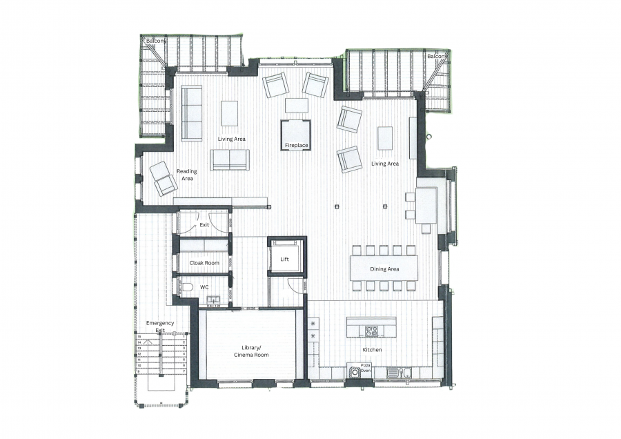 L’étage supérieur dispose d’un grand salon et d’une cuisine ouverte. Il y a également un salon TV confortable avec sa propre cheminée, et des toilettes pour les invités.