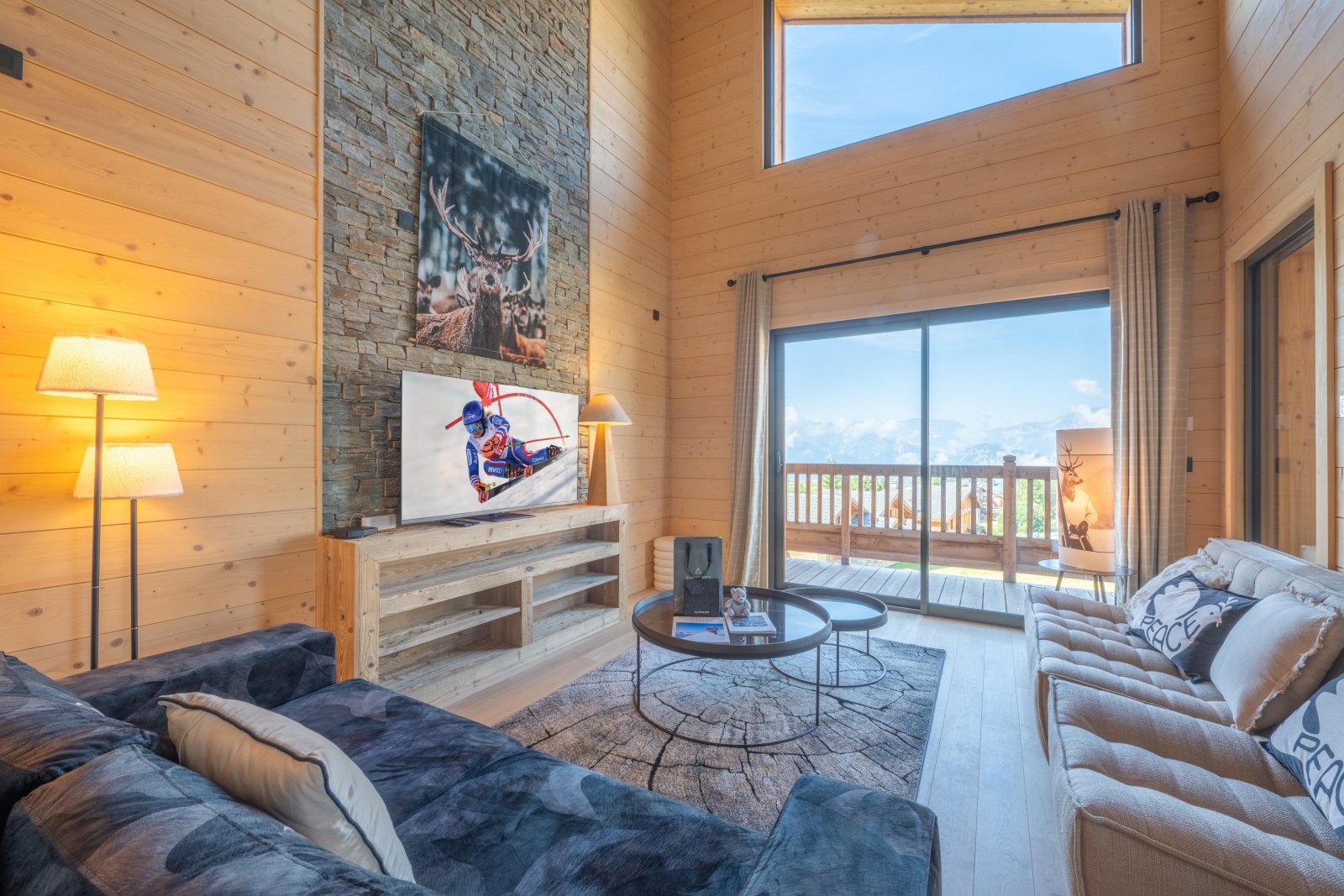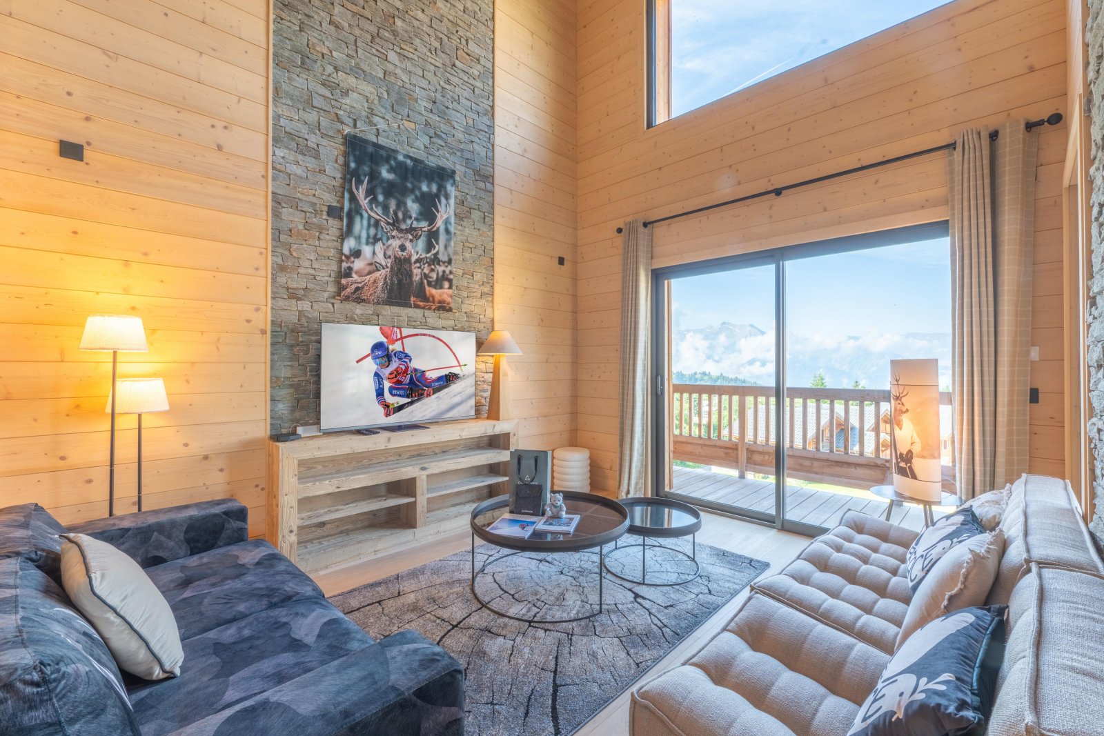Тщательно оформленная гостиная оснащена удобными диванами с мягкими подушками, большим плюшевым ковром и телевизором с плоским экраном. Благородные материалы, такие как дерево, сочетаются с тонким декором — например, стильной акцентной лампой или произведениями искусства, вдохновленными горами, — придавая пространству мягкость и элегантность.