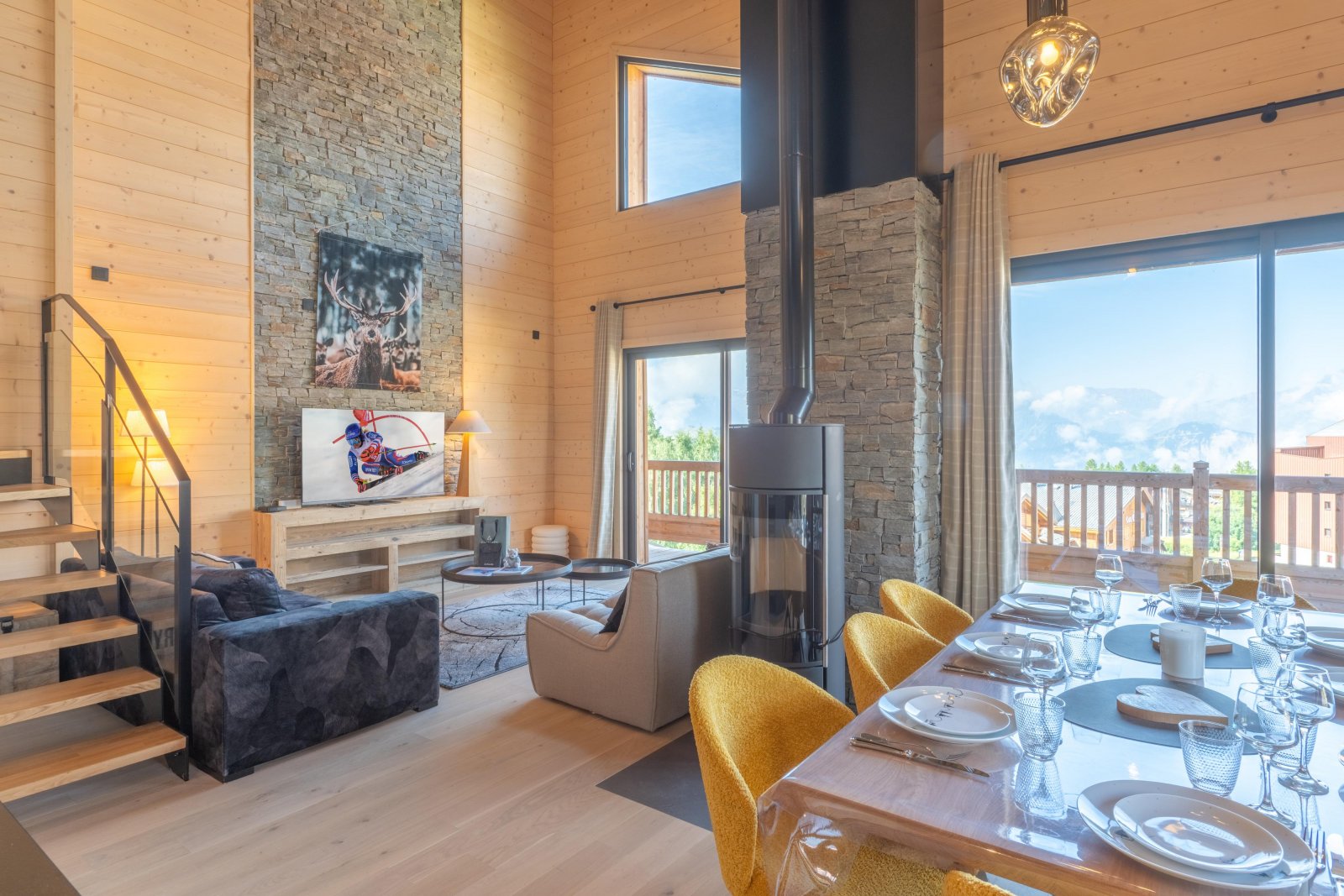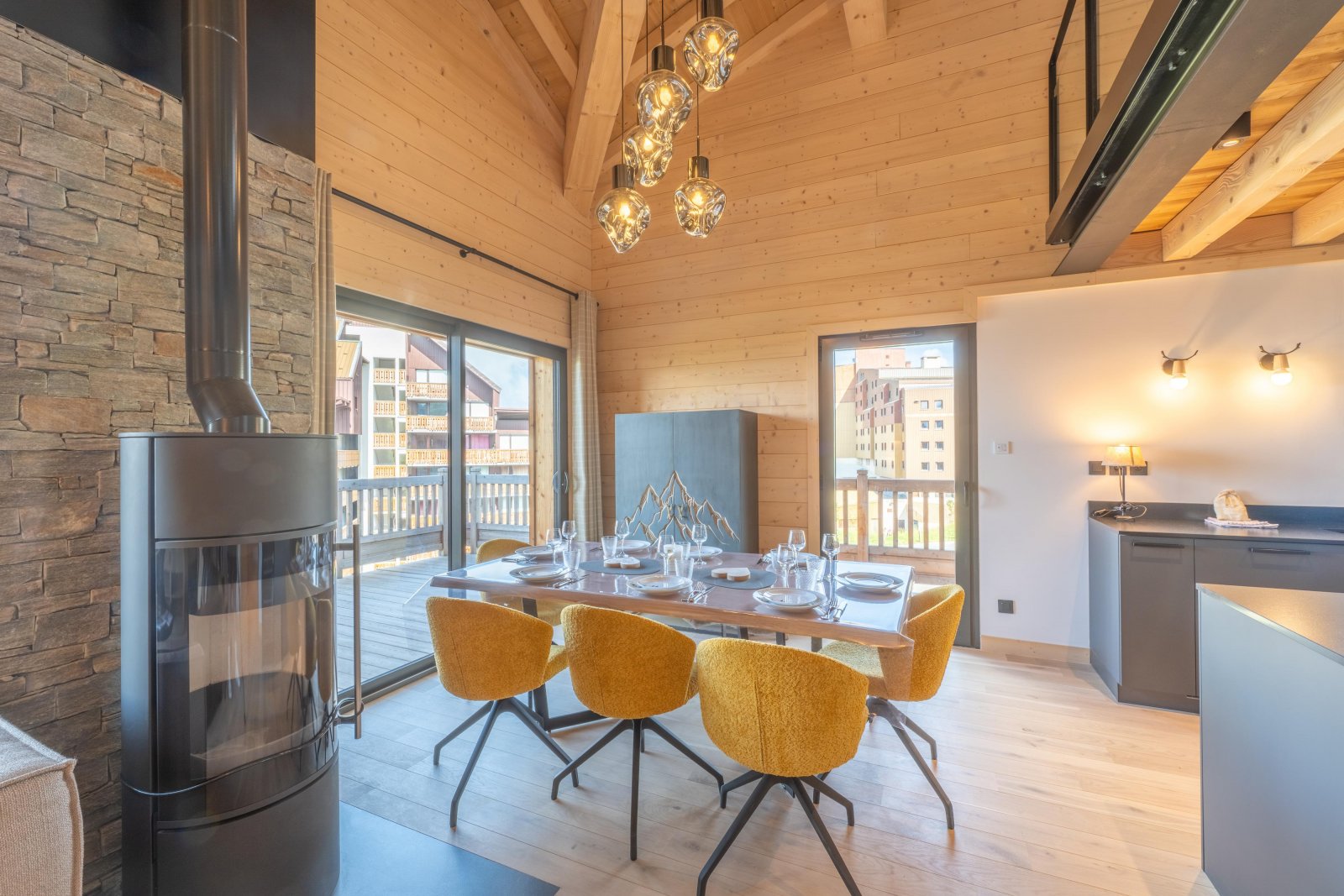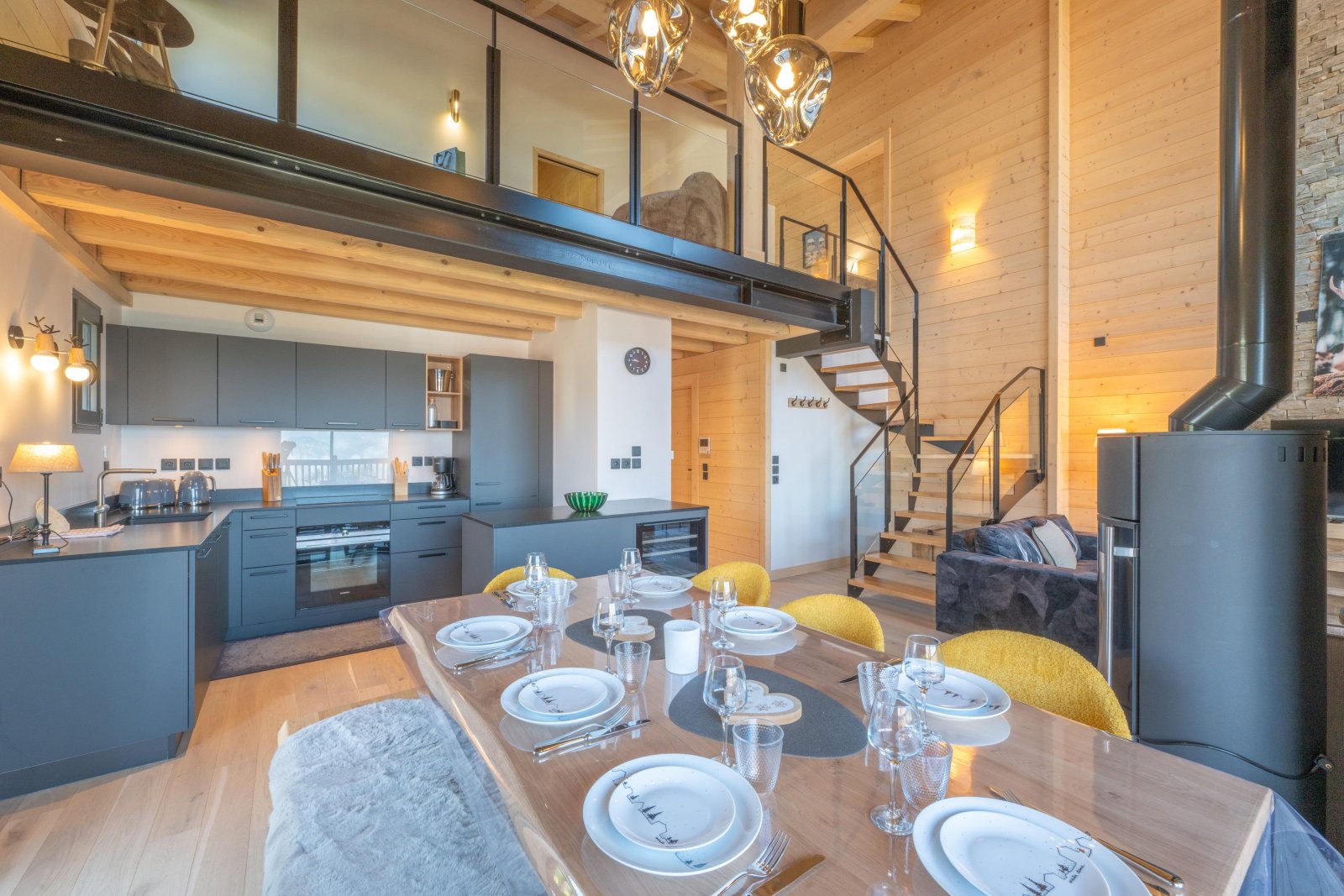 Гостиная открытой планировки плавно переходит в обеденную зону, которая может вместить до восьми гостей — идеальное место, чтобы насладиться фондю с семьей или друзьями после дня, проведенного на склонах. Большой обеденный стол из необработанного дерева в комплекте с подходящими скамейками усиливает аутентичный и дружеский дух комнаты, прекрасно вписываясь в шикарный альпийский декор.