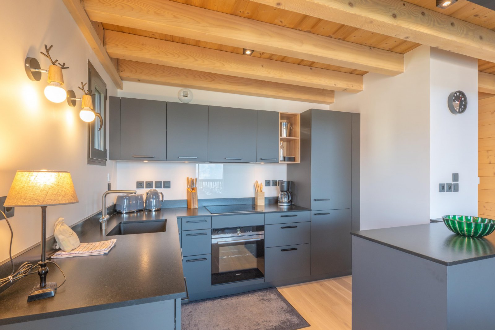 Кухня, также открытая к гостиной, выделяется своими чистыми, современными линиями. Ее гладкая черная мебель придает помещению современный и утонченный вид. Полностью оборудованная посудомоечной машиной, стиральной машиной, духовкой, микроволновой печью, холодильником, варочной панелью, вытяжкой и кофемашиной Nespresso, она была спроектирована так, чтобы сочетать практичность со стилем.