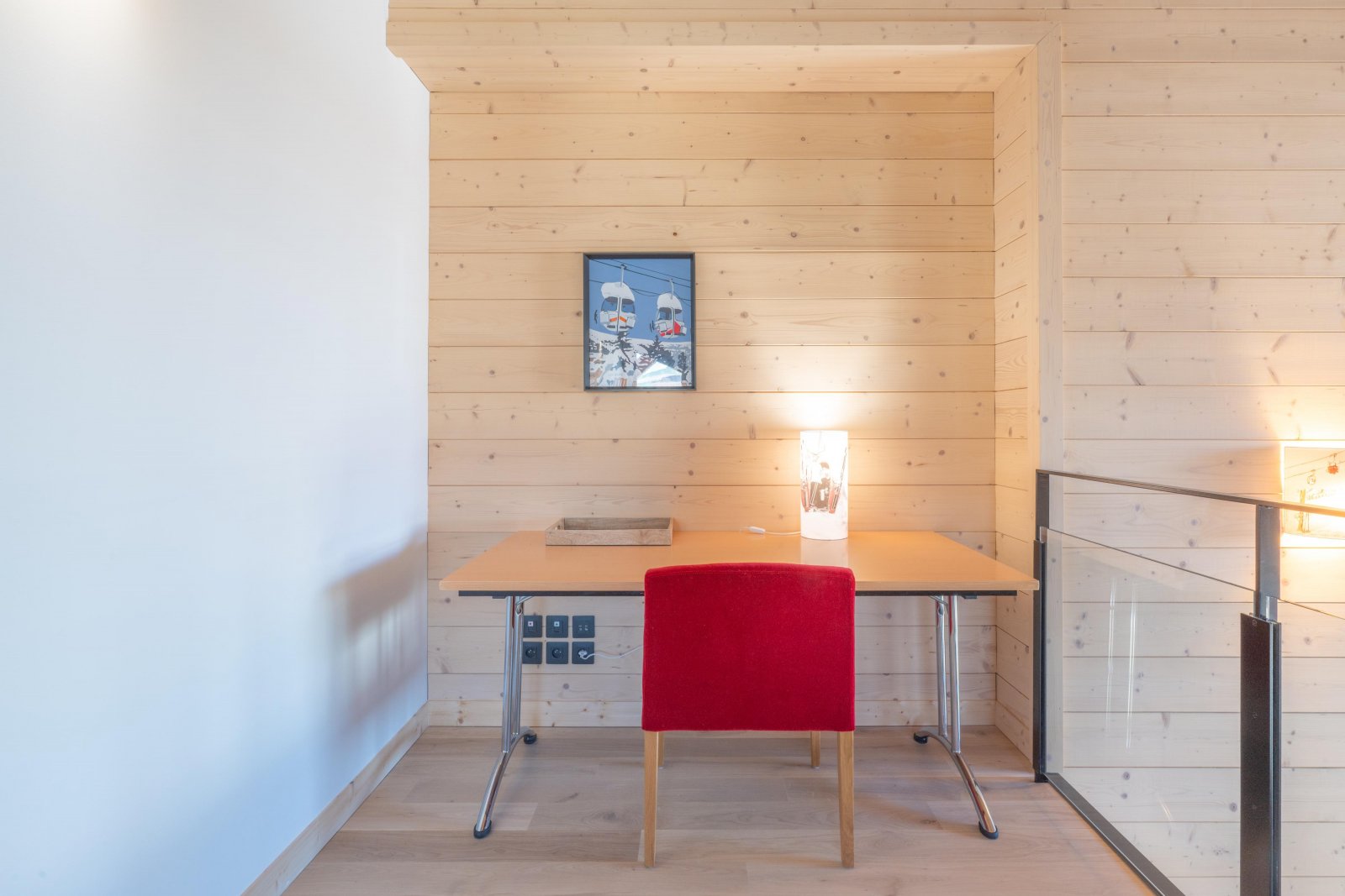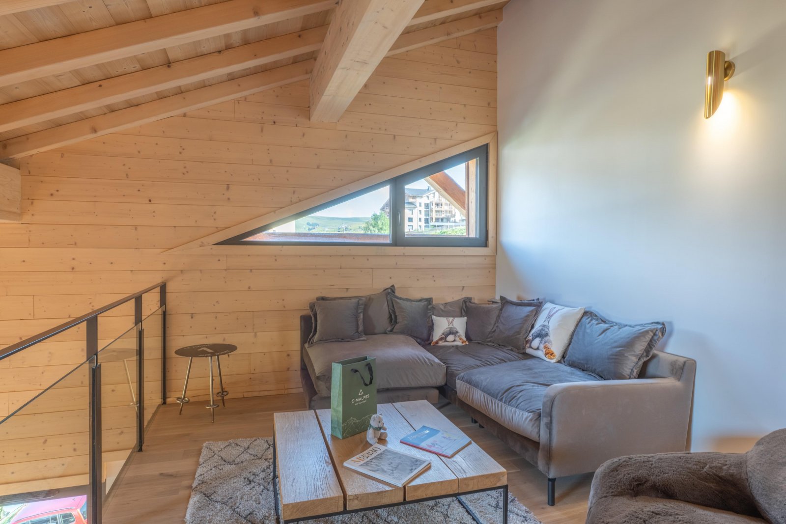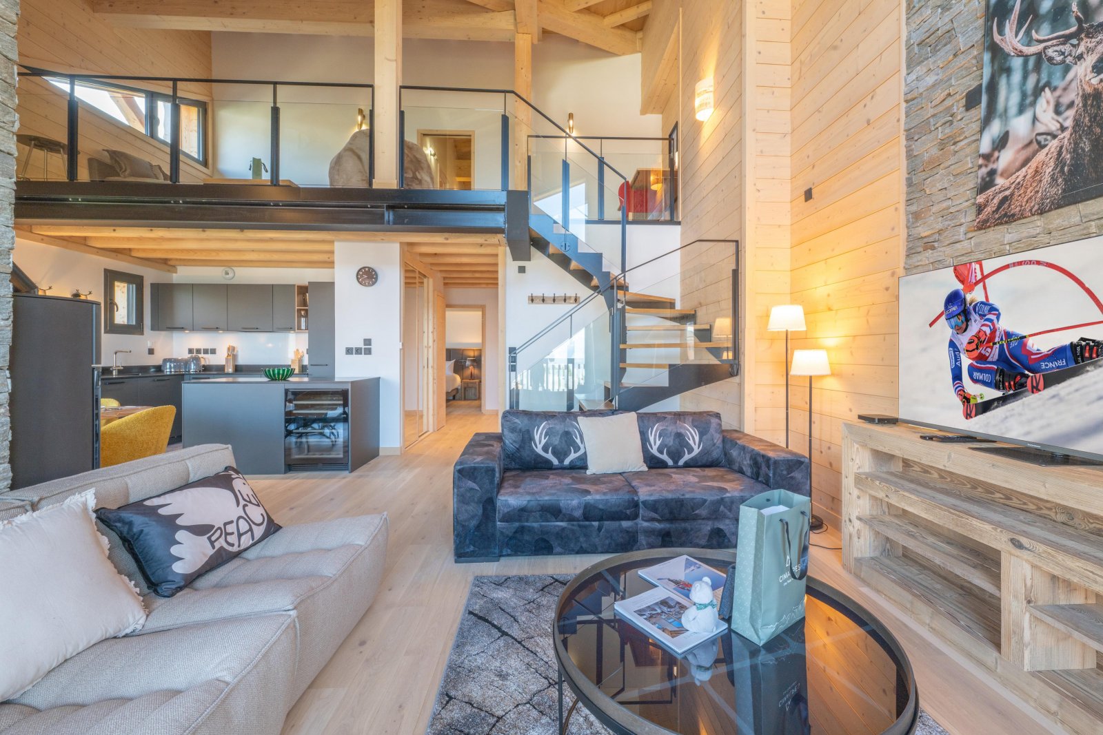 На верхнем этаже красивая лестница из массива дерева ведет на антресоль, откуда открывается вид на гостиную в стиле собора, расположенную внизу. Этот лаундж на верхнем уровне, настоящий уютный уголок, залит естественным светом и обставлен двумя большими, ультрамягкими креслами из искусственного меха и просторным угловым диваном — идеальным местом для послелыжного сна в полном комфорте.
