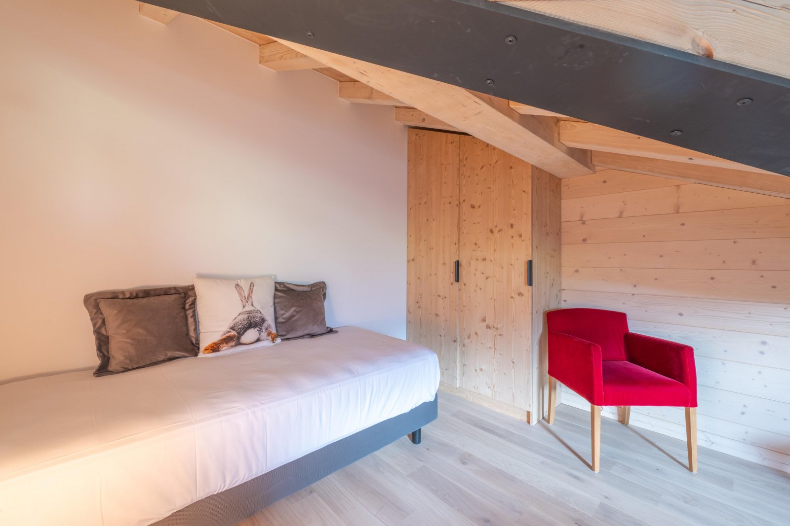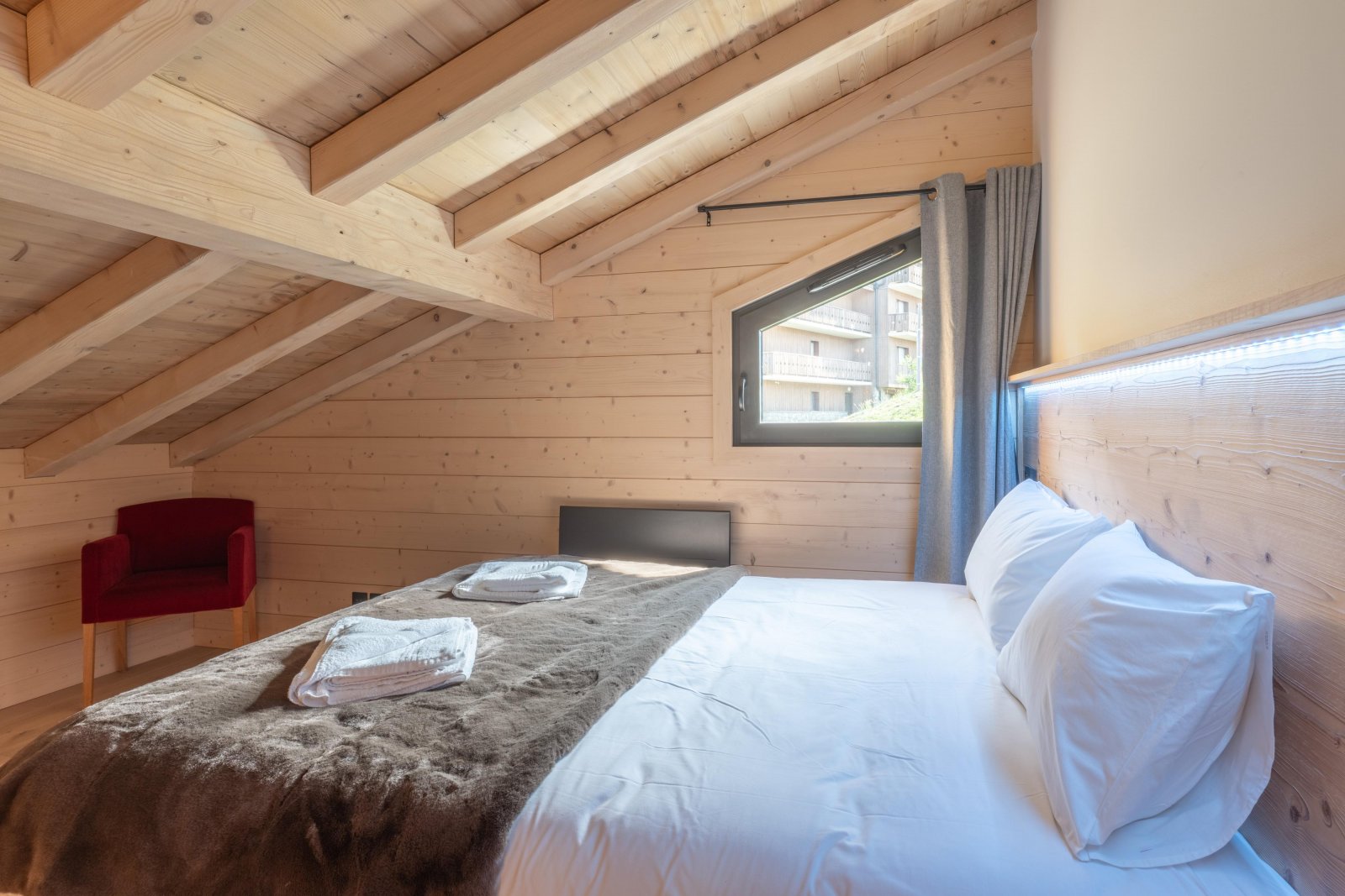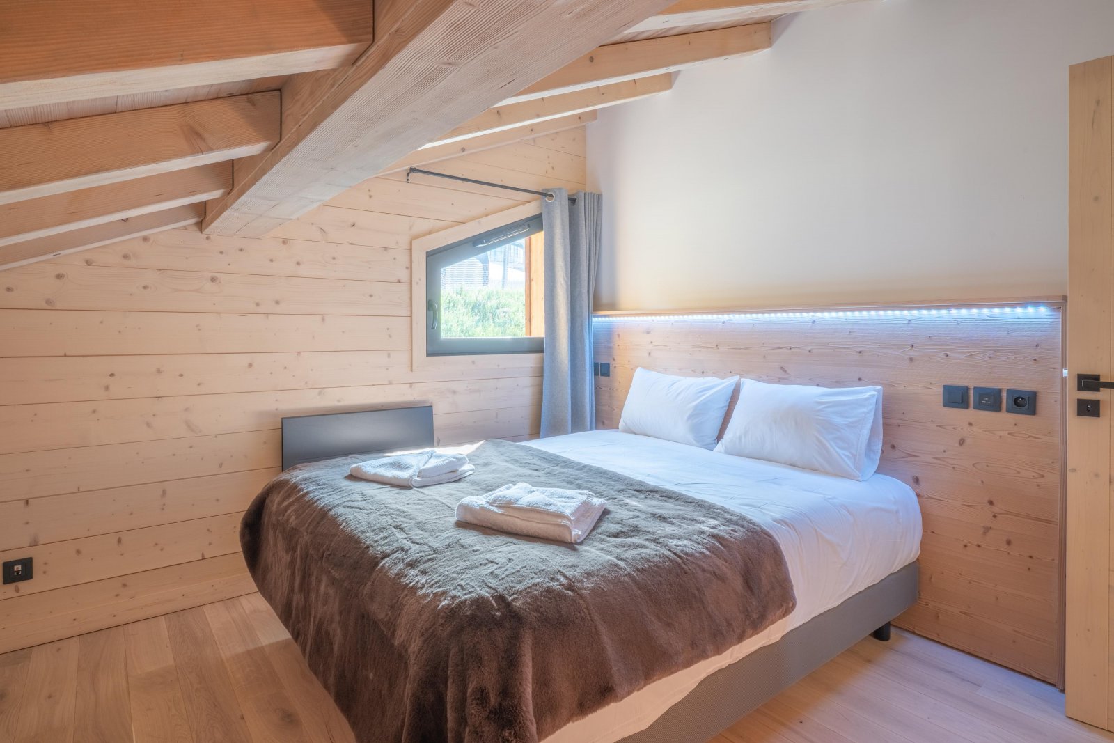 На верхнем этаже красивая лестница из массива дерева ведет на антресоль, откуда открывается вид на гостиную в стиле собора, расположенную внизу. Этот лаундж на верхнем уровне, настоящий уютный уголок, залит естественным светом и обставлен двумя большими, ультрамягкими креслами из искусственного меха и просторным угловым диваном — идеальным местом для послелыжного сна в полном комфорте.