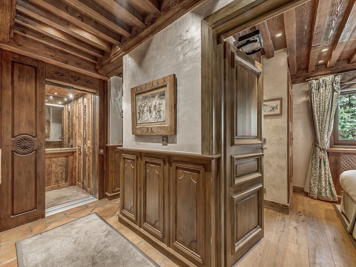Войдя внутрь, вы обнаружите прекрасное жилое пространство на четырех этажах, легко соединенных частным лифтом. Сердцем шале является очаровательная гостиная-столовая открытой планировки с традиционным каменным камином и большими окнами, из которых открывается панорамный вид на нетронутые склоны Куршевеля 1850. Интерьеры из натурального дерева и уютная мебель создают располагающую атмосферу, идеально подходящую для отдыха после дня в горах. За главной гостиной находится отдельная зона с телевизором, где можно расслабиться.