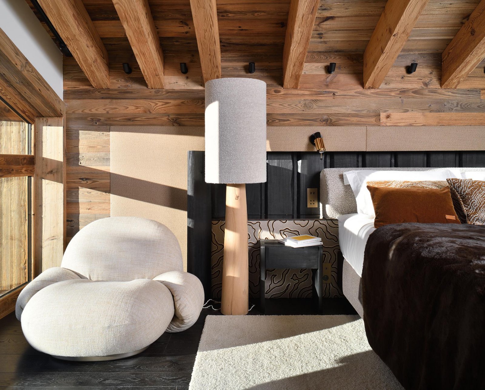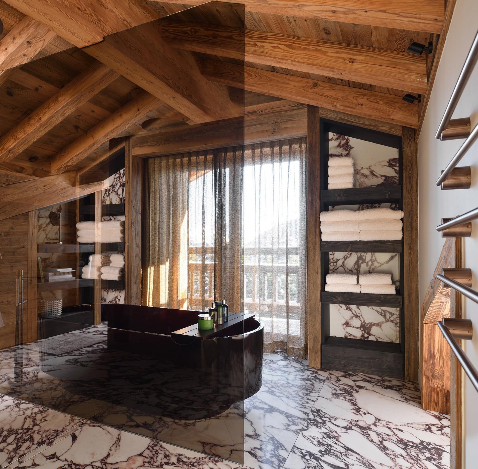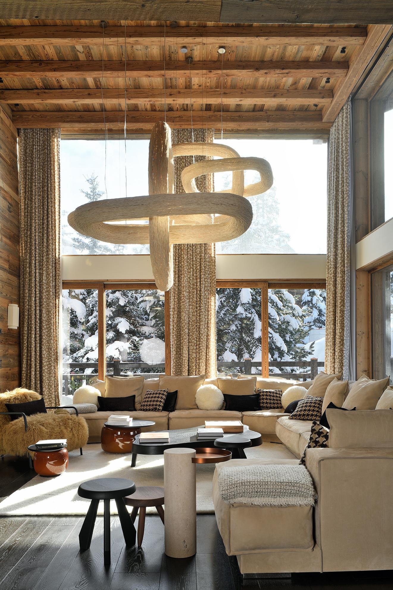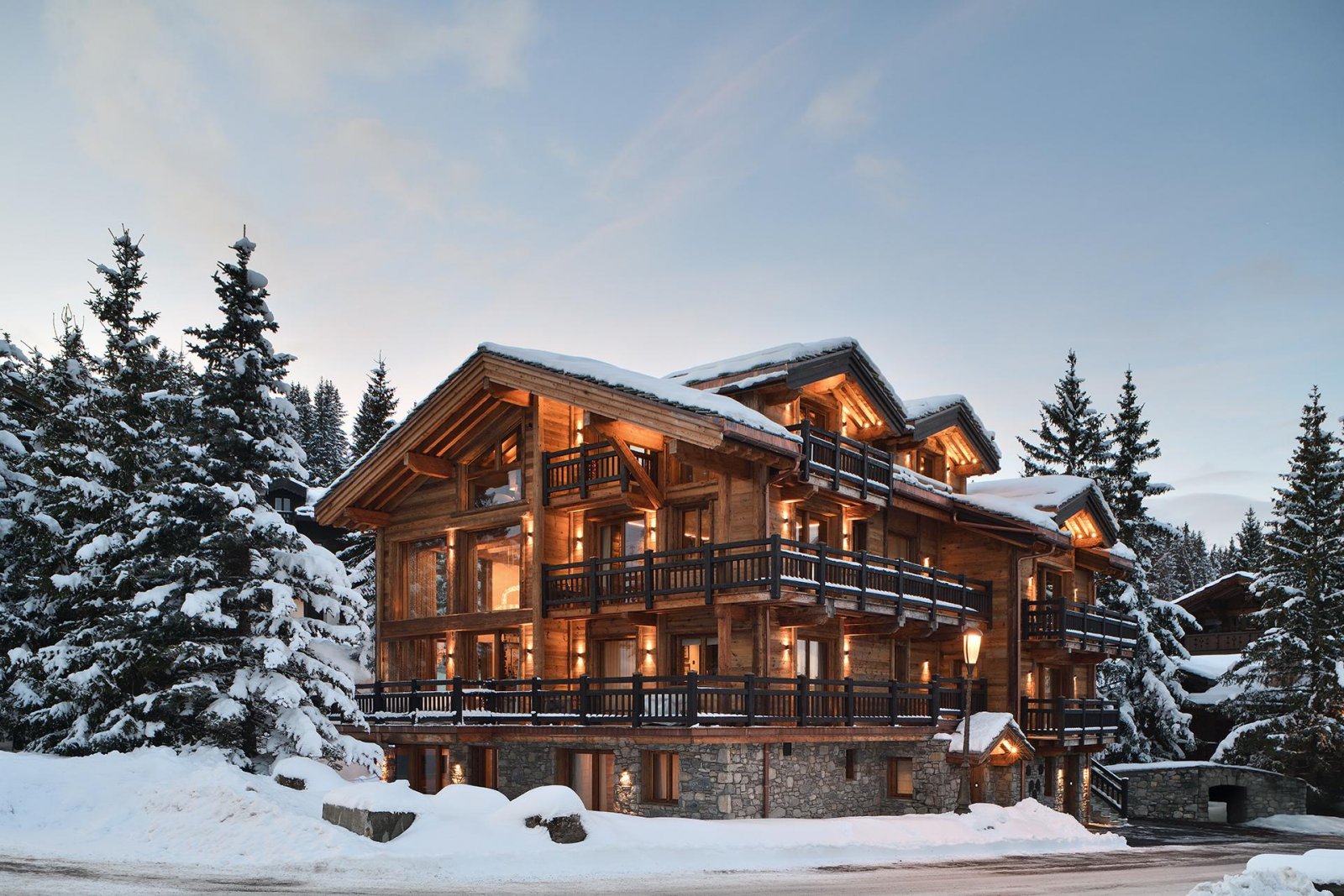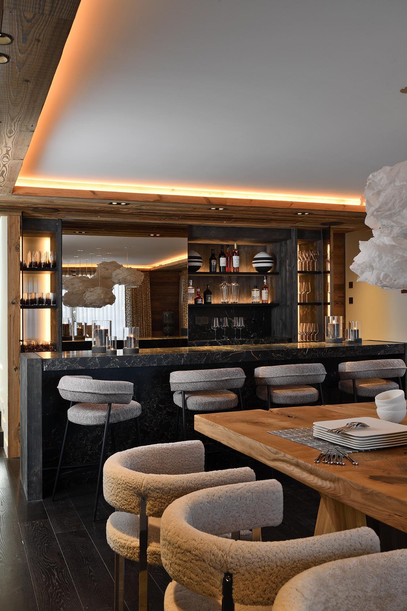 Шале расположено на пяти уровнях, между которыми курсирует лифт, и отличается просторными, наполненными светом помещениями. Натуральные материалы, индивидуальная отделка и теплые тона создают уютную, но в то же время изысканную атмосферу. Шале располагает восемью спальнями с ванными комнатами, включая роскошные ванные комнаты и гардеробные, и предназначено для проживания семей или групп друзей в условиях абсолютного комфорта и уединения.